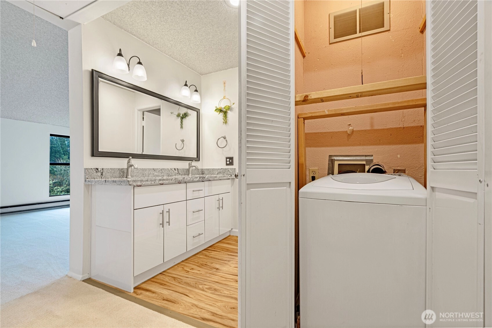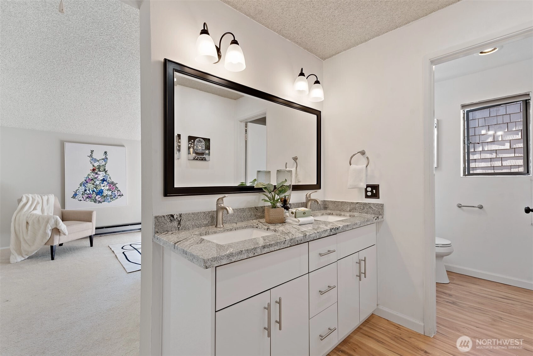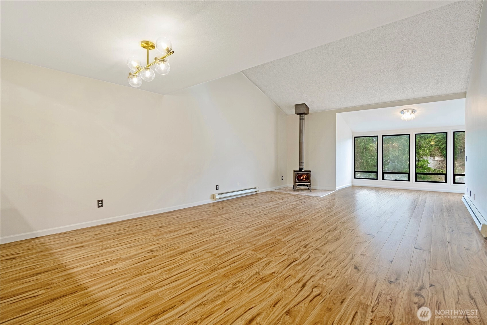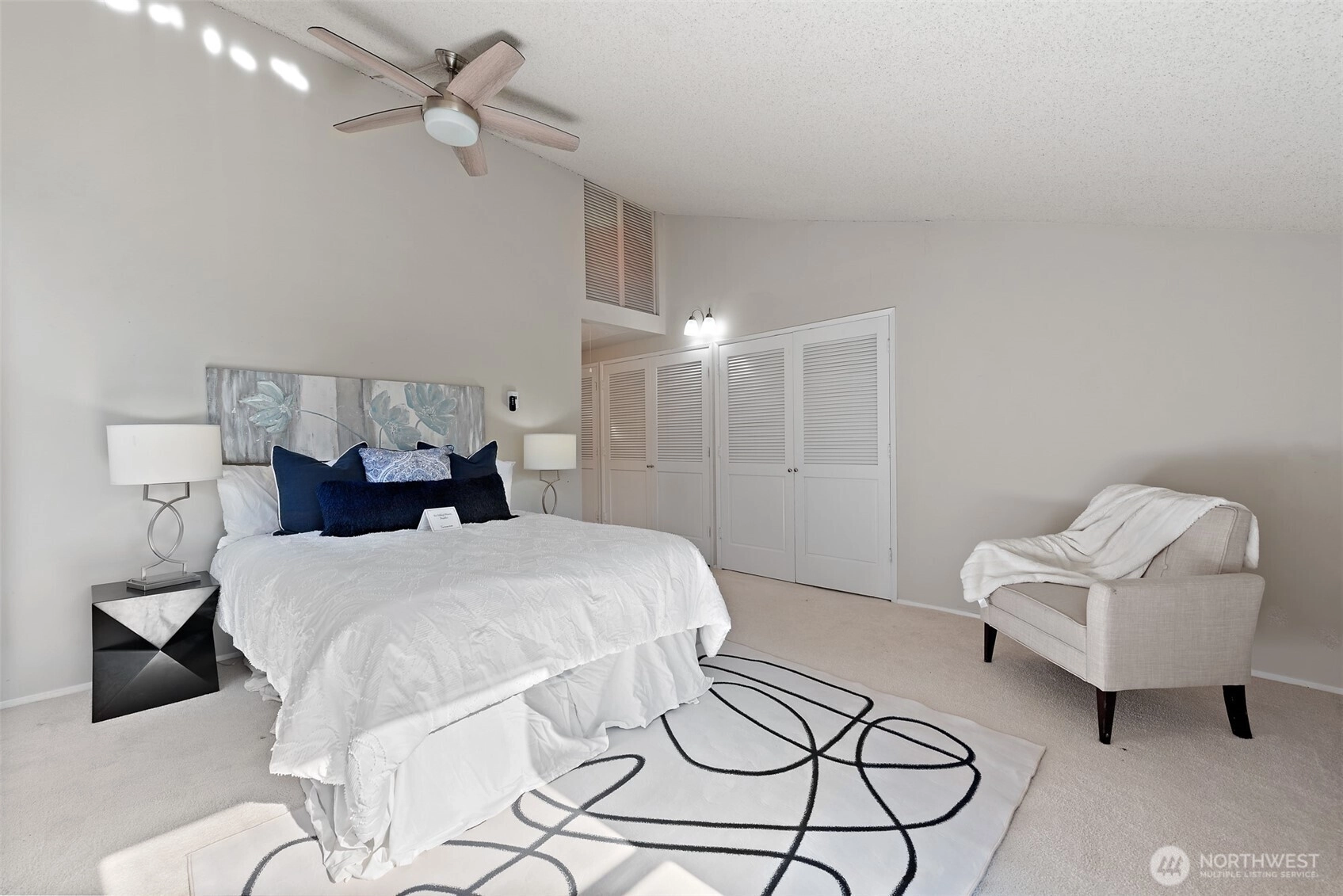 Welcome to this elegant top-floor condo with serene lake views. Vaulted ceilings, expansive windows, and a cozy wood-burning fireplace. The kitchen features granite countertops and European-style white cabinetry. Fresh interior paint, hard-surface flooring, and new luxury carpet in the bedrooms enhance the move-in-ready feel. The spacious primary suite offers multiple closets and a private en-suite bath. Large second bedroom with private balcony. Elevator access, covered parking, storage unit, and ample parking for guests. Enjoy resort-style amenities including lakes, trails, pools, clubhouse, gym, sauna, and athletic courts. Prime Eastside location minutes to Microsoft, Google, shopping, dining, and major commuter routes. No RENTAL CAP.