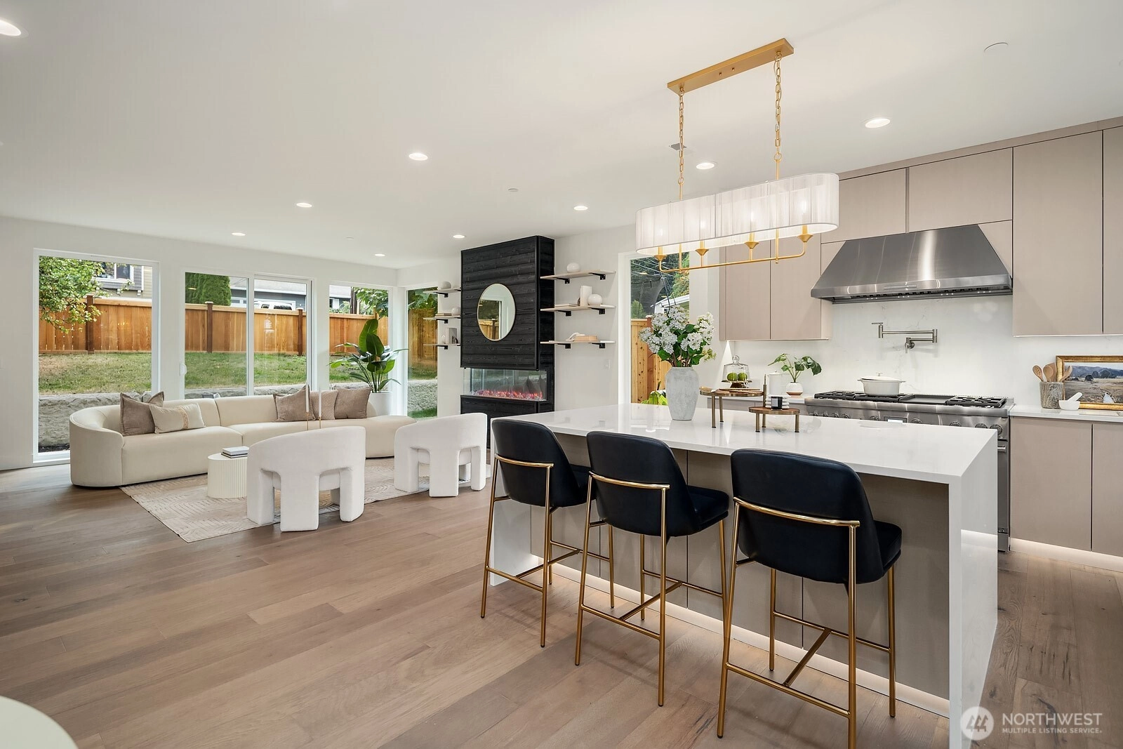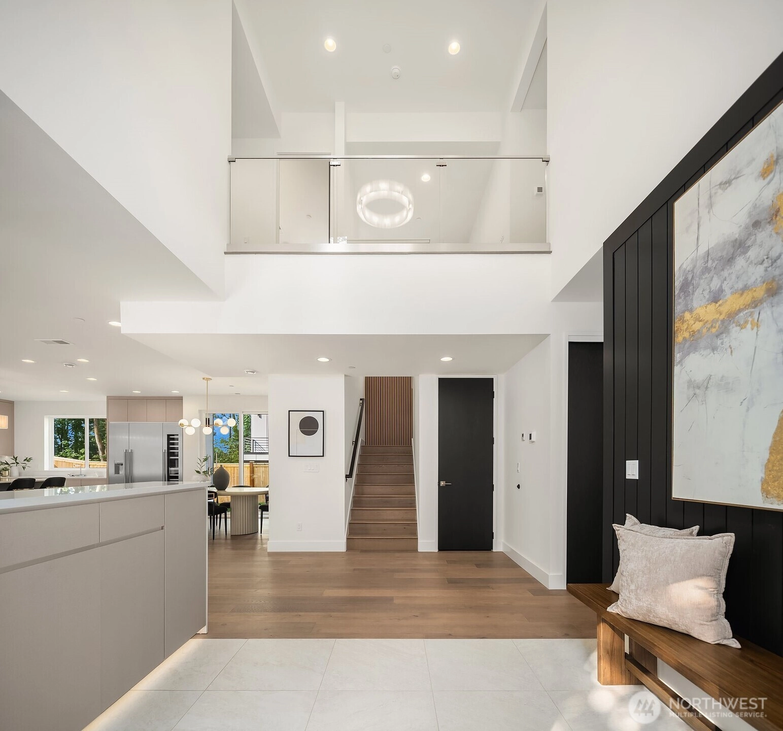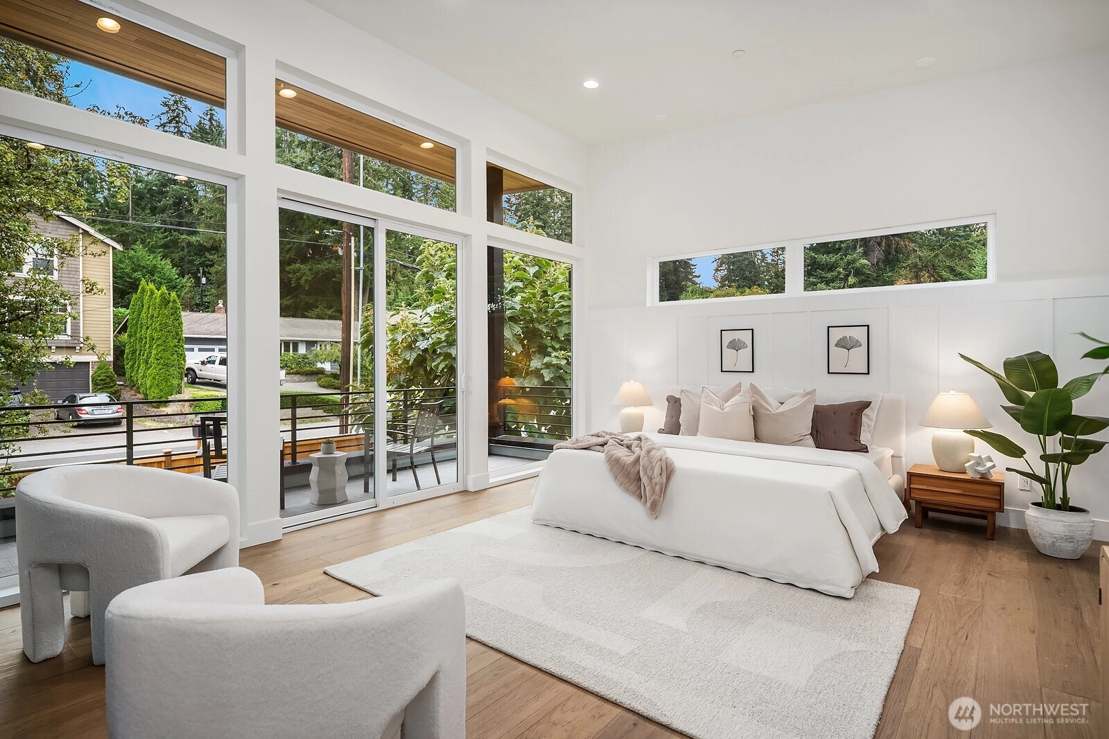 NO HOA. Scandinavian Zen–inspired 6 bed/5 bath home with quiet luxury design and impressive 9’–12’ ceilings. Expansive windows, LED lighting, and acoustic-engineered walls enhance comfort and privacy. Chef’s kitchen showcases quartz counters, custom cabinetry, Thermador S/S appliances and walk-in pantry. Main floor offers a private guest ensuite, ideal for extended living, plus a flexible office. Upstairs skybridge separates two distinct wings and connects additional bedrooms, theatre room, laundry room, and a serene primary suite with spa-like bath, private balcony, and generous walk-in closet. Enjoy a fully fenced yard, epoxy-finished garage and ERV system. Prime location near I-90, downtown Bellevue, Seattle, shopping and dining.