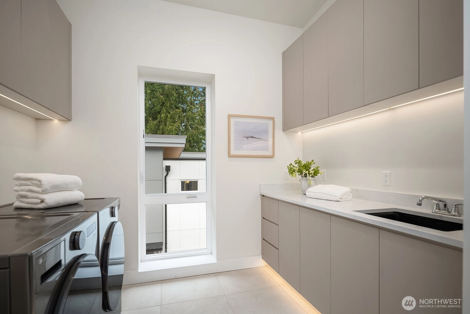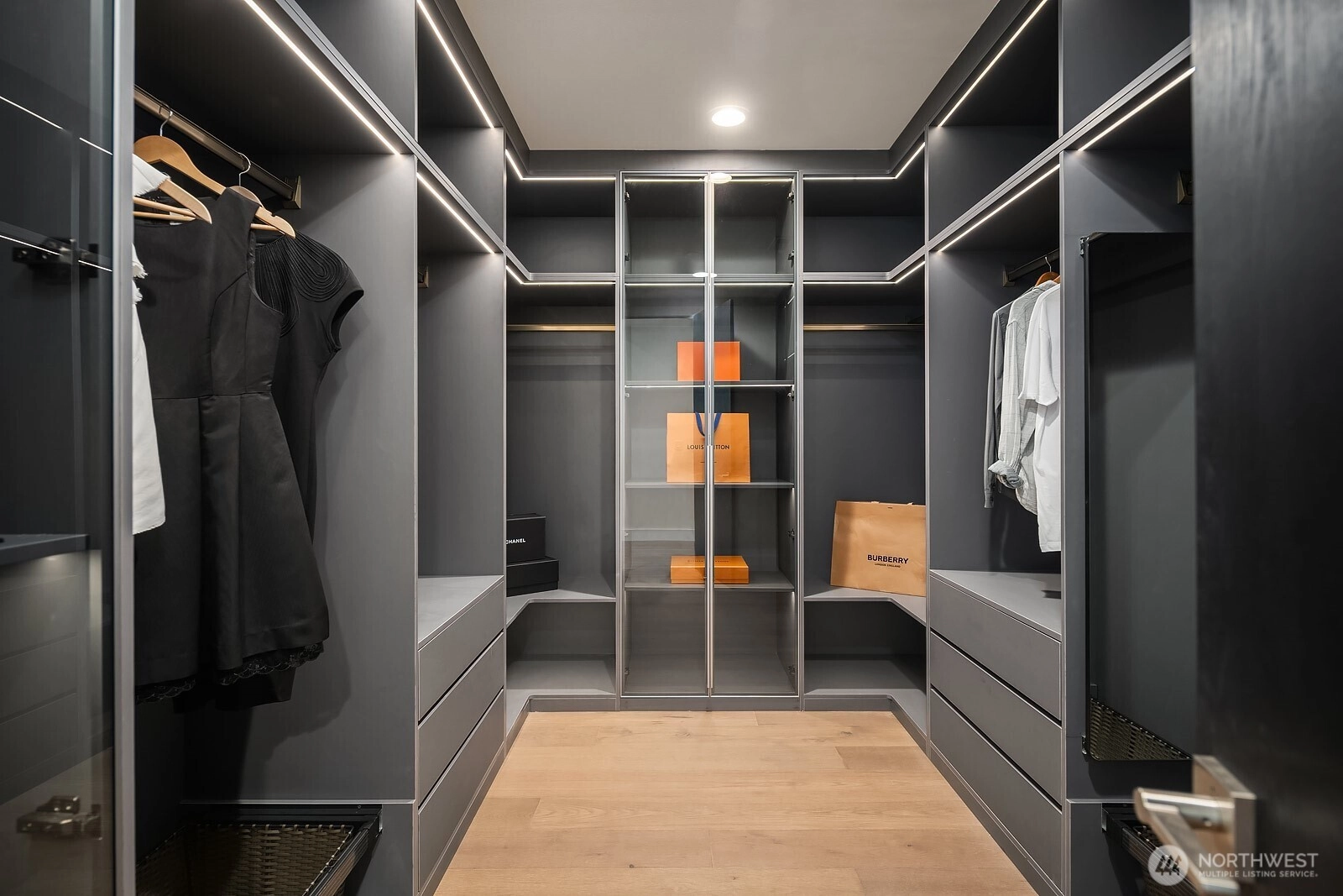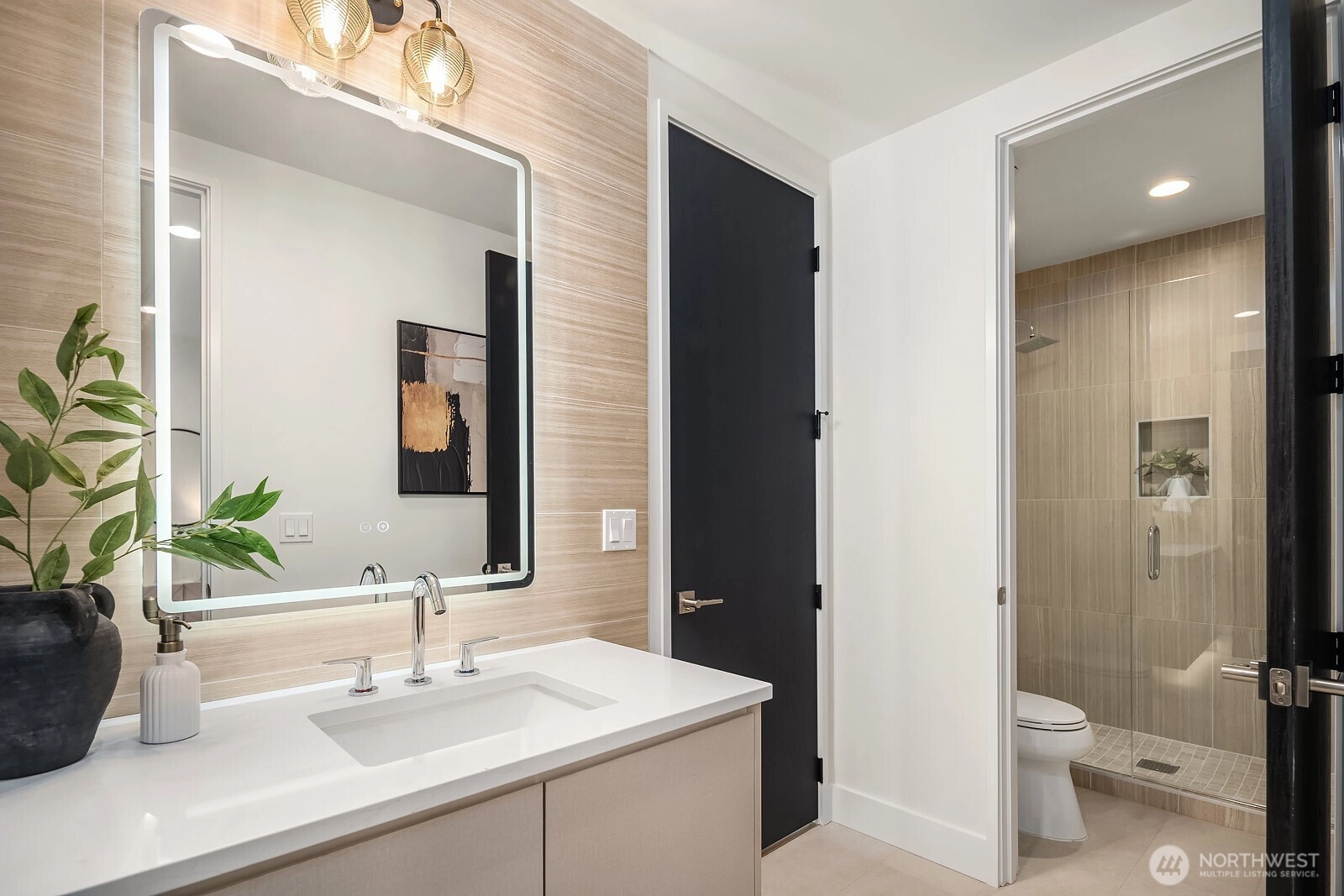 NO HOA. Scandinavian Zen–inspired 6 bed/5 bath home with quiet luxury design and impressive 9’–12’ ceilings. Expansive windows, LED lighting, and acoustic-engineered walls enhance comfort and privacy. Chef’s kitchen showcases quartz counters, custom cabinetry, Thermador S/S appliances and walk-in pantry. Main floor offers a private guest ensuite, ideal for extended living, plus a flexible office. Upstairs skybridge separates two distinct wings and connects additional bedrooms, theatre room, laundry room, and a serene primary suite with spa-like bath, private balcony, and generous walk-in closet. Enjoy a fully fenced yard, epoxy-finished garage and ERV system. Prime location near I-90, downtown Bellevue, Seattle, shopping and dining.