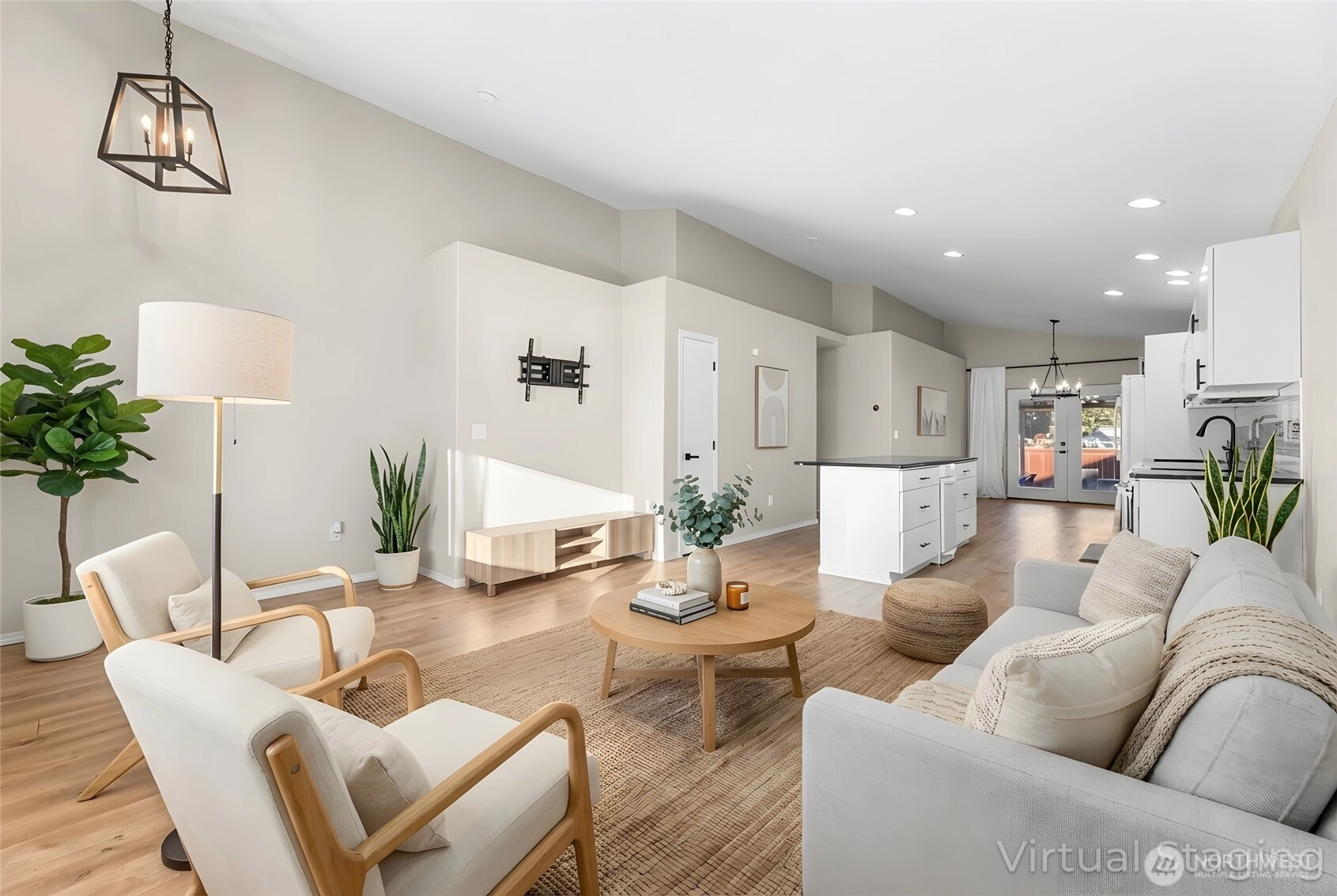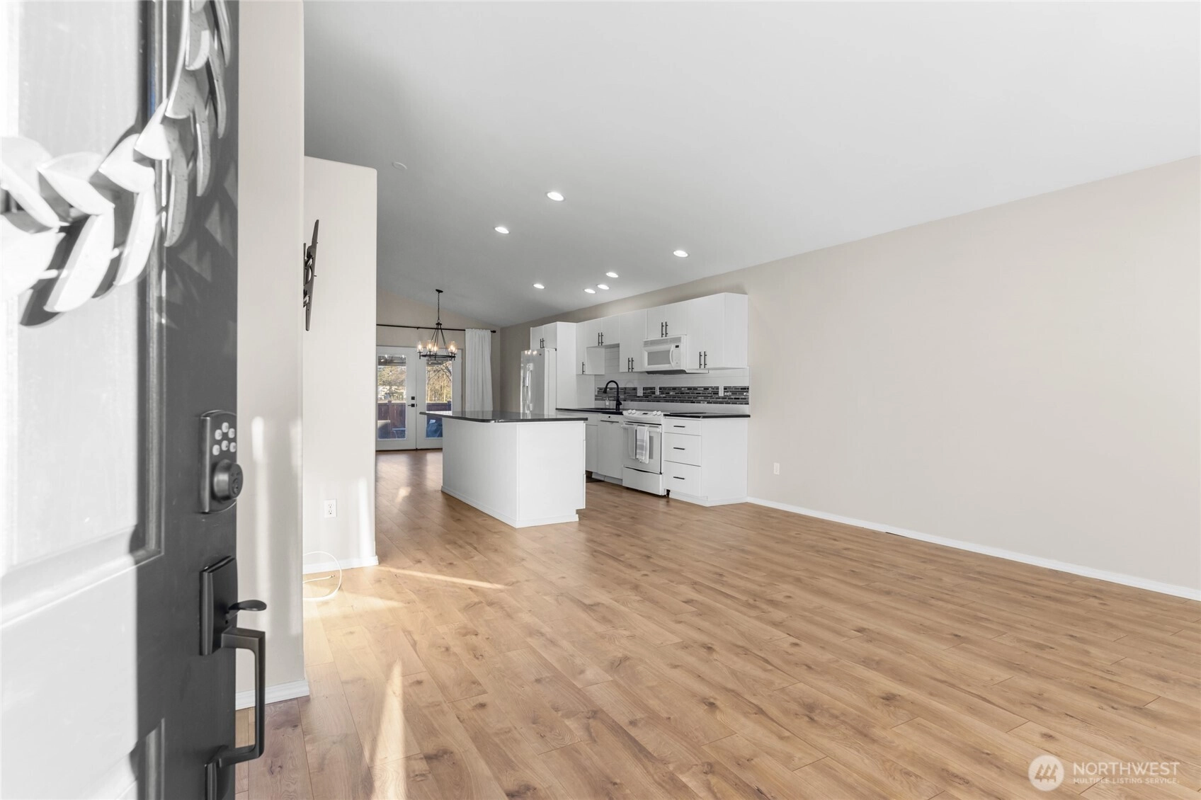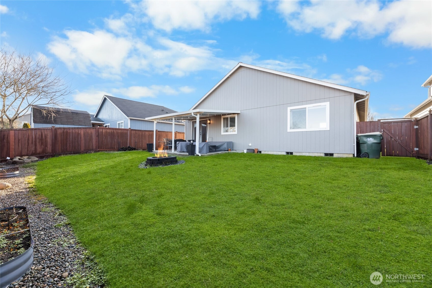 Desirable rambler on an expansive lot with modern updates throughout. The home features quartz counters, soft-close kitchen drawers, a full height tile backsplash & a convenient pantry. Vaulted ceilings & LVP flooring throughout create a bright, open floor plan. Freshly painted inside & out, including trim & doors, with new modern light fixtures & updated bathroom faucets. The primary bedroom offers a private bath & a mudroom off the garage includes the washer & dryer. The roof was replaced in 2022. French doors open to a covered patio & private backyard oasis w/no neighbor behind, a fully fenced yard, an invisible fence, fire pit, and multiple garden beds. A front yard sprinkler system adds easy upkeep. Only second owner!