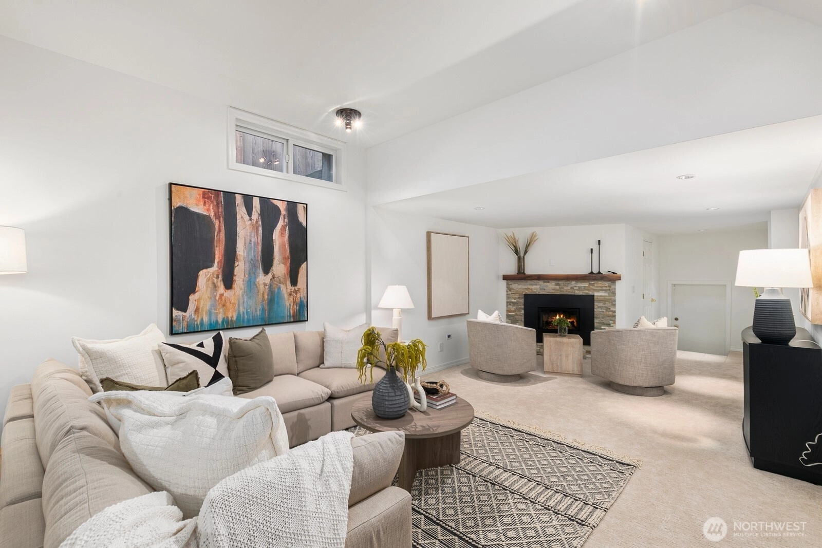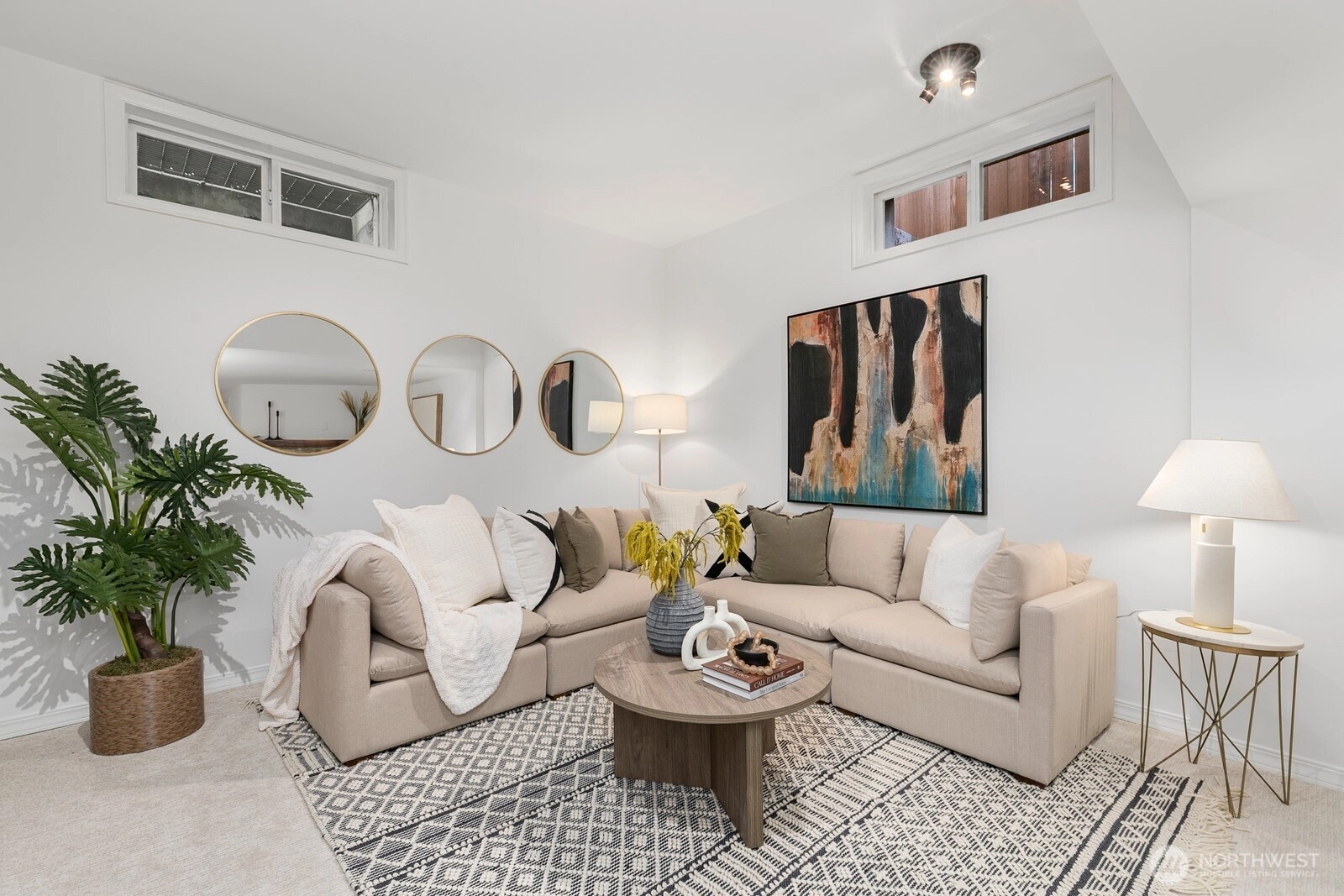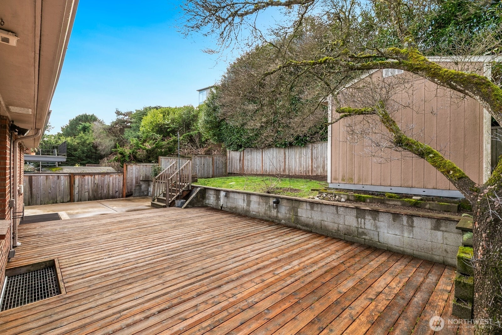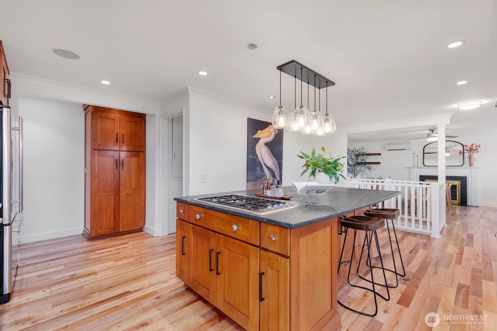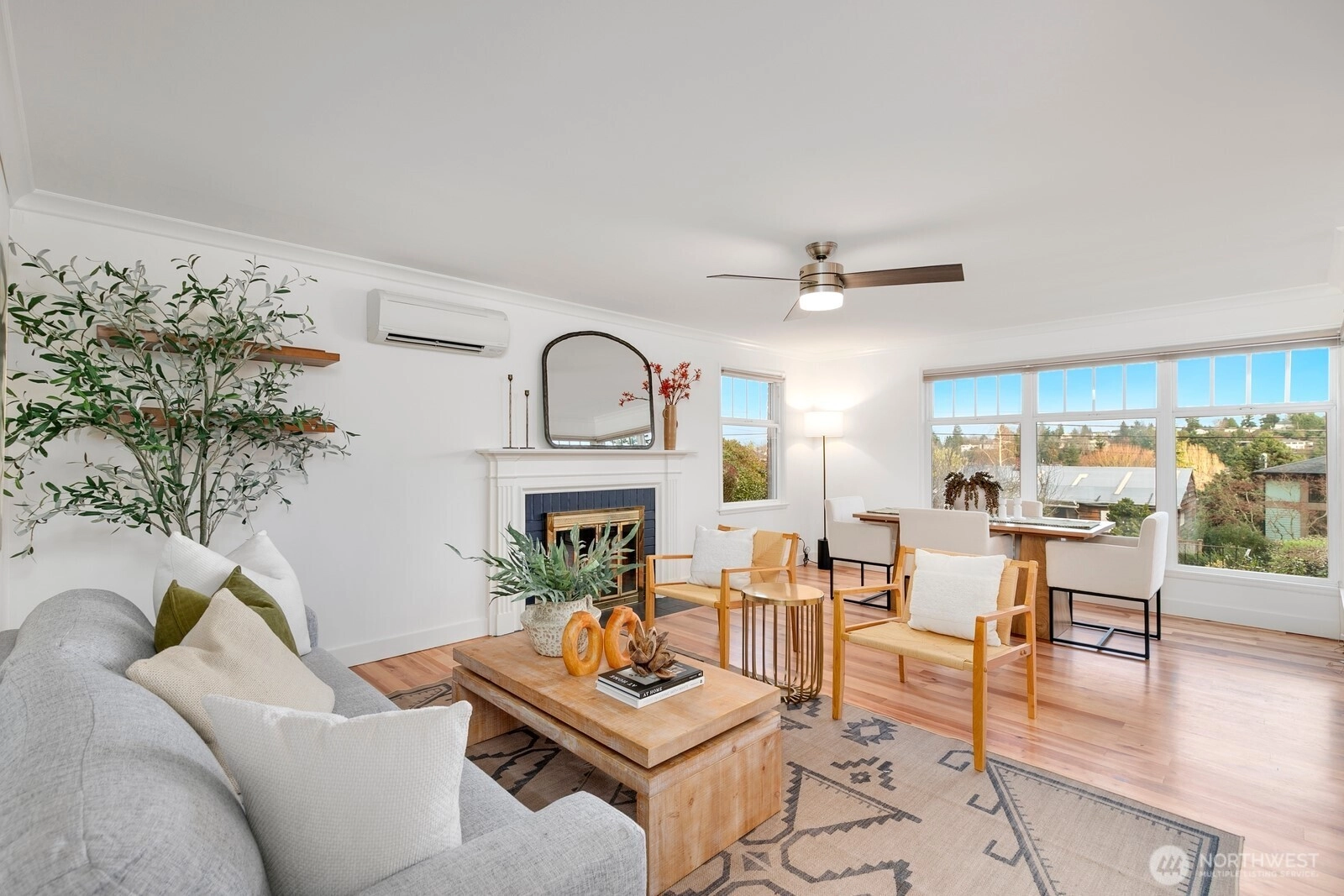 Beautiful mid-century brick home perched above the street with a thoughtfully designed circular floor plan. Stunning birch hardwood floors shine throughout the main level, leading to an updated spacious, modern kitchen with a statement island seating up to 8. A half flight up, 2 bedrooms & a full bath are privately positioned above the living spaces. The lower level features rare 9+-foot ceilings, a spacious rec room, primary bedroom, & bath. Enjoy a large, level backyard w/patio, garden space, & a bonus outbuilding ideal for a home office or extra storage. Upgrades include, new mini-splits,carpet, updated electrical, refinished hrdwd floors & interior paint. Ideal location, just minutes to the"Village", Discovery Park & downtown.