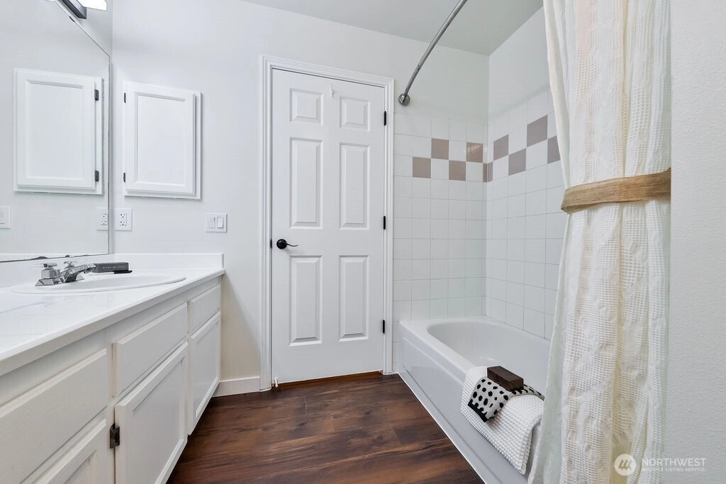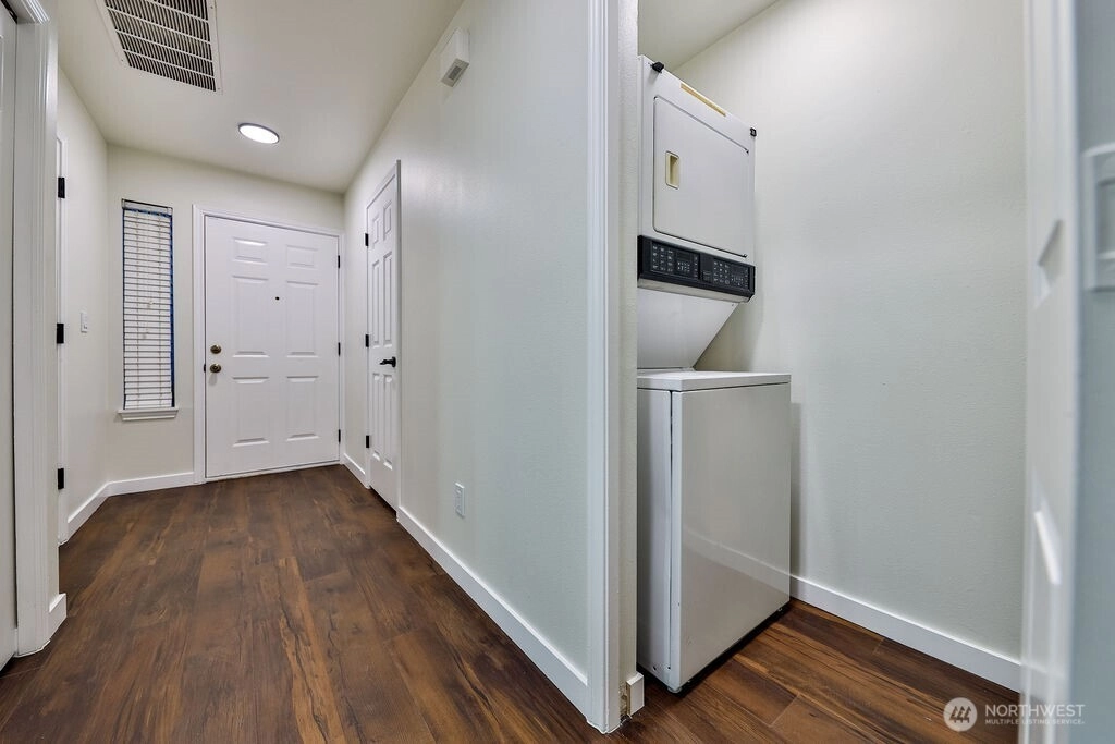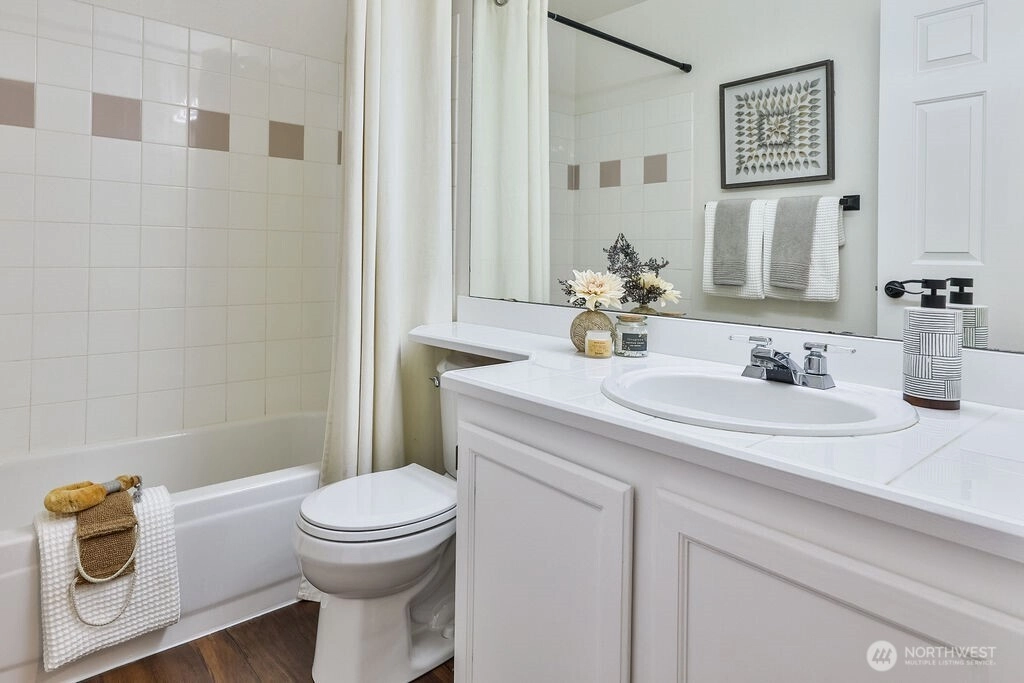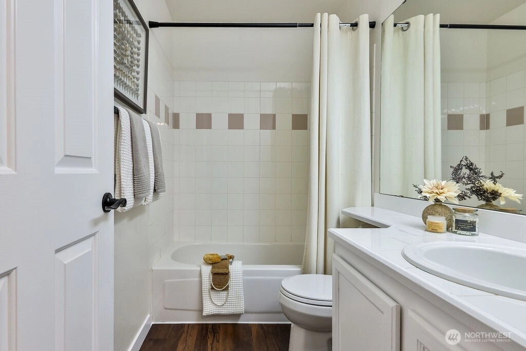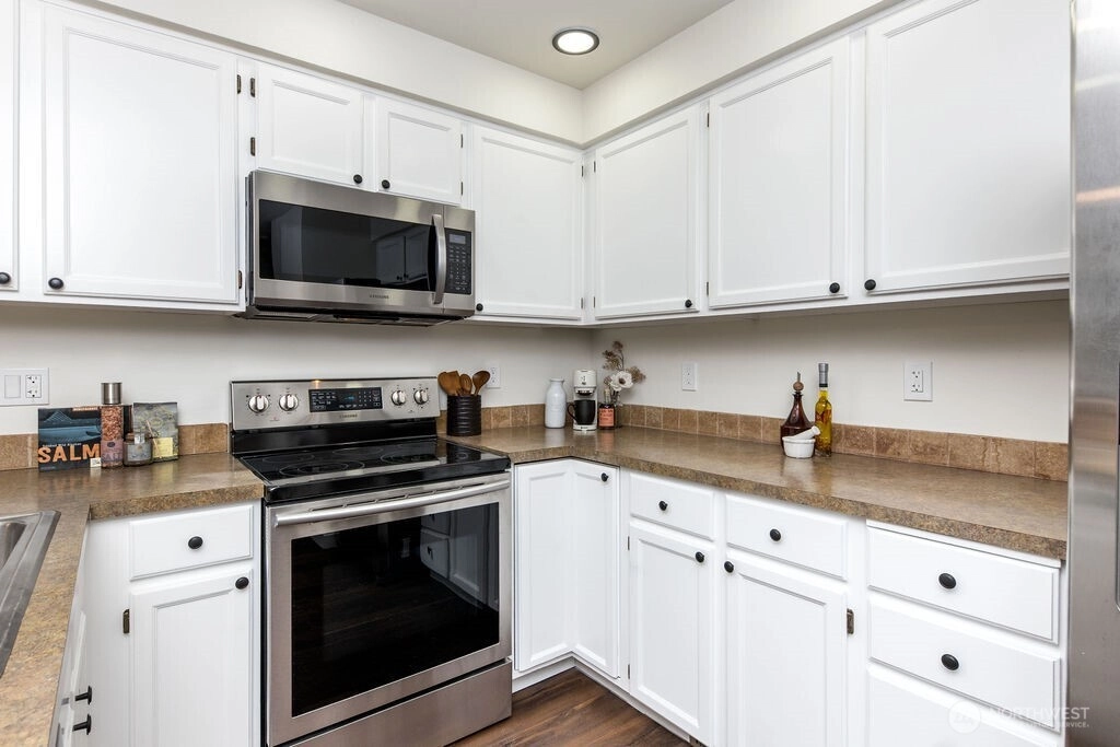Beautifully renovated 1,416 sq ft two story townhome in the desirable Le Blanc community of Kent. Features vaulted ceilings, premium LVP flooring, recessed lighting, and a cozy gas fireplace. Open concept kitchen and living with a main floor powder room and access to a peaceful backyard area. Upstairs offers a loft, two bedrooms, and two full bathrooms. Enjoy a newer roof, an attached garage with storage, low HOA dues, and close proximity to shopping, schools, freeways, and transit.