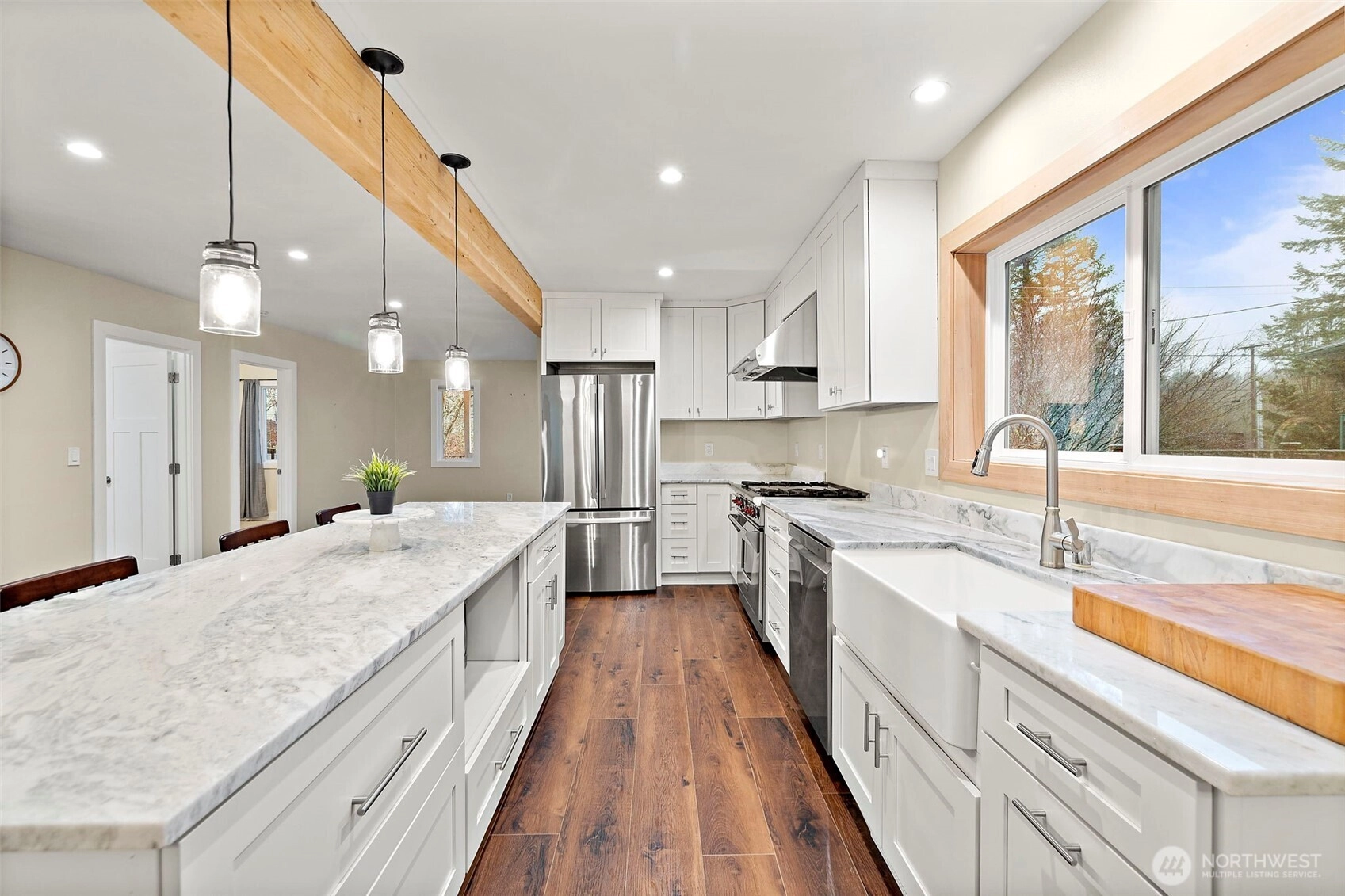 Reduced! Gorgeous remodeled Craftsman in the heart of Snoqualmie, steps from Historic Downtown shops, dining, & parks. Nearly 1,500 sq ft home offers 4 bds & 2 full ba, blending timeless charm w/modern updates. Brand-new, remodeled chef’s kitchen features a Wolf range, quartzite countertops, new cabinetry, farmhouse sink & all-new appliances—perfect for cooking & entertaining. Fresh interior paint, new LVP flooring & plush new carpet provide a bright, move-in-ready feel throughout. Enjoy outdoor living in the large, fully fenced backyard complete w/fruit trees, gardening beds, space to play, & relax. Tucked away on a private dead-end street, this home offers both tranquility & convenient access to one of Snoqualmie’s most desirable locations!