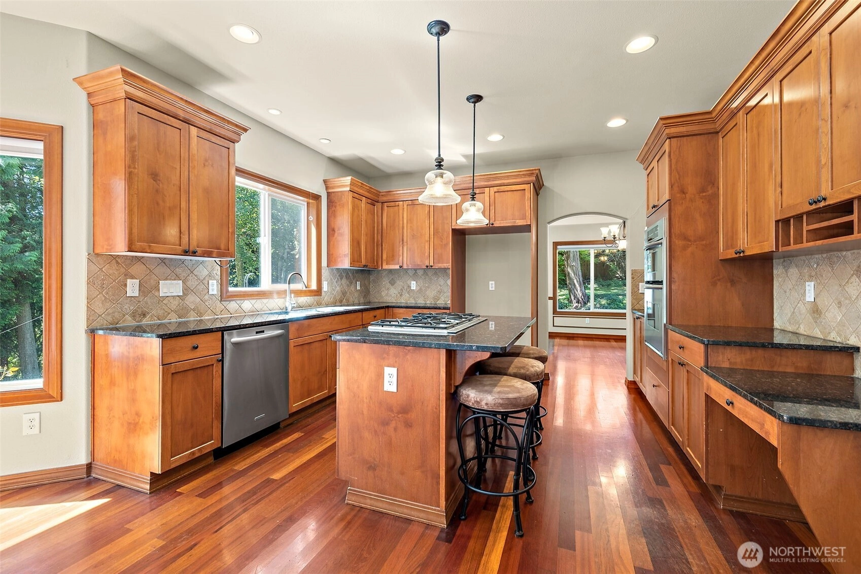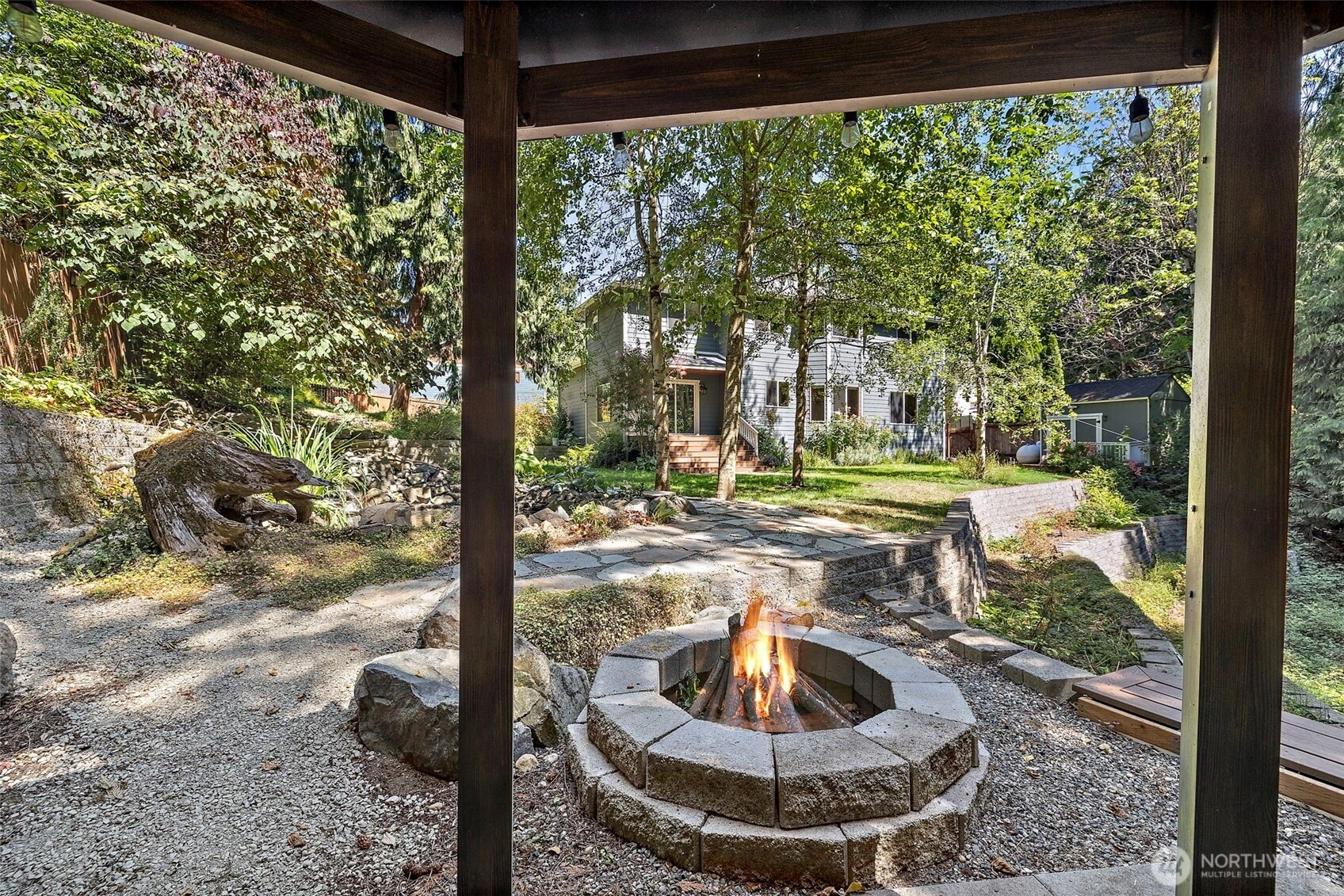 Luxury, privacy, and timeless design come together in this stunning 3,311 sq ft, 5-bedroom home on a wooded, oversized half-acre lot. A grand staircase and Brazilian cherry floors welcome you into elegant formal spaces and a spacious great room with gas fireplace and serene backyard views. The chef’s kitchen boasts custom cabinetry, slab granite, and a gas range. Main-level office adds flexibility. Upstairs, retreat to the primary suite with dual-sided fireplace, spa-like 5-piece bath, and walk-in closet. The backyard is a true sanctuary with koi pond, waterfall, gazebo, firepit, terraced gardens, and greenbelt views. Fresh paint inside and out, heat pump with A/C, generator-ready, and no HOA—this is a rare opportunity.