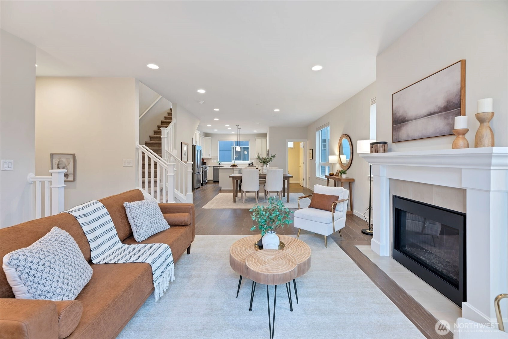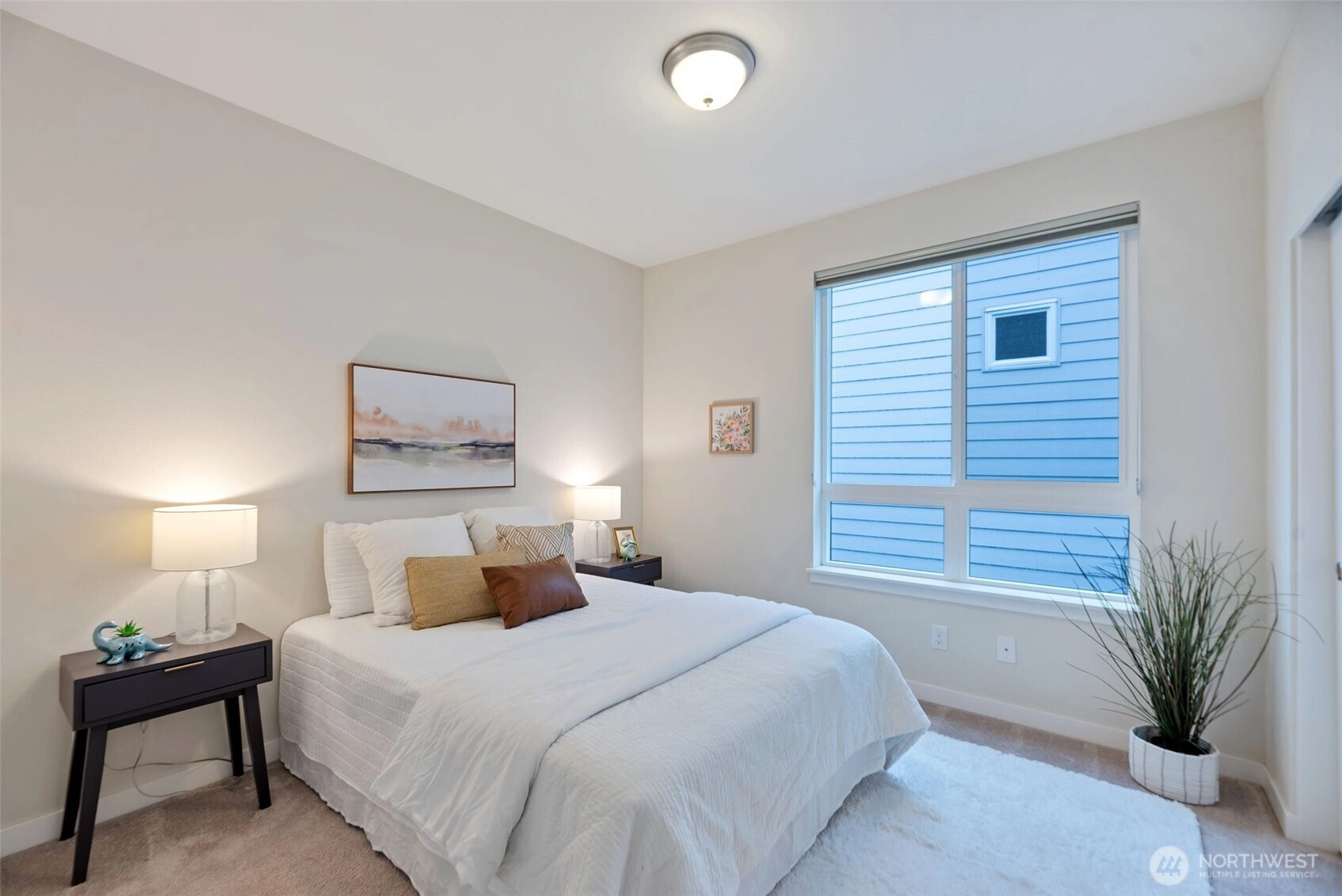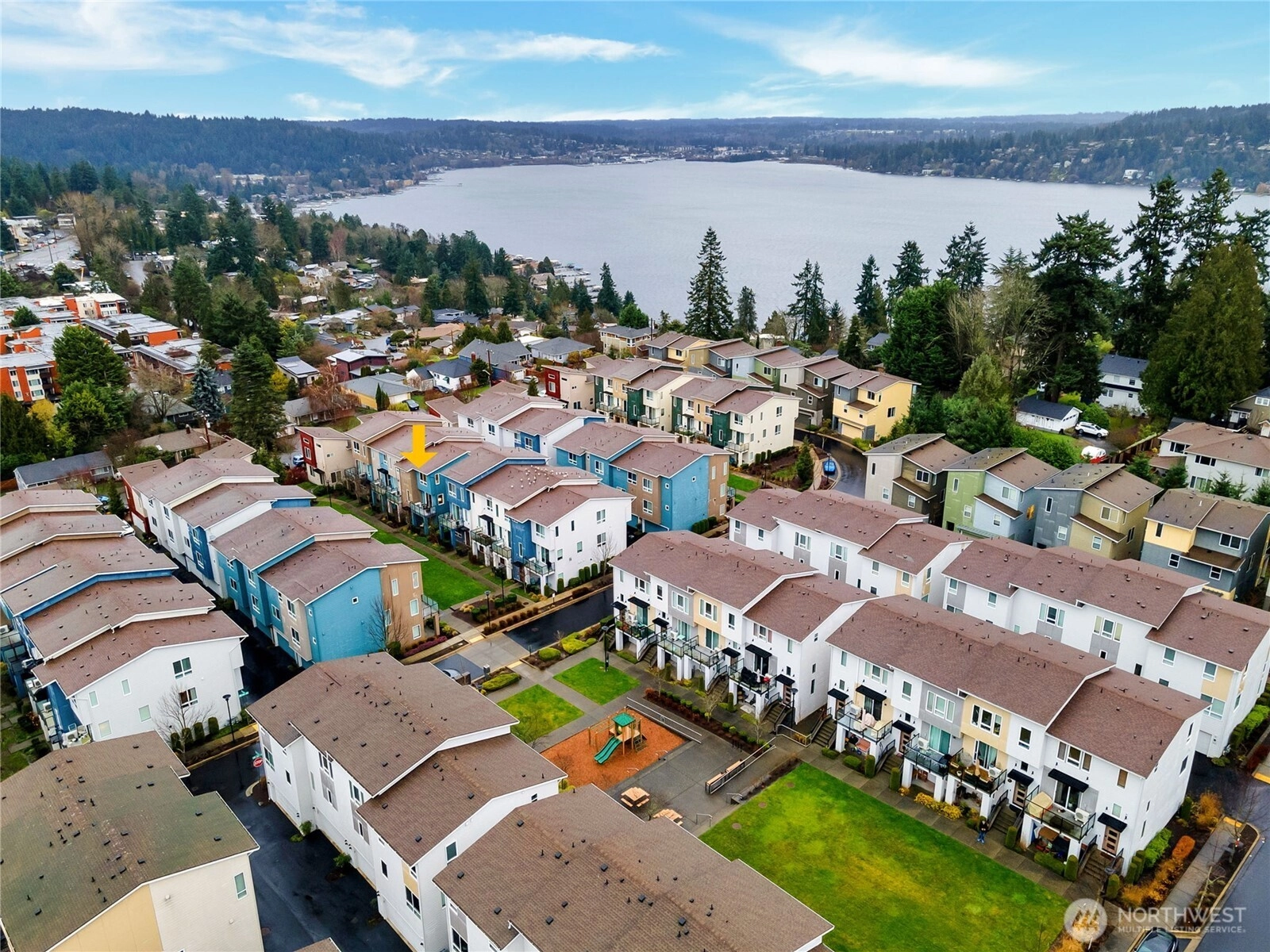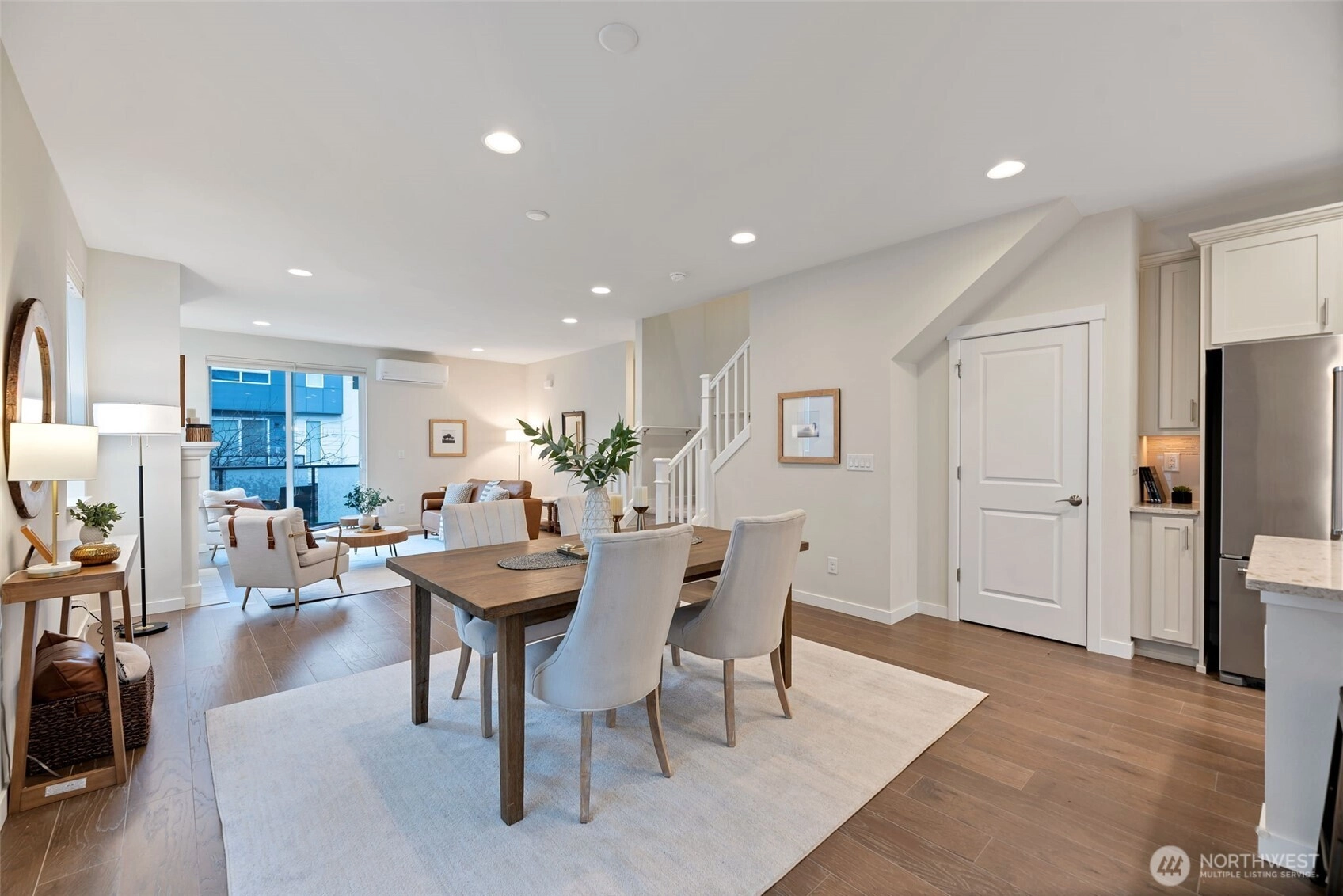 The largest floorplan among townhomes in the sought-after 12 Degrees North community, this corner unit is filled with natural light with 9-ft ceilings and oversized windows. Main level offers a 2-car garage, a laundry room w/ full-size W/D, and a private ensuite bedroom with patio—ideal for guests, in-laws, or a home office. Second level features a spacious living area with balcony, a chic kitchen with gas range and under-cabinet pull-out drawers, split mini AC, a cozy gas fireplace, and a half bath. Top floor includes a generous primary suite with a walk-in closet, plus two additional bedrooms and a full bath. Enjoy community bike racks, a playground, walking paths, and easy access to transit, shopping, dining, Burke-Gilman Trail, and I-5.