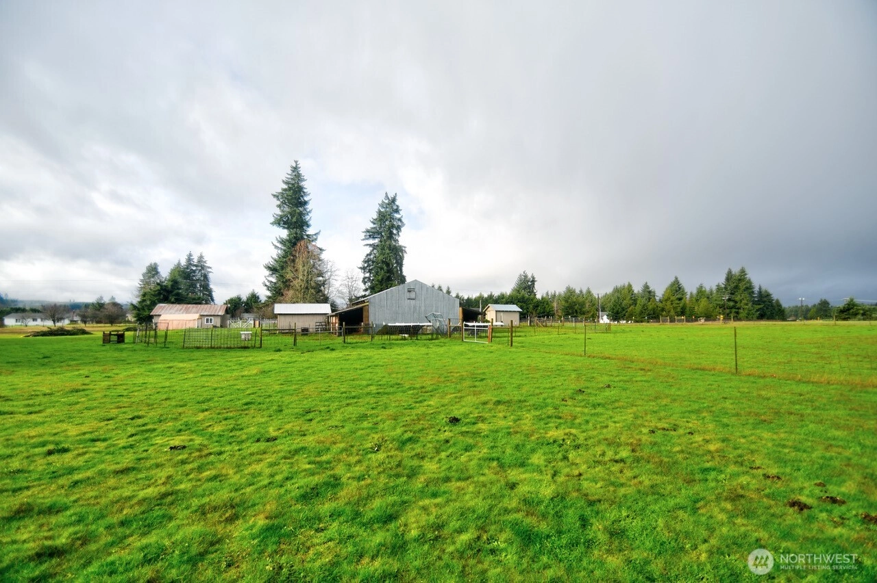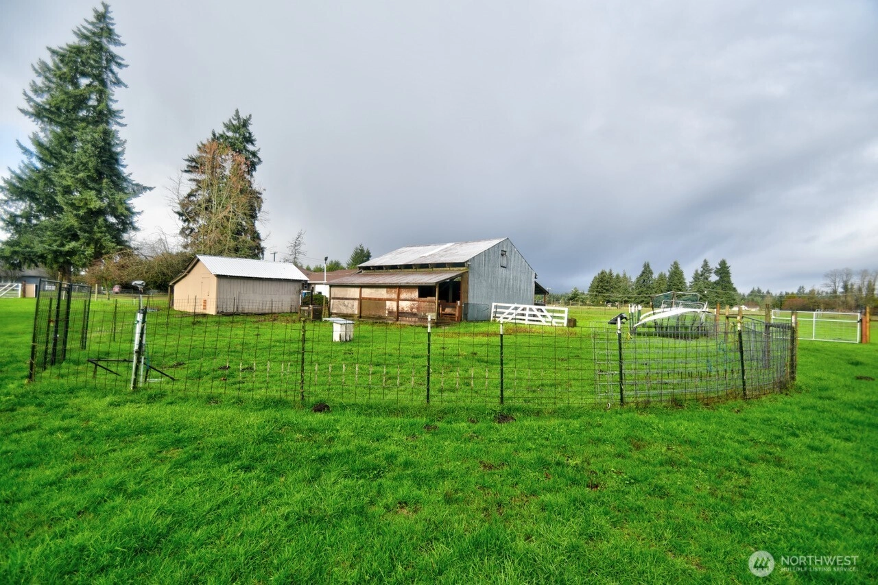 Come home to the farm featuring a large rambler with 3 bedrooms, 2 baths & a spacious, bright kitchen. Watch the hummingbirds from the charming eating space divided from the kitchen by an island counter creating a great gathering area for friends. The kitchen provides plenty of cabinet & counter space with all appliances & the washer & dryer included. The large dining room area is part of the great room that features lots of windows & a large living area with bay window. Fully fenced & ready for your animals with flat, open, usable land. Out buildings include a 1560 SF barn, an 864 building, great for a shop & 2 smaller sheds for all your storage needs. Roof was new in 2023. Backs to the high school for privacy and just a quick hop to I-5 for either north or south commute.