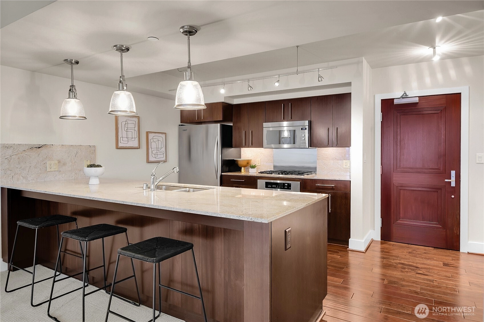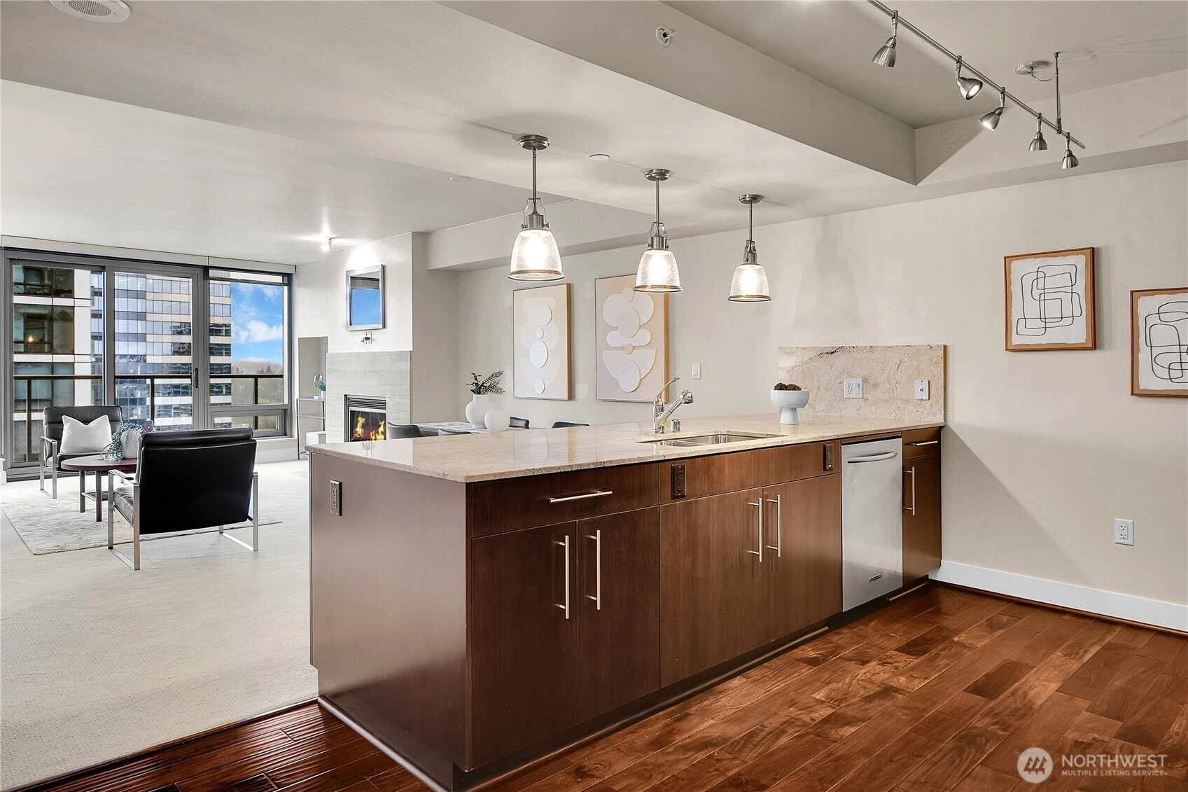 Luxury Downtown Bellevue Highrise in the center of Downtown Bellevue. ONE LINCOLN TOWER is known for placing the utmost importance on safety and security and residents enjoy professional and dependable concierge services. Condo #2103 is extra large at 1,024 square feet (most OLT 1 bedrooms are 757 sf) + condo #2103 has an OFFICE which has been updated with incredible built-ins. Brand new carpeting Dec 2025. The deck is extra long with a sunny southern exposure + great views of Lake Washington! SECURE PARKING GARAGE SPACE C68 on P3. BIG STORAGE UNIT 119 on P4. 4th floor full-size heated swimming pool, relaxing hot tub and a luxury gym. An easy walk to the best shopping, restaurants and bars + multiple transportation options within steps.