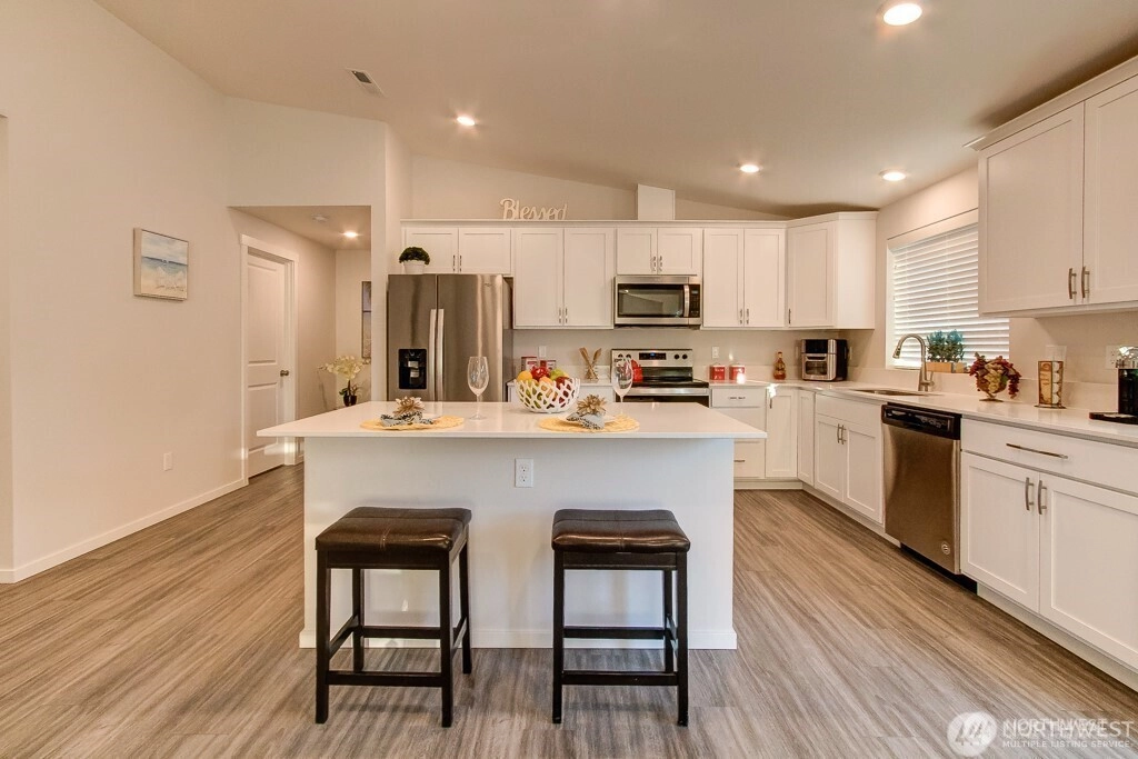 Enjoy one level newer 3 bed, 1.75 bath rambler in Manson with custom floor plan located within walking distance to Manson amenities, schools, lake access, parking parks and dining options including variety of wineries nearby. The home's interior features quartz counters in the kitchen and bathrooms, white cabinets and stainless steel appliance package in the kitchen. Primary bedroom is large with huge walk-in closet and double sinks and tiled shower in master bathroom. Kitchen and great room face out towards the large fully fenced back yard with automatic sprinkler system, partial lake view and great mountain view. There is a large space on one side of the house for park RV or boat, 400 amp electrical, irrigation water. Come to see!!!