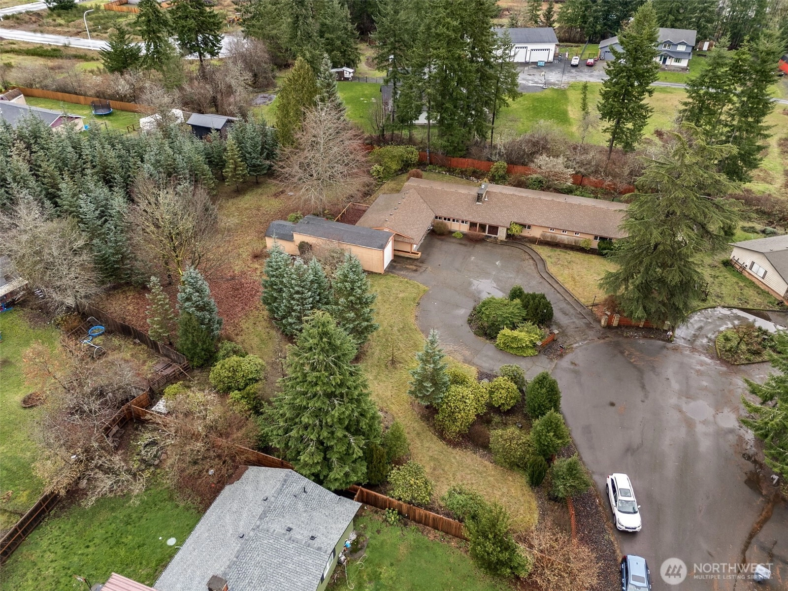 Set on a beautifully landscaped, level 1.26-acre lot, this well-maintained rambler offers privacy, space, & comfortable living. Double front doors open to a formal entry & spacious living room featuring gas fireplace & built-in cabinetry. Kitchen provides abundant counter space & storage, while the dining area opens to a large patio—ideal for entertaining or relaxing. Laundry room & convenient half bath complete the main level. Just two steps up, the raised portion of the home features a cozy family room, a spacious primary bedroom with ensuite bath, & access to a private deck, plus three additional bedrooms & a full bath. An attached two-car garage & a large shop offer excellent storage & workspace, rounding out this inviting property.