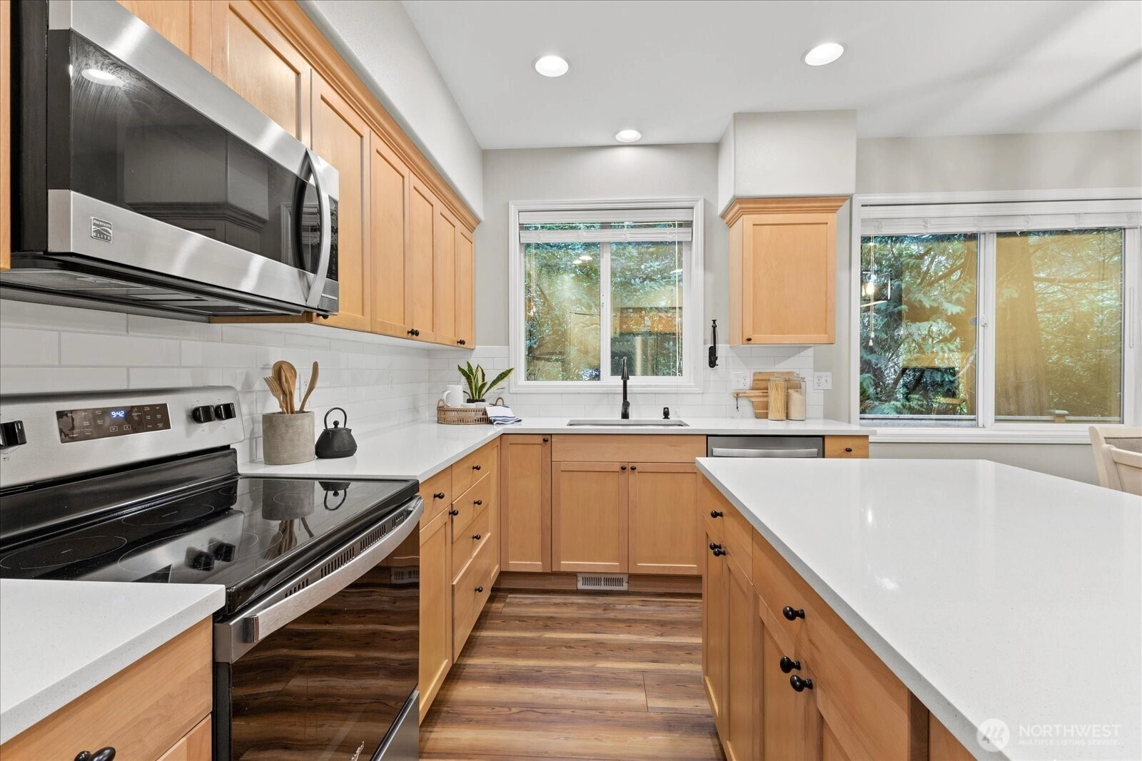 Rare 2 bed, 2.5 bath townhome that lives like a single-family home! Tucked into the serene Shiloh Village community, this 1,451 sq ft home welcomes you w/ vaulted ceilings and an open, inviting living space. Any chef would love this kitchen w/ new appliances & walk-in pantry! Enjoy the luxury of LVP flooring, cozy gas burning fireplace, AC in any season. Parking is no problem w/ a 2 car garage & 2 additional parking spots out front, & plenty of guest parking. Two bedrooms upstairs including a Primary Suite w/ double sinks, skylight & walk in closet. Outside, a fenced & tree-lined backyard offers privacy and a charming covered deck for relaxation. Healthy HOA that covers everything outside including paint, doors, roof, & all yard work!