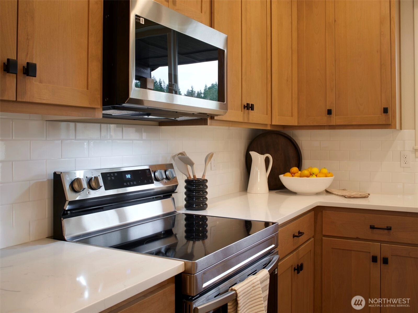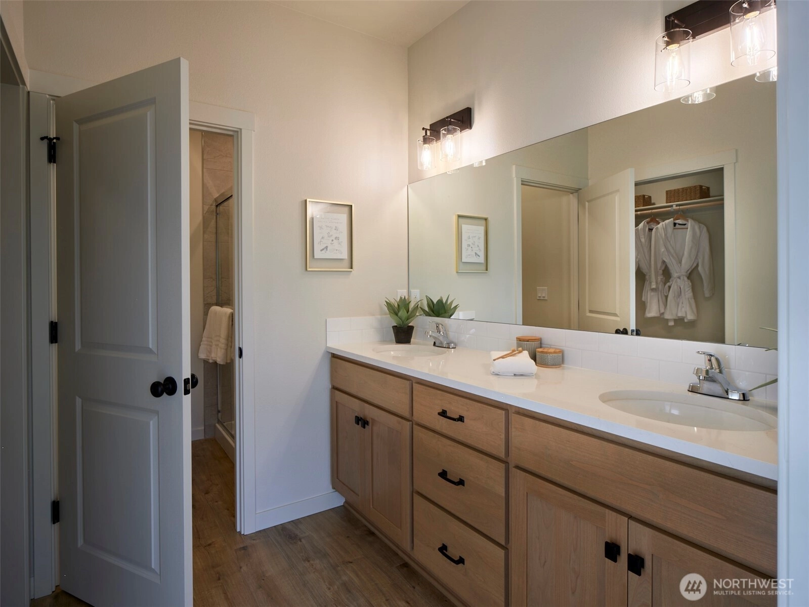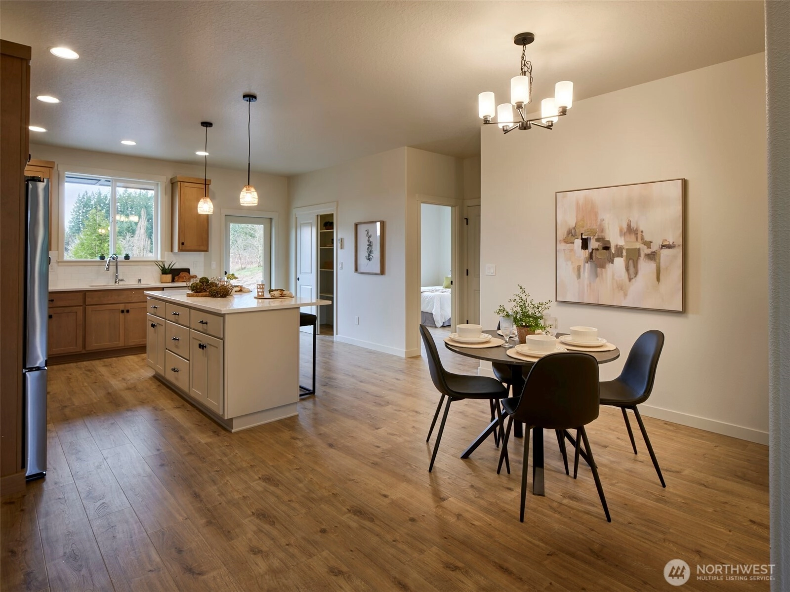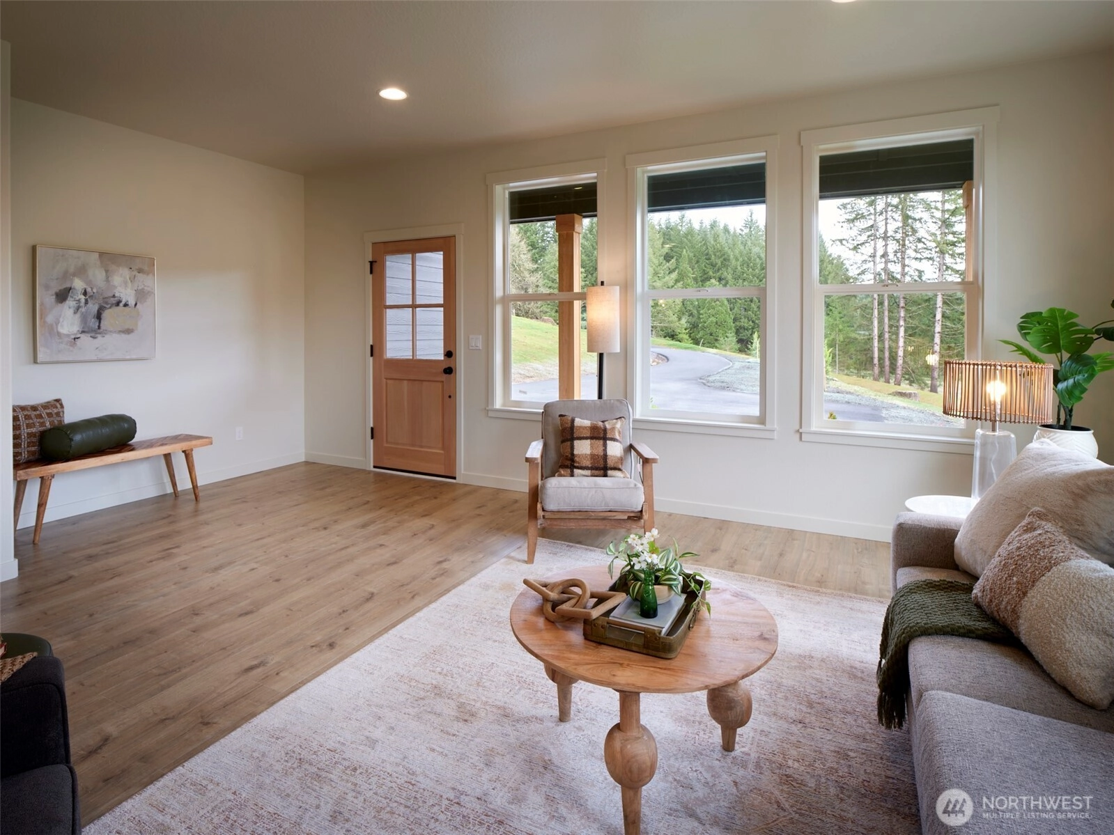 A stunner, this BRAND NEW home is sure to impress! Light filled this home is move-in ready featuring open living spaces w/luxury vinyl flooring throughout 9' ceilings & premium finishes. Kitchen is a dream w/tile backsplash, quartz counters, soft-close cabinets,pantry, & full SS appliance package. Primary Bed features attached bath w/double sinks, quartz cntrs, tiled & glass shower & WI closet. Two charming bedrooms opposite of Primary. Laundry rm w/built-in cabs & sink. Finished garage w/dr opener. Covered back-patio. Paved driveway makes for a super-clean entry and place to park your vehicles or RV. Just 4 miles to I5- what a dream to get to live in the country w/ultimate access +convenience! Warranty provided. Be the first to live here!