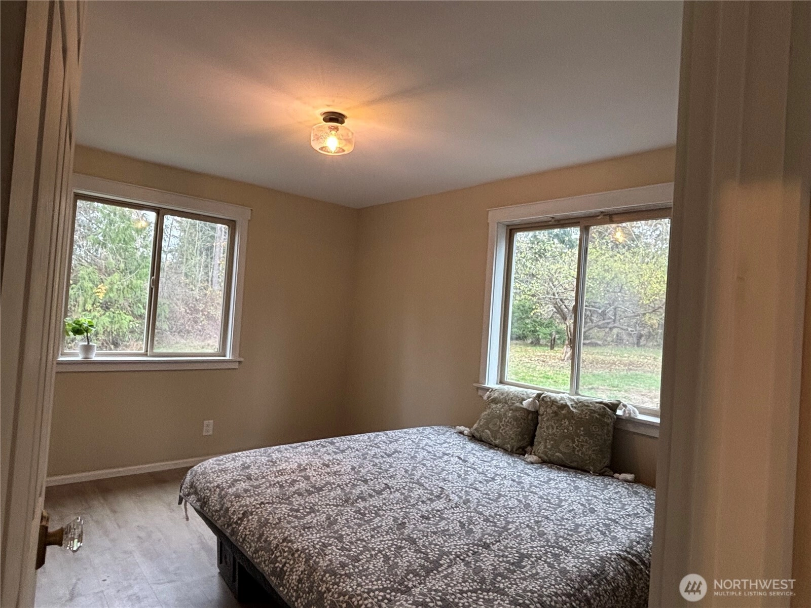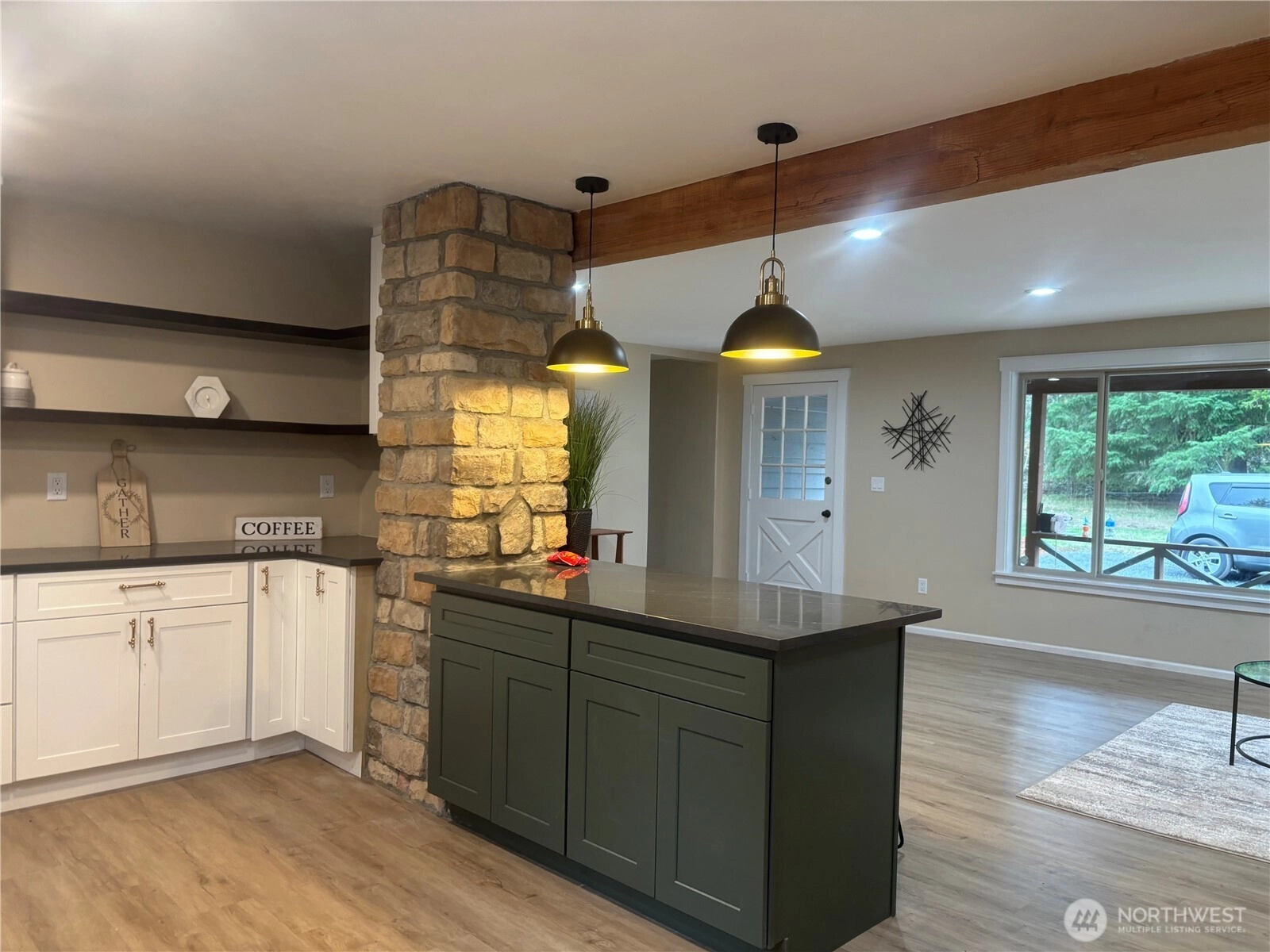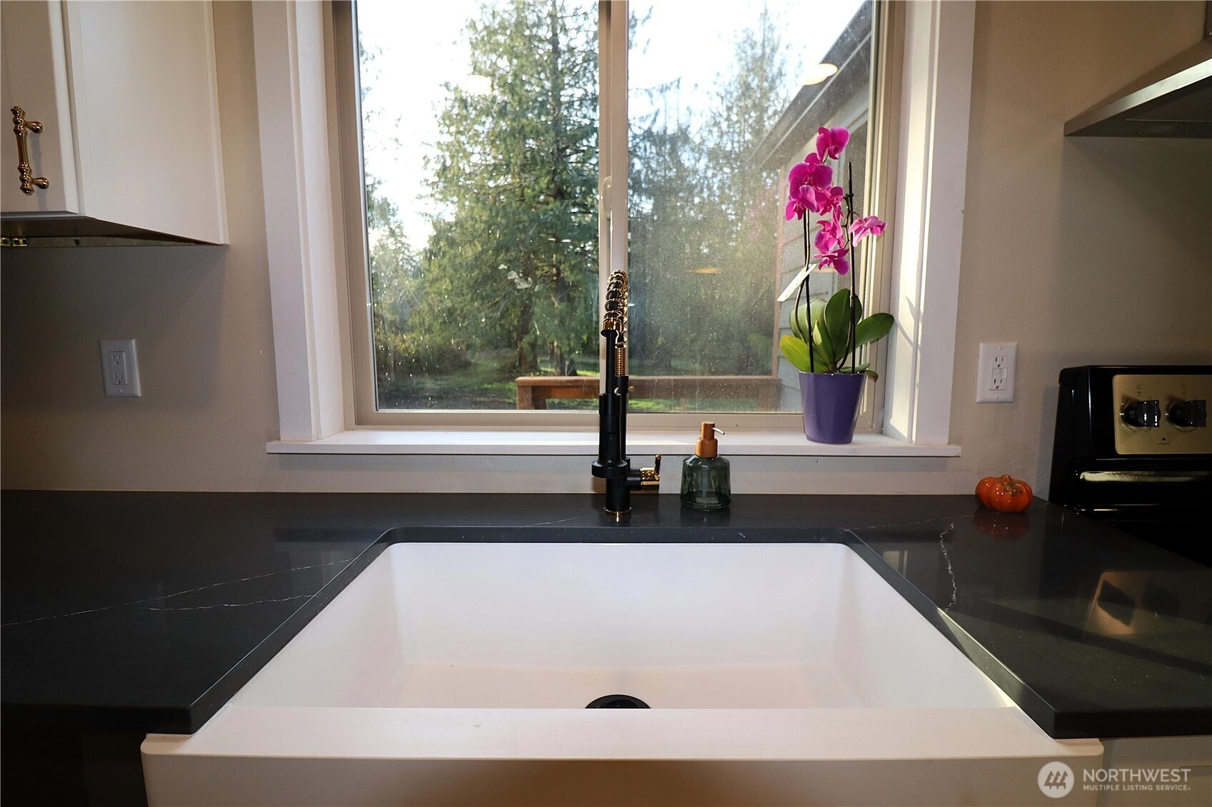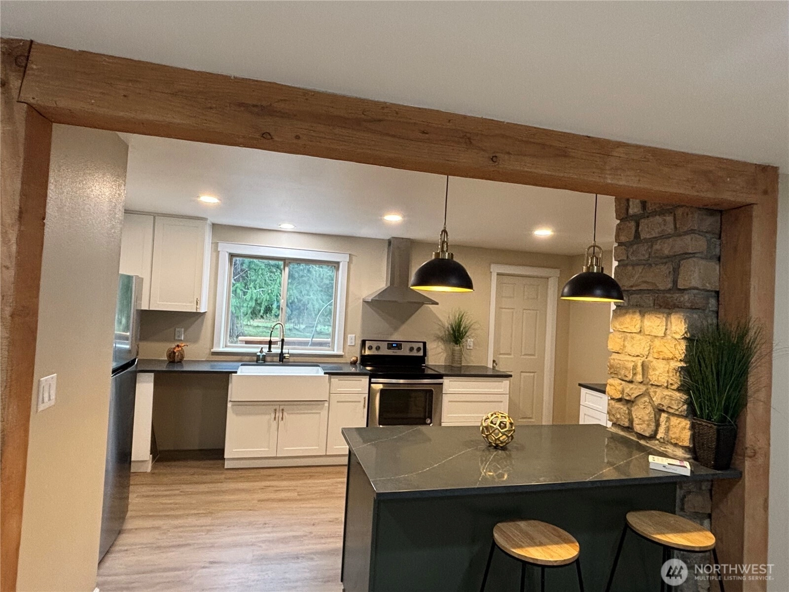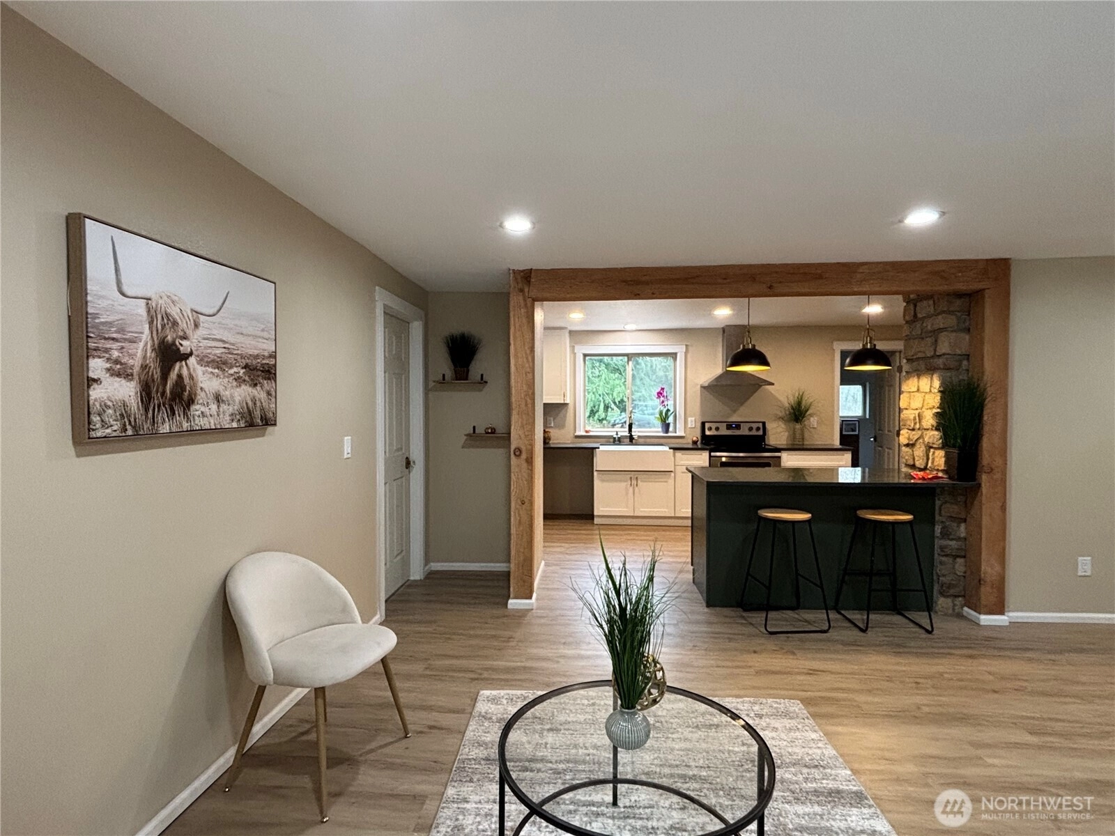 Beautifully updated craftsman house on nearly 10 acres with detached garage, new roof, RV hook up, and original barn. Upon entry, you're welcomed into an open living space with a stunning exposed beam that appears throughout the home. The kitchen boasts black quartz countertops with white veining, stainless steel appliances, and the star of the show, a quartz farmhouse sink. Off the kitchen is a large utility room with washer and dryer plugs and exterior access to your extended deck. In the primary bedroom, you're greeted by the lovely exposed beam, a large walk-in closet, and a soaking tub/shower with a view of the property. The home features two decks, landscaping, and has multiple fruit trees, and is completely fenced!