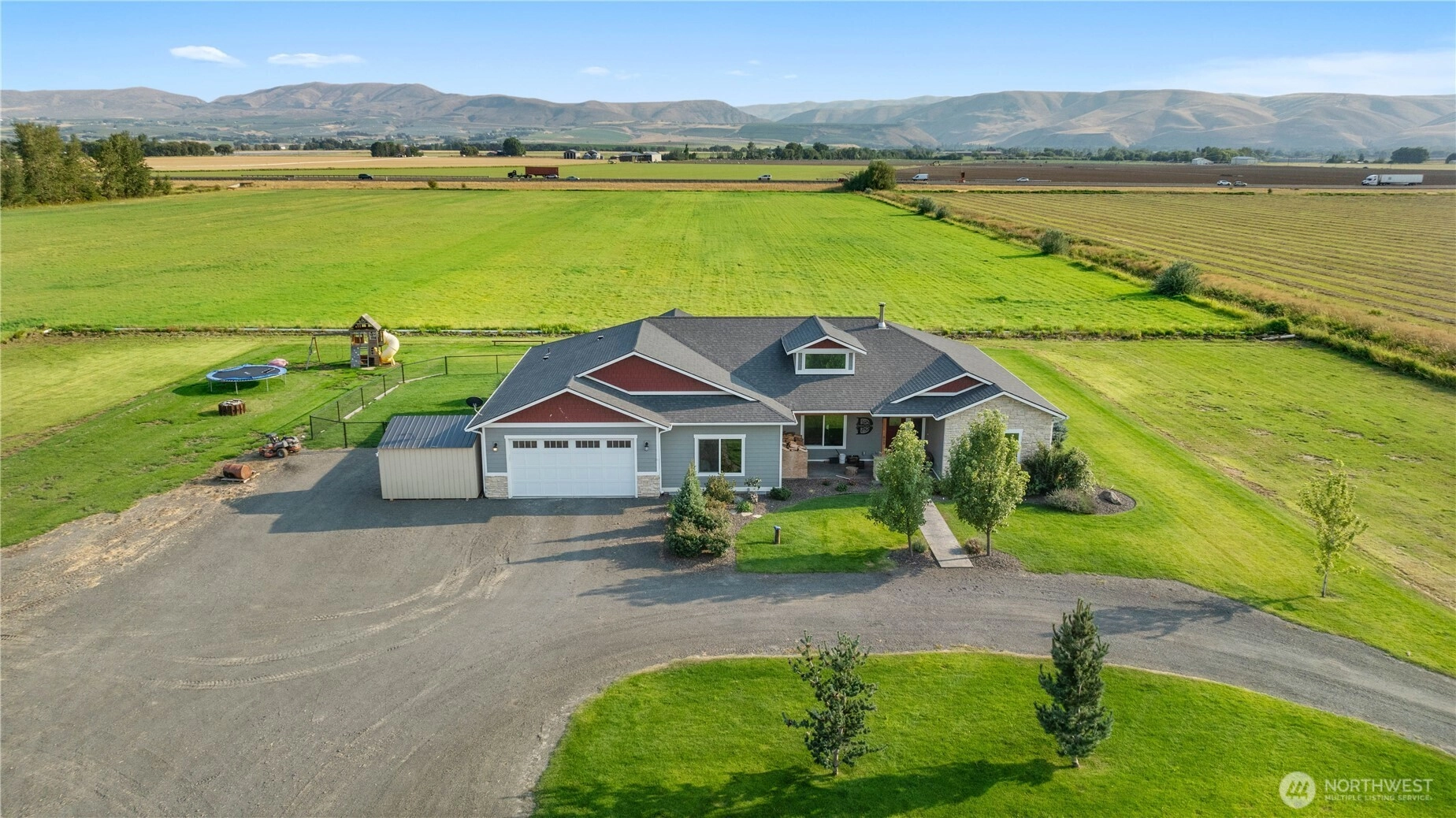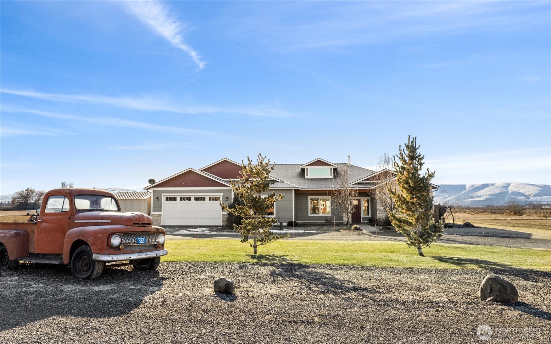 This alluring 2,574 SqFt home features 4 beds/2.5 baths and is nestled on a serene dead-end street offering breathtaking mountain views on 7.78 irrigated acres and outdoor space. Inside, discover a spacious floor plan with a grand living room, large family room, and a gourmet kitchen complete with granite countertops, double ovens, and a dedicated butler's pantry with a second refrigerator & prep area. The luxurious primary suite boasts a walk-in closet, en-suite bathroom with a large soaking tub, and dual vanities. Enjoy the outdoors on the lit covered patio, perfect for entertaining while taking in the stunning scenery. With vaulted ceilings & an attached 2-car garage, this property offers the perfect blend of comfort, style & space.
