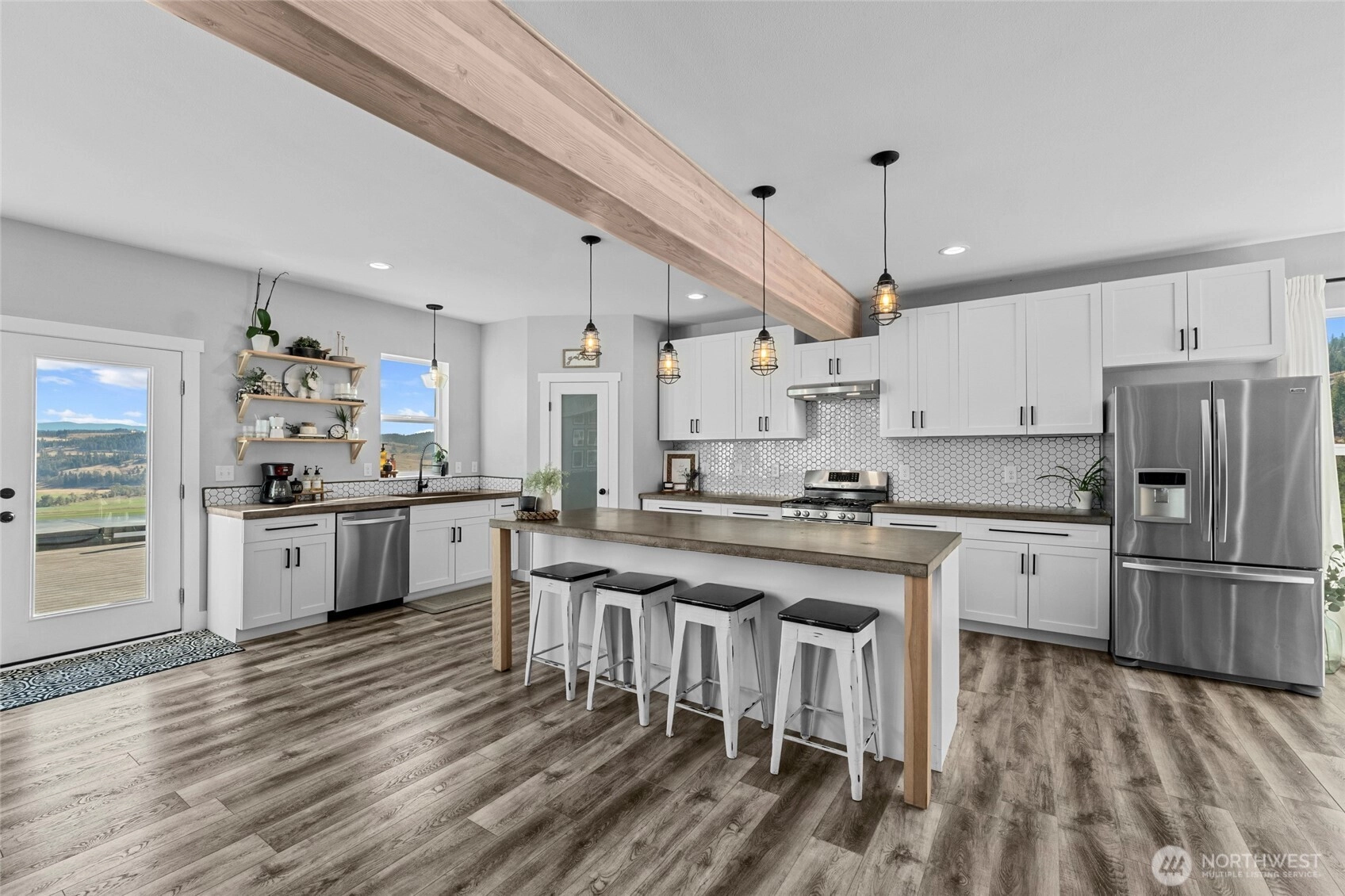 Discover breathtaking views & modern elegance in this stunning 4-bedroom, 3-bath home situated on over 6 acres overlooking the Colville Valley. Sunlight floods thru expansive picture windows, highlighting the kitchen w/concrete counters, gas range & walk in pantry, dining area & vaulted living room. The main floor boasts a spacious primary suite w/a luxurious tiled walk-in dual head shower, double sinks & closet w/laundry facilities conveniently located nearby. Upstairs, there's three bedrooms, loft area, den/office & full bath. The spacious unfinished basement, insulated & wired w/garage access, offers endless possibilities. There's a heated saltwater pool w/gas open flame firepit, hot tub & deck.