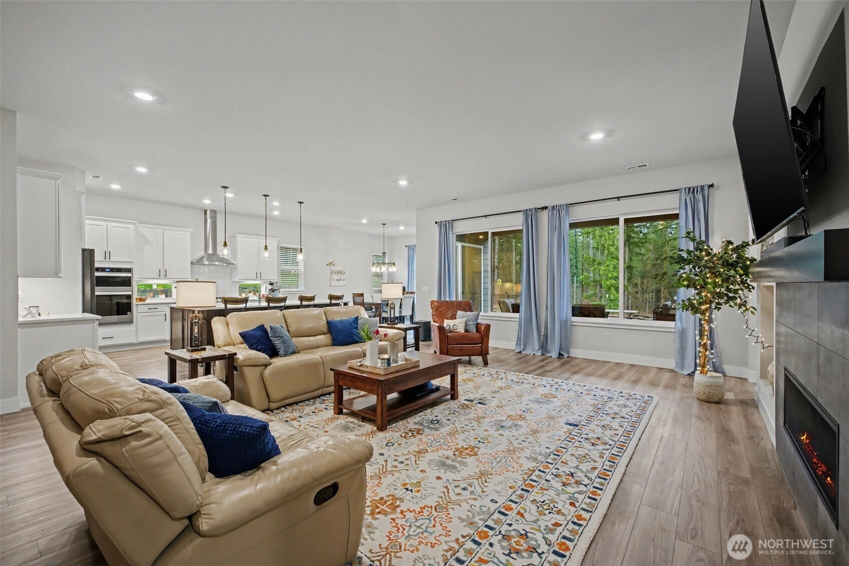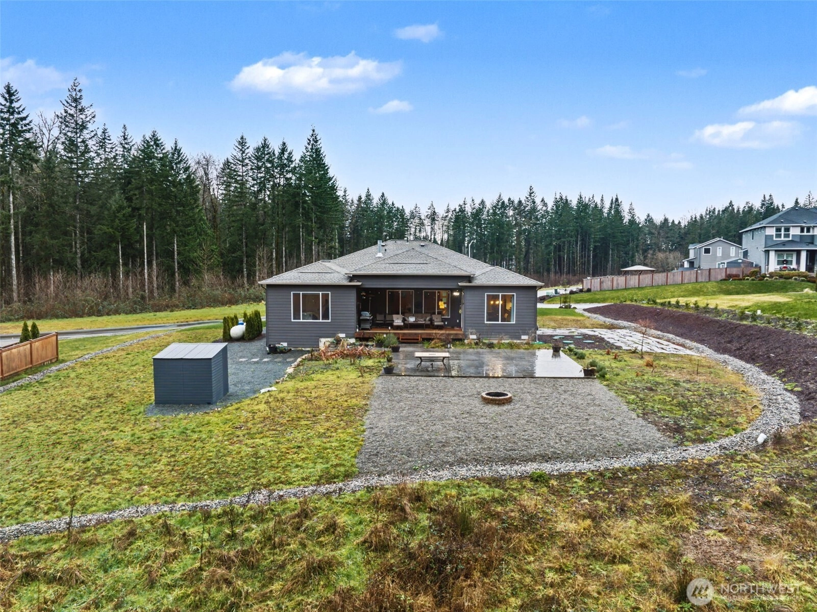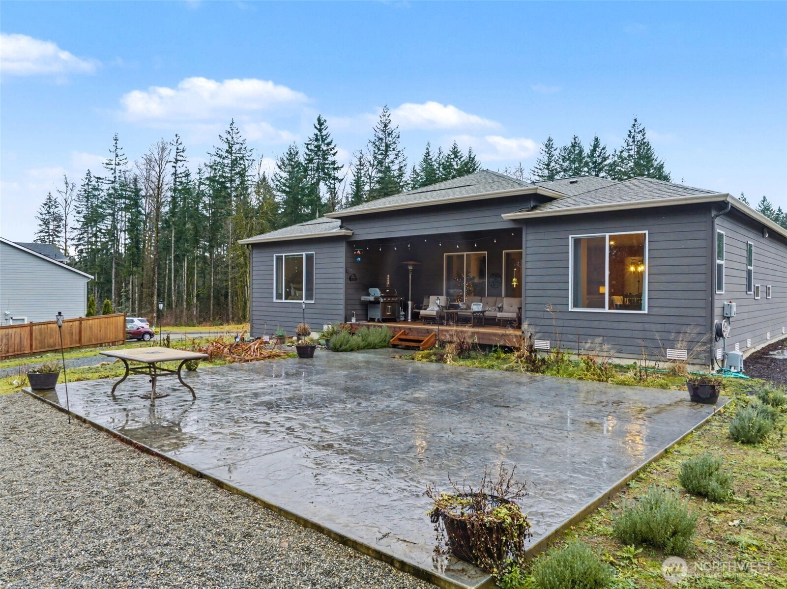 Stunning rambler featuring soaring 10-ft ceilings, wide-plank floors & large windows filling the home with natural light. Open concept great room flows seamlessly into the gourmet kitchen with oversized island, extra cabinetry, huge walk-in pantry, & propane stove. Generously sized living area with fireplace is ideal for everyday living and entertaining. Luxurious primary suite offers a spa-like bath & two walk-in closets. For added privacy two additional bedrooms are located on the opposite side of the home. Large dedicated office with French doors. Well-designed laundry room with built-in storage & sink plumbing. Sliding glass door to covered deck with gas line for BBQ & huge custom stamp patio. Over $50,000 in builder upgrades included.