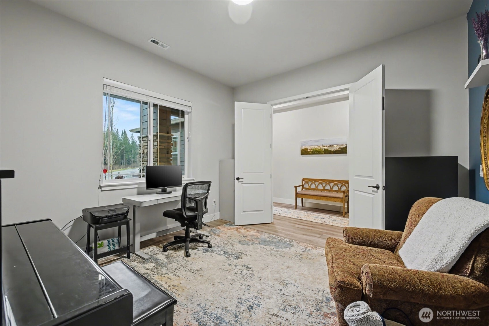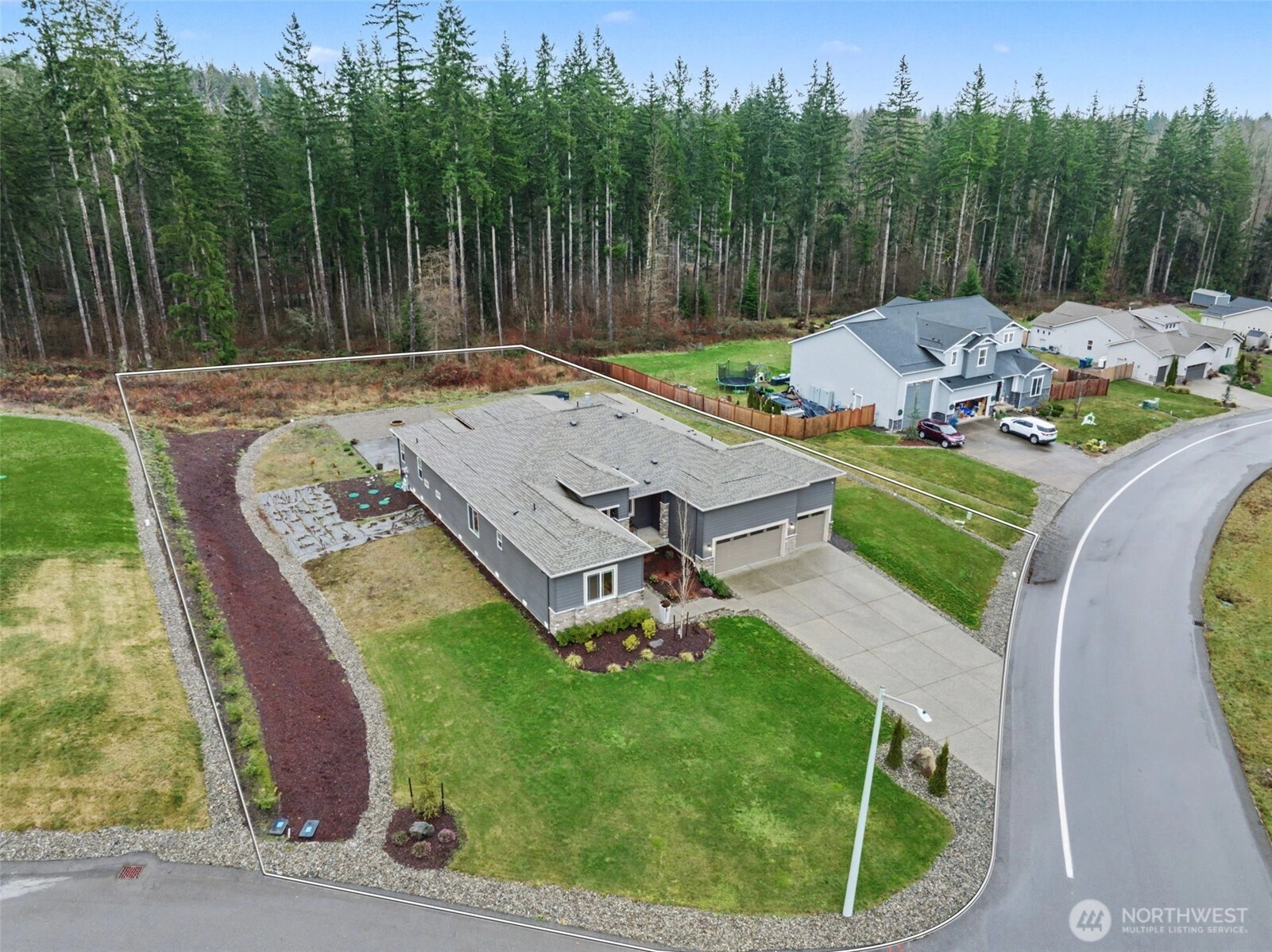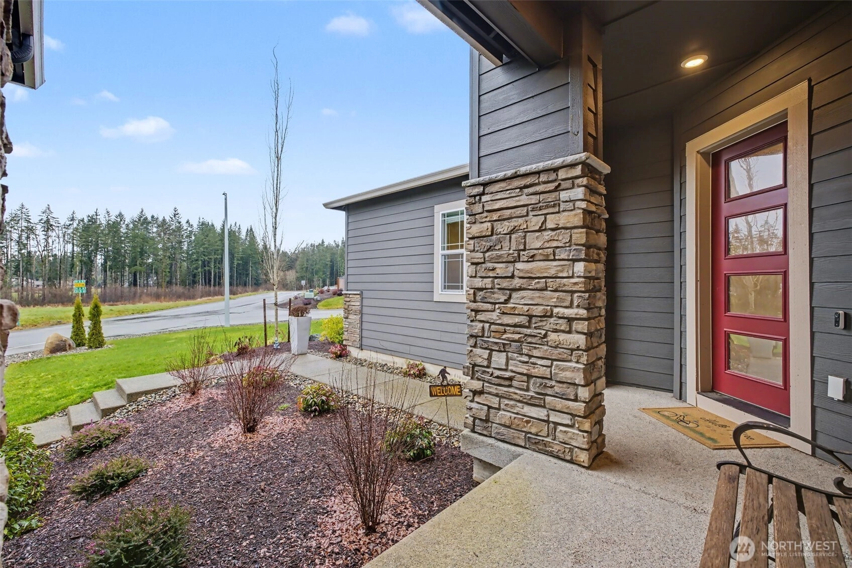Stunning rambler featuring soaring 10-ft ceilings, wide-plank floors & large windows filling the home with natural light. Open concept great room flows seamlessly into the gourmet kitchen with oversized island, extra cabinetry, huge walk-in pantry, & propane stove. Generously sized living area with fireplace is ideal for everyday living and entertaining. Luxurious primary suite offers a spa-like bath & two walk-in closets. For added privacy two additional bedrooms are located on the opposite side of the home. Large dedicated office with French doors. Well-designed laundry room with built-in storage & sink plumbing. Sliding glass door to covered deck with gas line for BBQ & huge custom stamp patio. Over $50,000 in builder upgrades included.