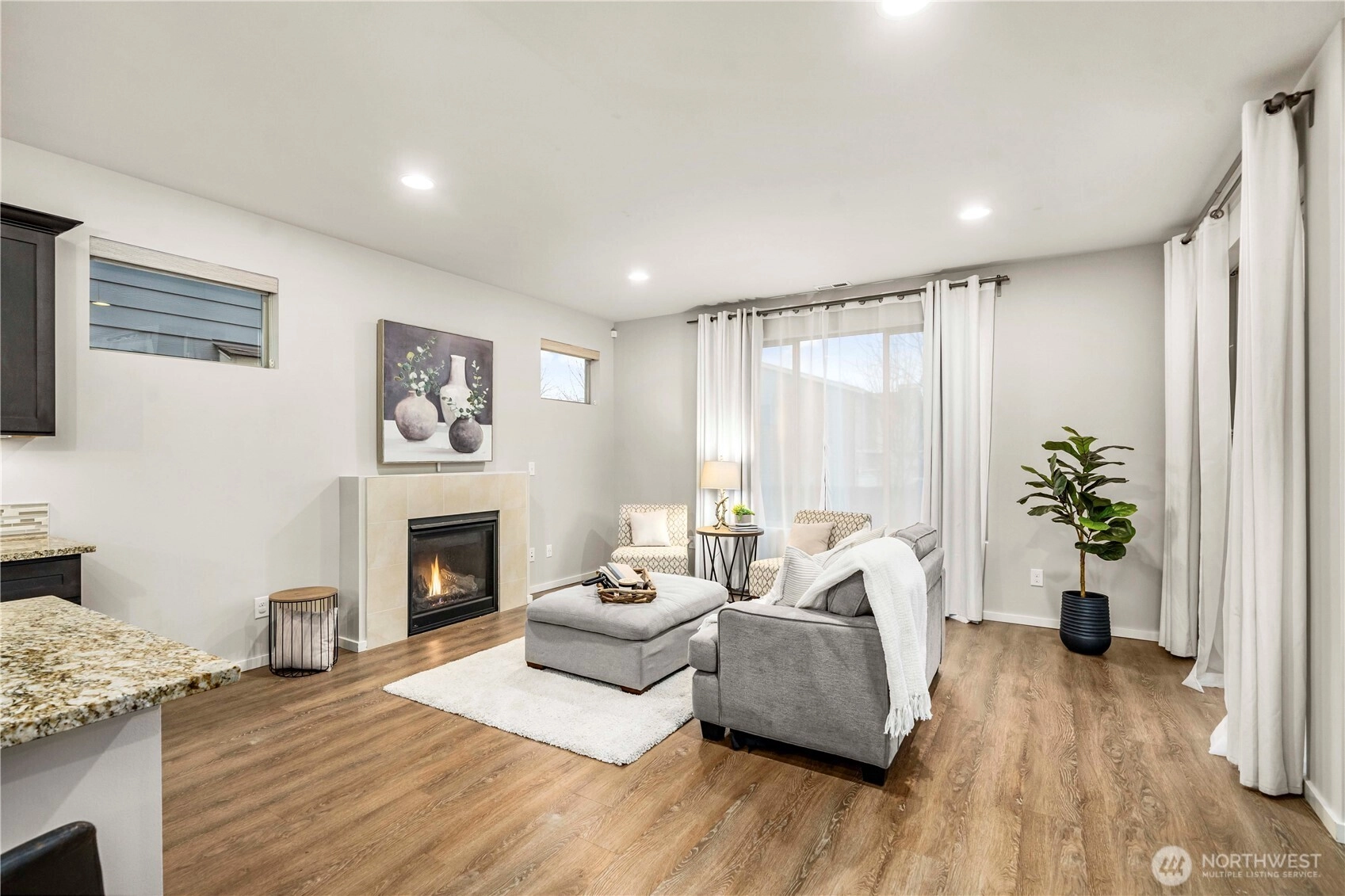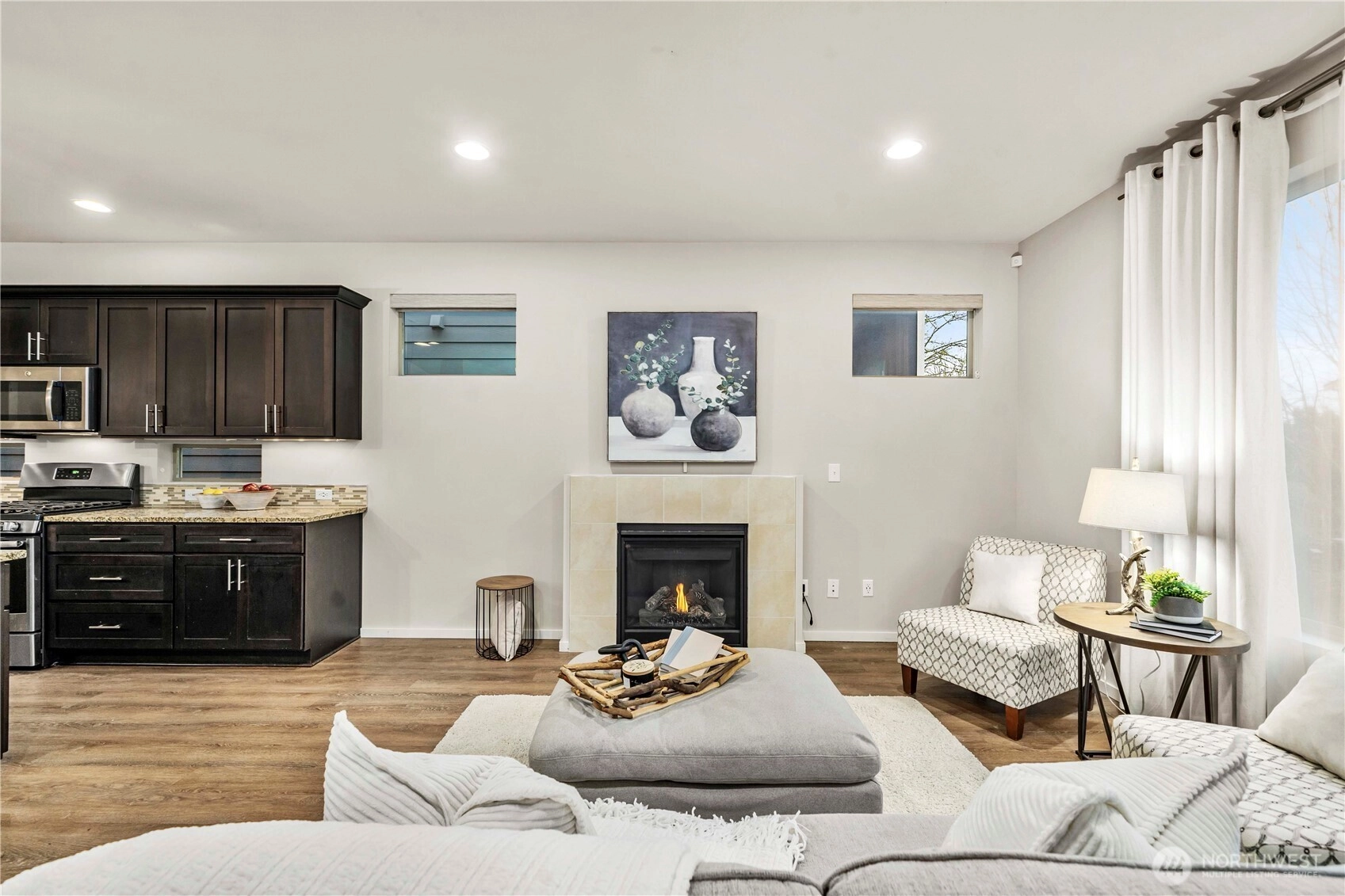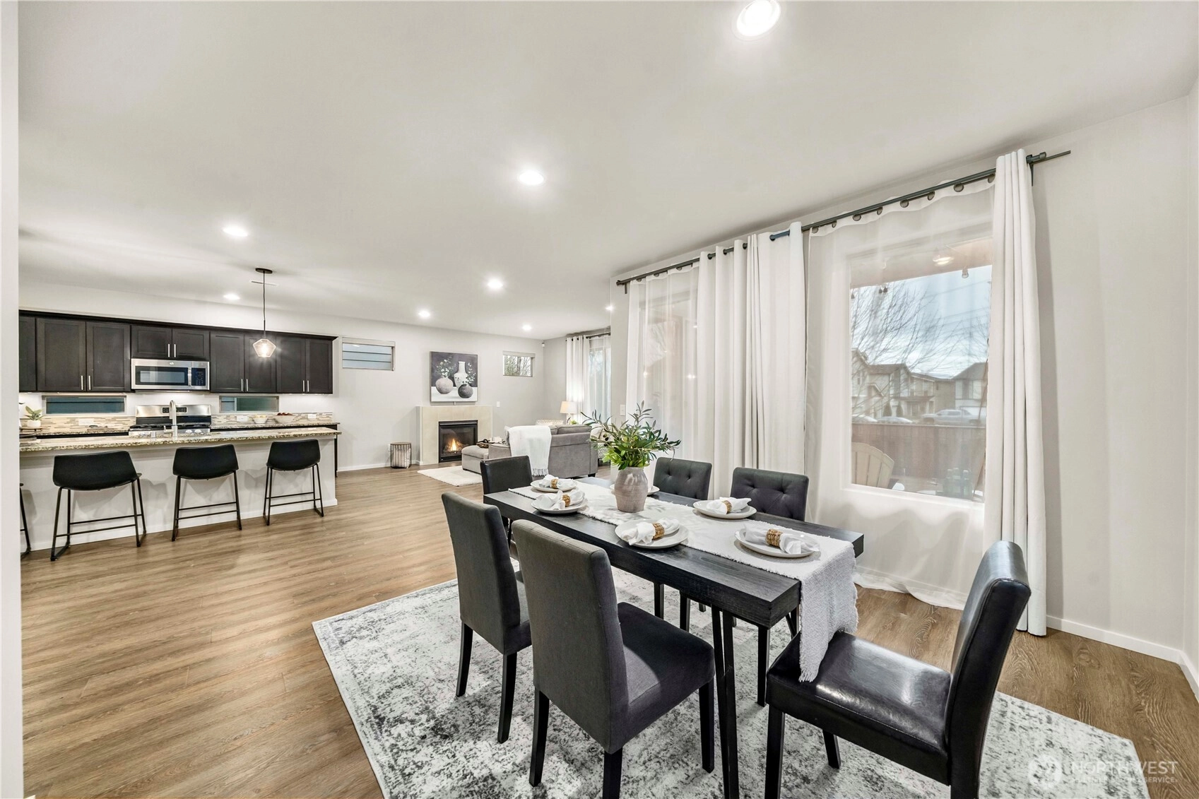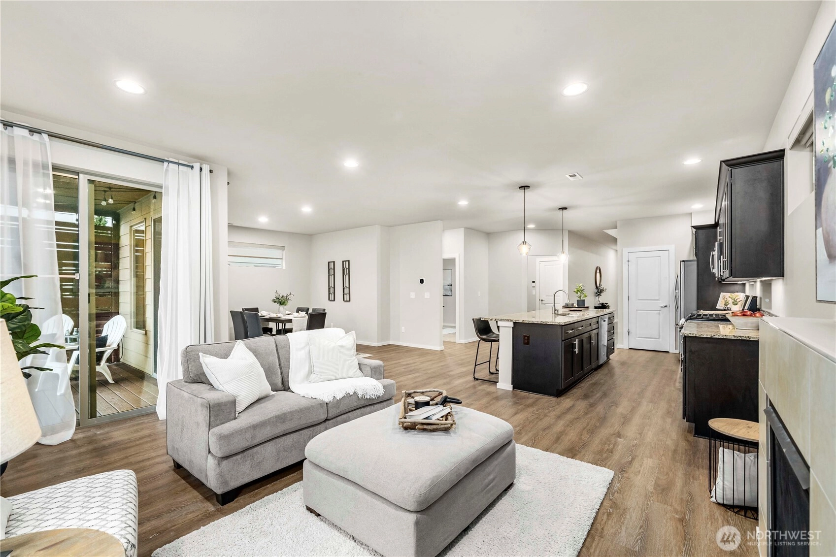 Welcome to Sunridge at Elk Run, one of Maple Valley’s most desirable communities. Tucked away on a quiet cul de sac near a neighborhood park, this modern 2017 built home is truly move in ready. Simply unpack and enjoy. The home features a freshly painted interior and has been impeccably maintained, offering a thoughtful and functional design throughout. The open great room layout is filled with light from expansive windows and two oversized sliding doors that open to the covered outdoor deck, creating a outdoor living room for year round enjoyment. The well appointed kitchen features a gas range, dark modern cabinetry, walk in pantry, oversized island, and a cozy fireplace anchoring the living space. The main floor den with a full bath offers flexibility as a guest suite or home office. Upstairs, a spacious bonus loft anchors four well sized bedrooms, including a Jack and Jill bath and a serene primary suite with a peaked ceiling and custom closet system. Additional highlights include a partial Mount Rainier view, air conditioning, EV charger, low maintenance turf, and a covered composite deck with sleek metal railings. Ideally located near Glacier Park Elementary, Tahoma High School, trails, and shopping, this home combines comfort, style, and convenience in one exceptional package. Homes like this do not last. Come see it today and settle in without lifting a finger.
