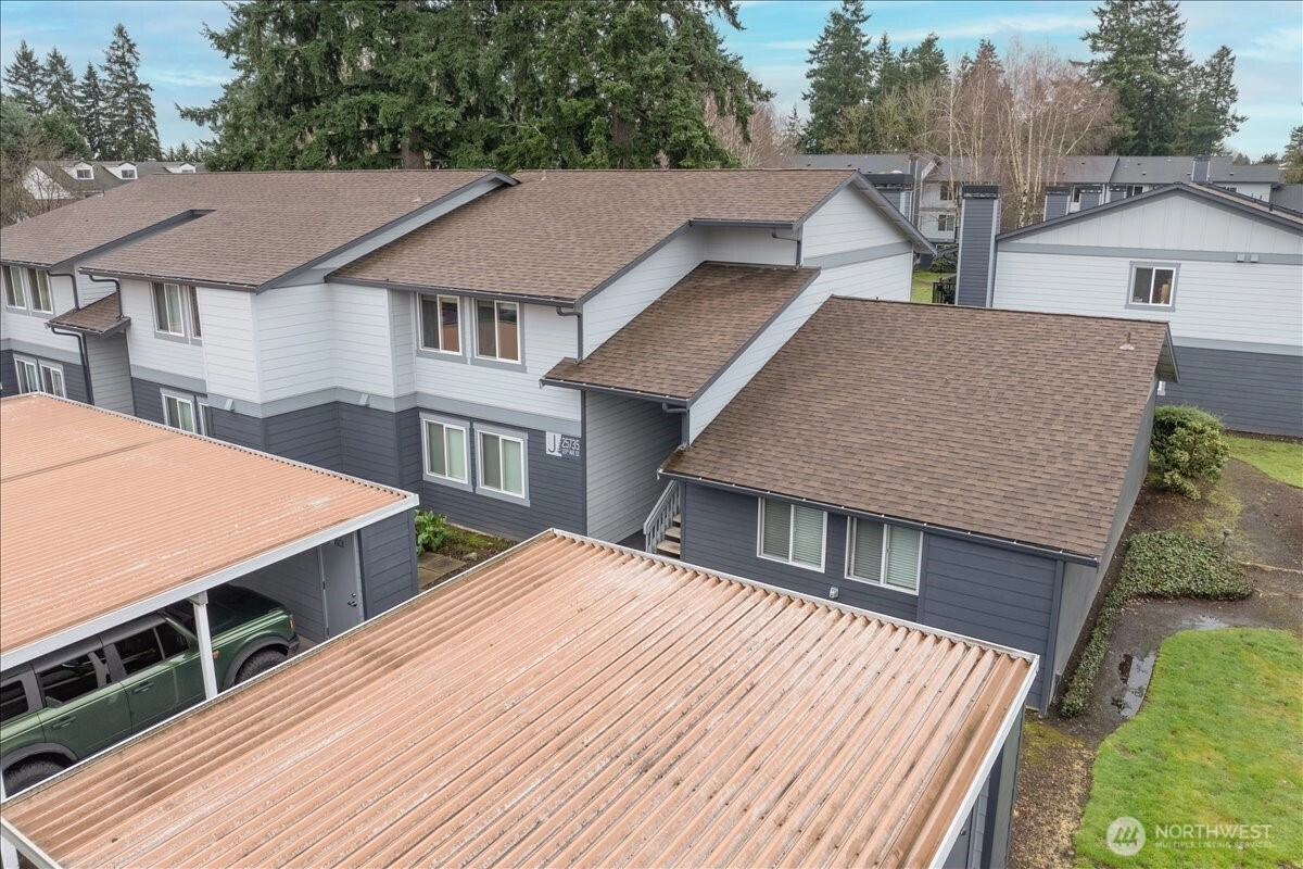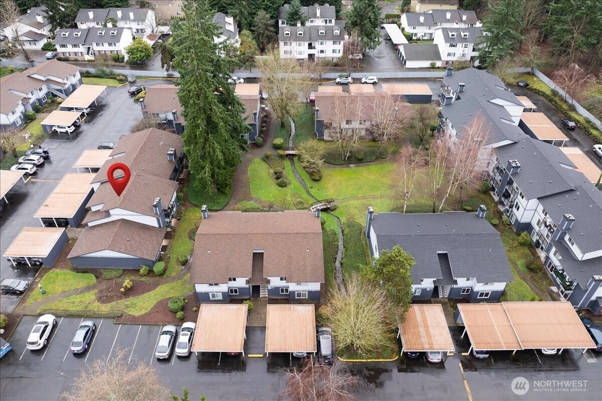 Perched on the top floor of Twin Firs in Kent, this move-in-ready two bedroom condo is a rare find. Updated interiors pair with a cozy wood stove and in-unit laundry for everyday comfort. Large living space flows into dining room and open galley kitchen. Spacious bedrooms with a semi-en-suite off the primary, plus plenty of closet storage throughout. Step onto your private balcony overlooking the serene inner courtyard—lush trees, a meandering creek, and charming bridges create a peaceful, park-like setting. Centrally located yet tucked away, this secure, gated community offers dedicated covered parking, tons of guest parking, and a huge storage unit. Well managed HOA with no special assessments. A truly special home that blends convenience with tranquility.