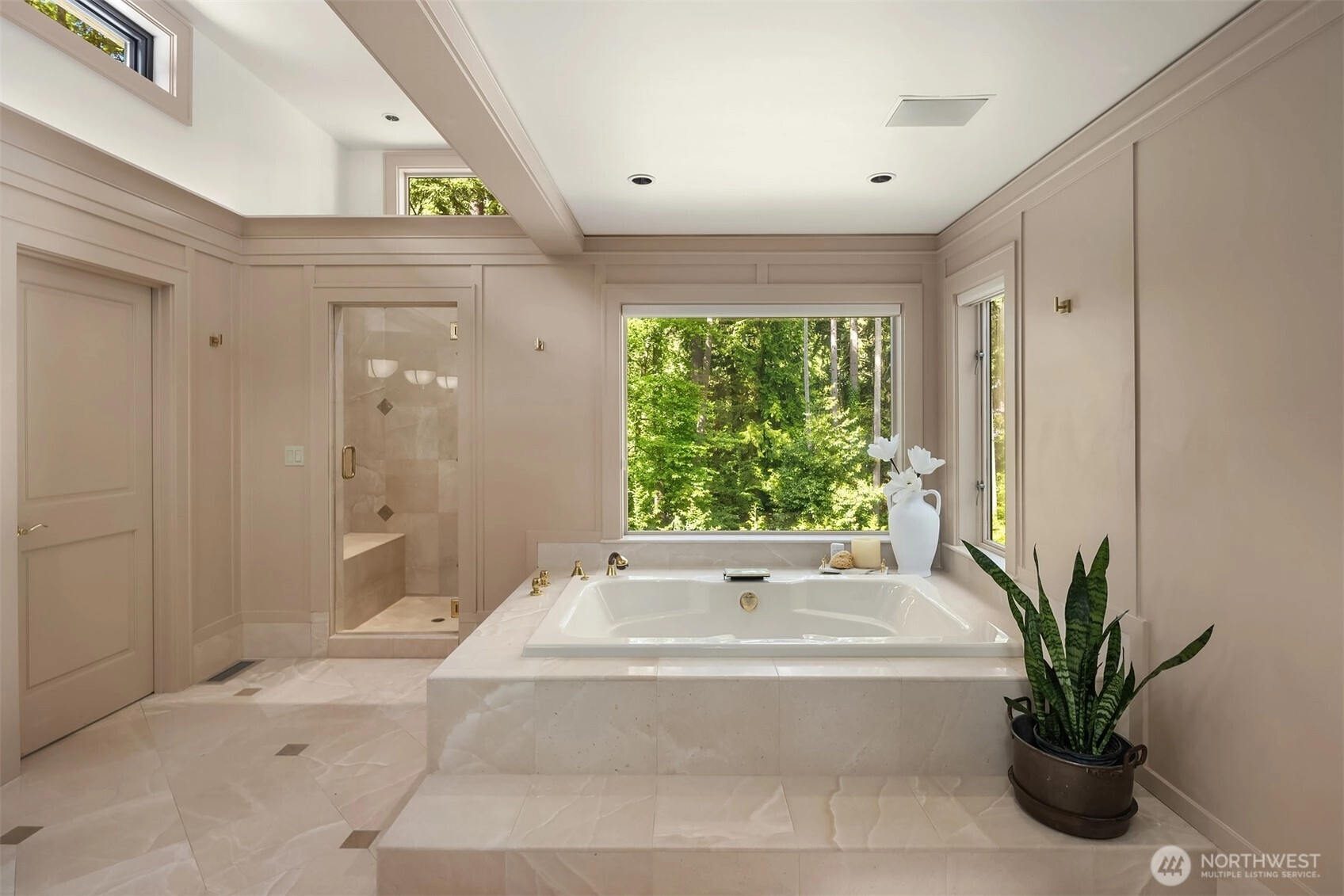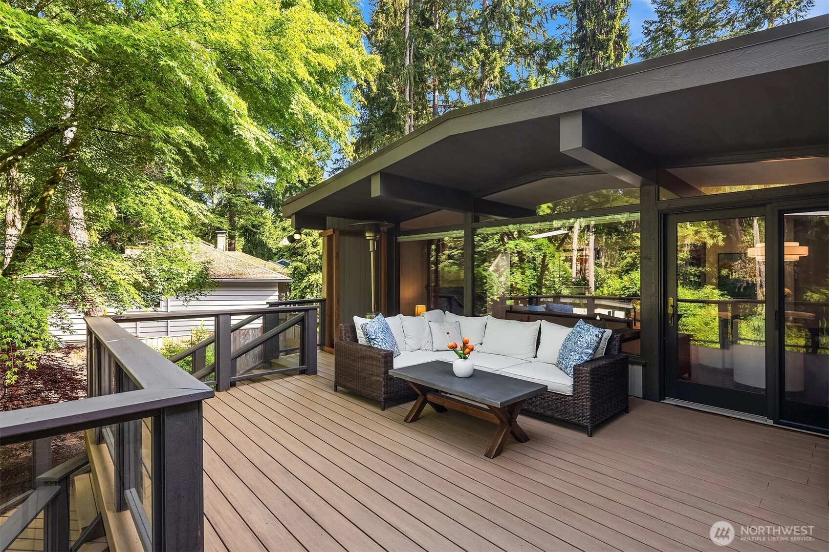 Turn your New Year's resolution into reality. Welcome to Killarney Circle—Enatai's crown jewel where park-like serenity meets metropolitan convenience, minutes from the pulse of Bellevue and Seattle. Your private backyard backs directly to Killarney Glen Park with your own gate opening to tennis courts and forest trails. Picture morning coffee on your sun-soaked front deck, then seamless transitions to the sprawling entertainer's deck where summer evenings become legendary. The main floor magic happens in the chef's kitchen and family room that flows effortlessly into a brand-new garden courtyard—indoor-outdoor living at its finest. The inspired open layout connects every space, from intimate dinners to grand celebrations on the upper deck. This is the flexible floor plan that evolves as beautifully as your life does. Escape to your main-floor primary suite—a true sanctuary bathed in natural light from soaring clerestory windows, complete with a spa-caliber bath that rivals any five-star retreat. On the lower level, discover infinite possibilities: four generous bedrooms, room for your dream gym, the ultimate rec room, a dedicated office—whatever your next chapter demands. Killarney Club membership available.