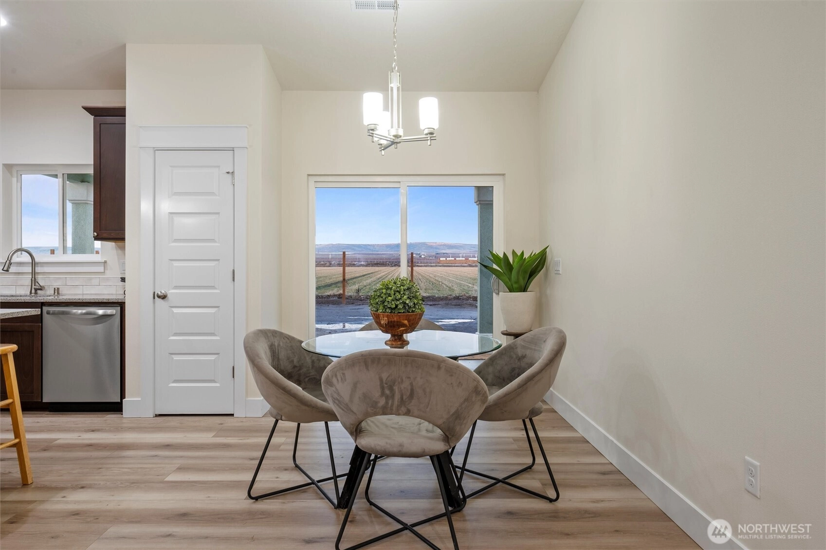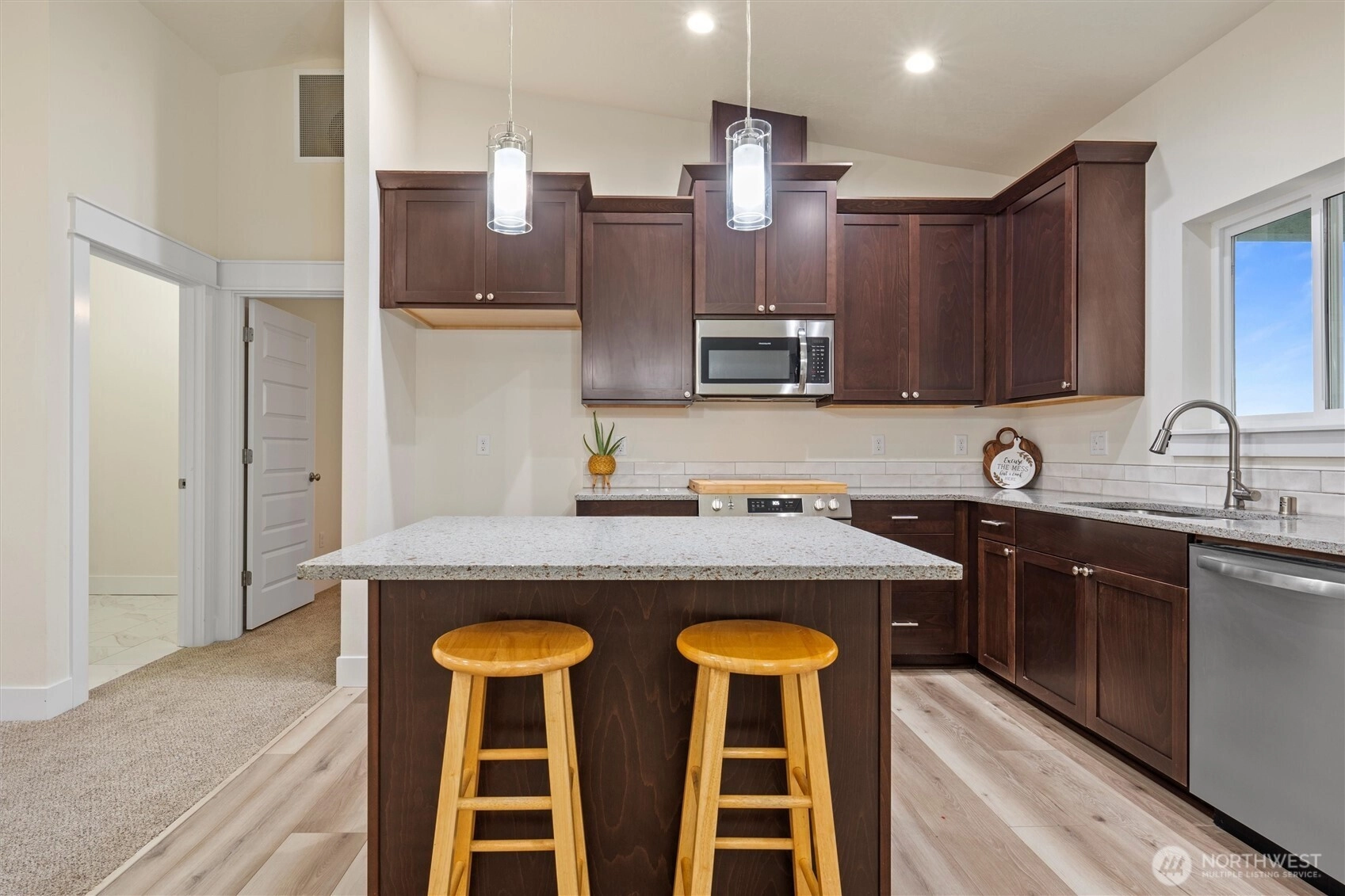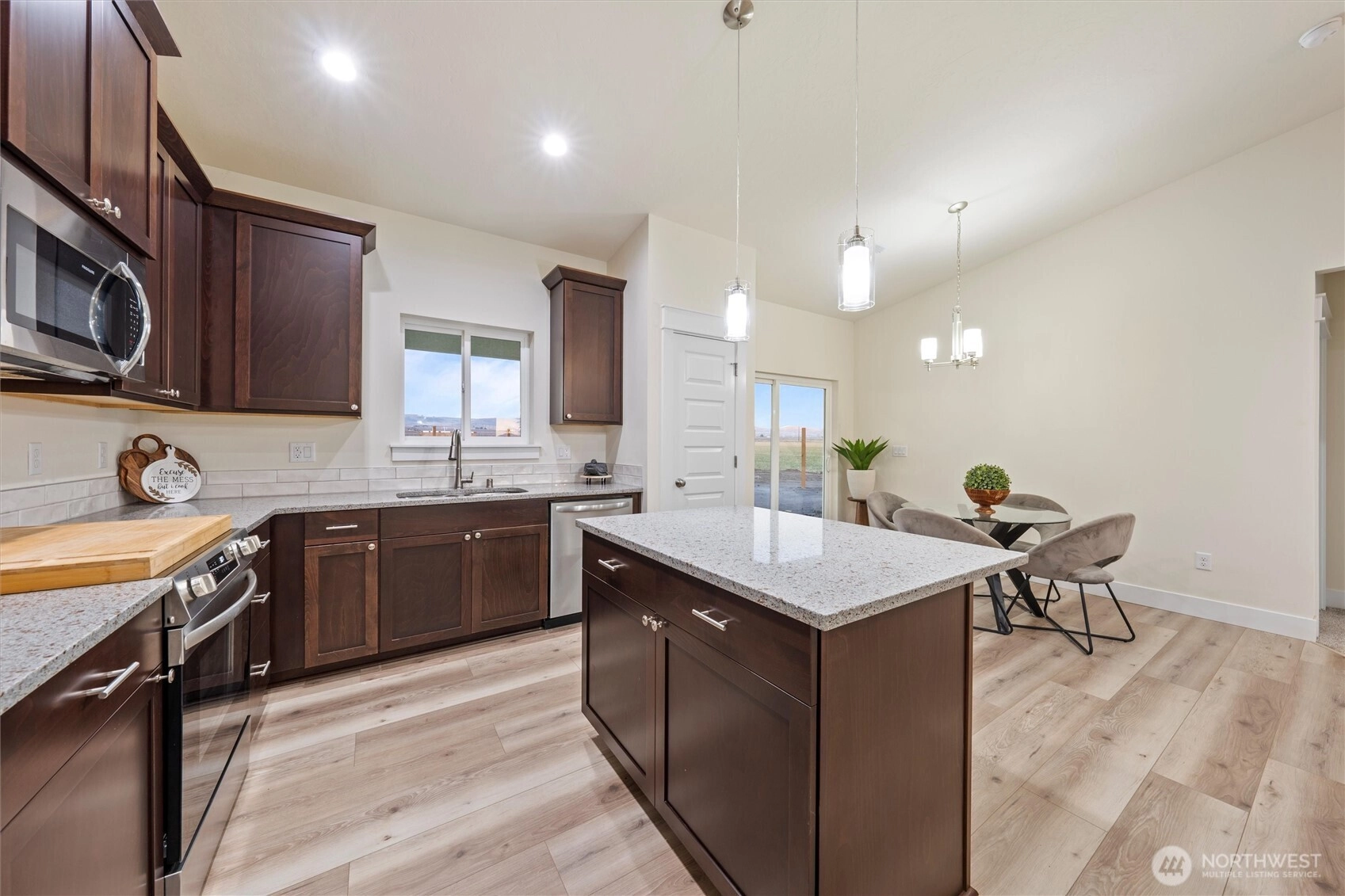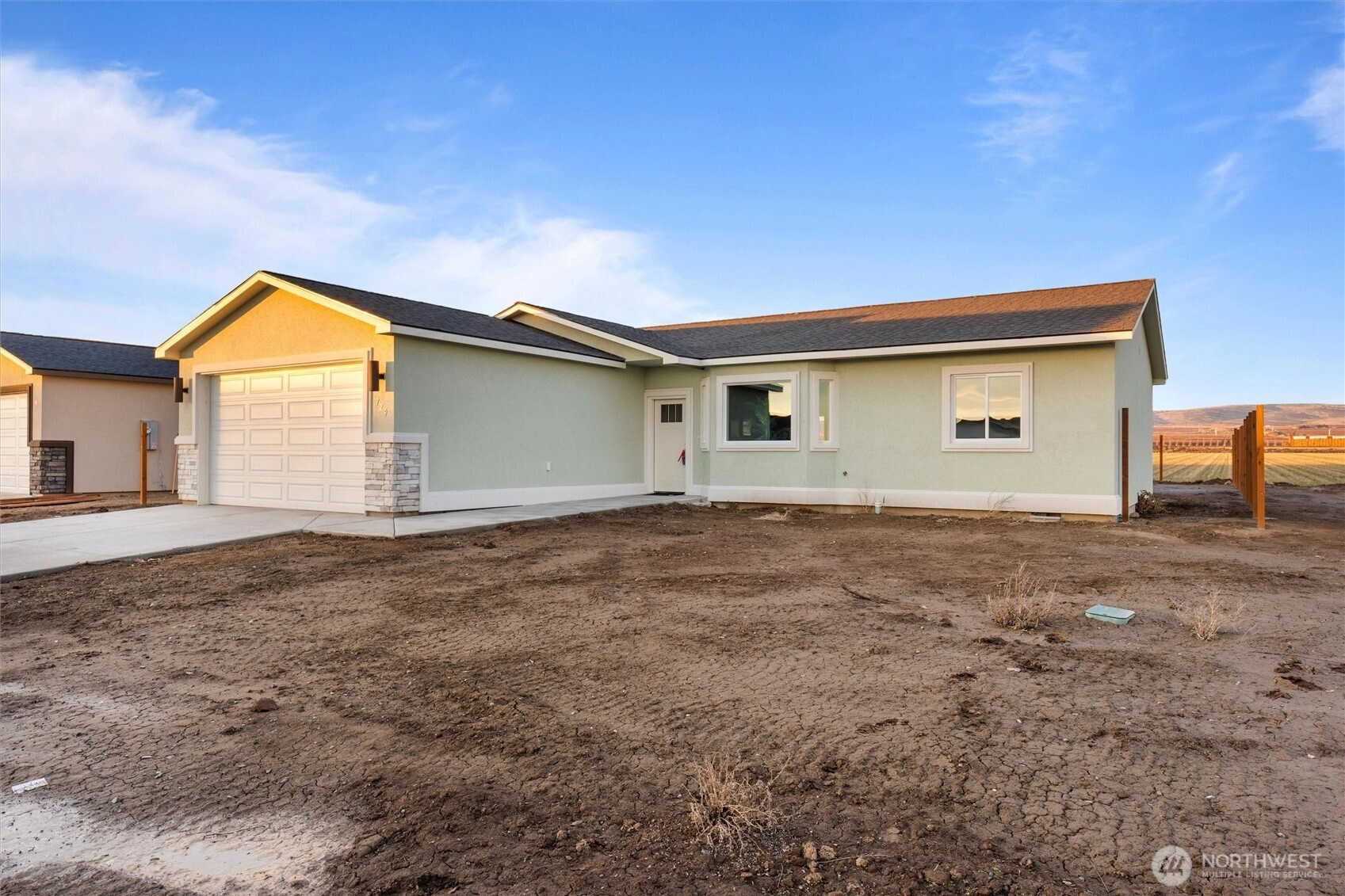 Hurry on this beautiful home built in 2024 in Jackrabbit Estates! Located next to the school. Offers privacy at end of the street bordering the school. Inside is stunning with open concept, high Vaulted ceilings, Beautiful kitchen open to Living area with island w/eating bar & stainless steel appliances, 3 bedrooms, 2 baths, (huge primary vaulted suite) 2 car garage. Enjoy the Heatpump on hot summer days with the Air conditioning it provides. The private yard is very large with covered patio and lots of room for garden beds, fruit trees or many other uses. Hurry on this one! This home is move in ready and is priced for quick sale!!