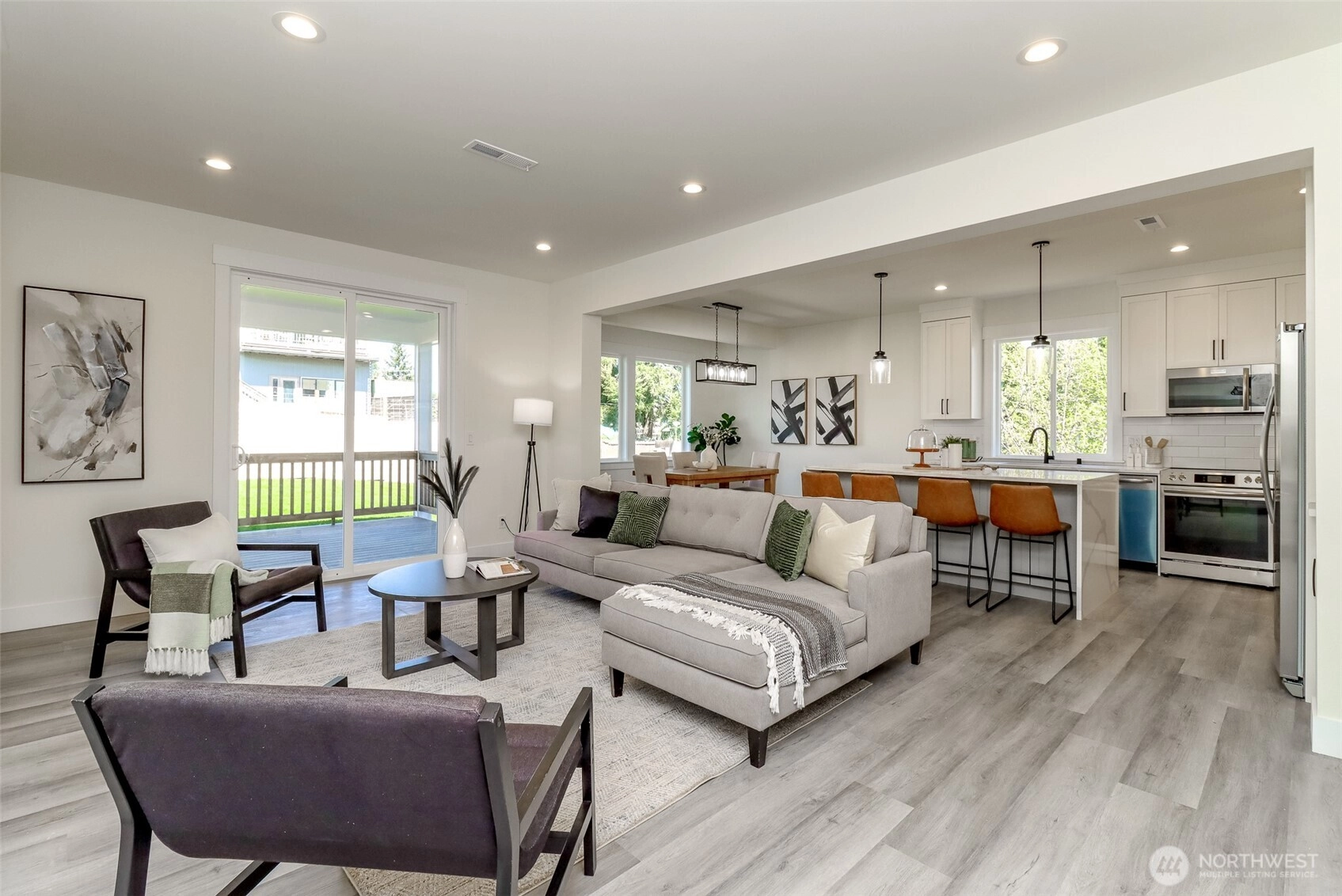 Step into this stunning new construction home, professionally staged to showcase its modern elegance. Featuring 4 spacious bedrooms and 2.5 bathrooms, this 2,387 sq ft residence offers a bright, open-concept layout with beautiful finishes throughout. The gourmet kitchen boasts quartz countertops, stainless steel appliances, custom cabinetry, and a large island perfect for entertaining. Upstairs, the luxurious primary suite includes a walk-in closet and spa-like bathroom. Enjoy year-round comfort with central A/C, an attached 2-car garage, and a fully landscaped yard with fresh new grass. Conveniently located near major freeways, SeaTac Airport, downtown Seattle, and Southcenter Mall. No HOA. Move-in ready and built to impress!