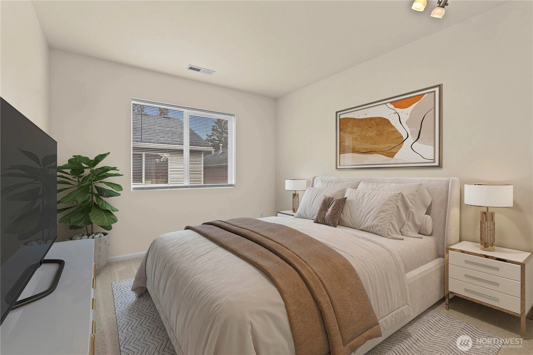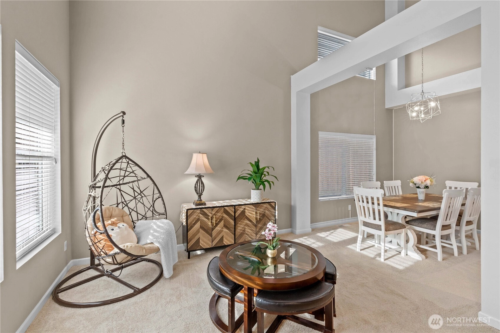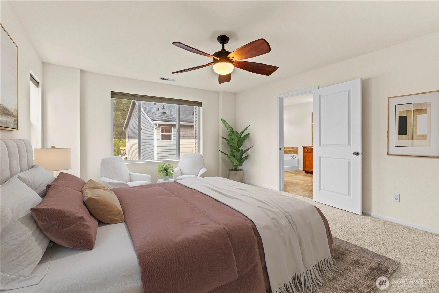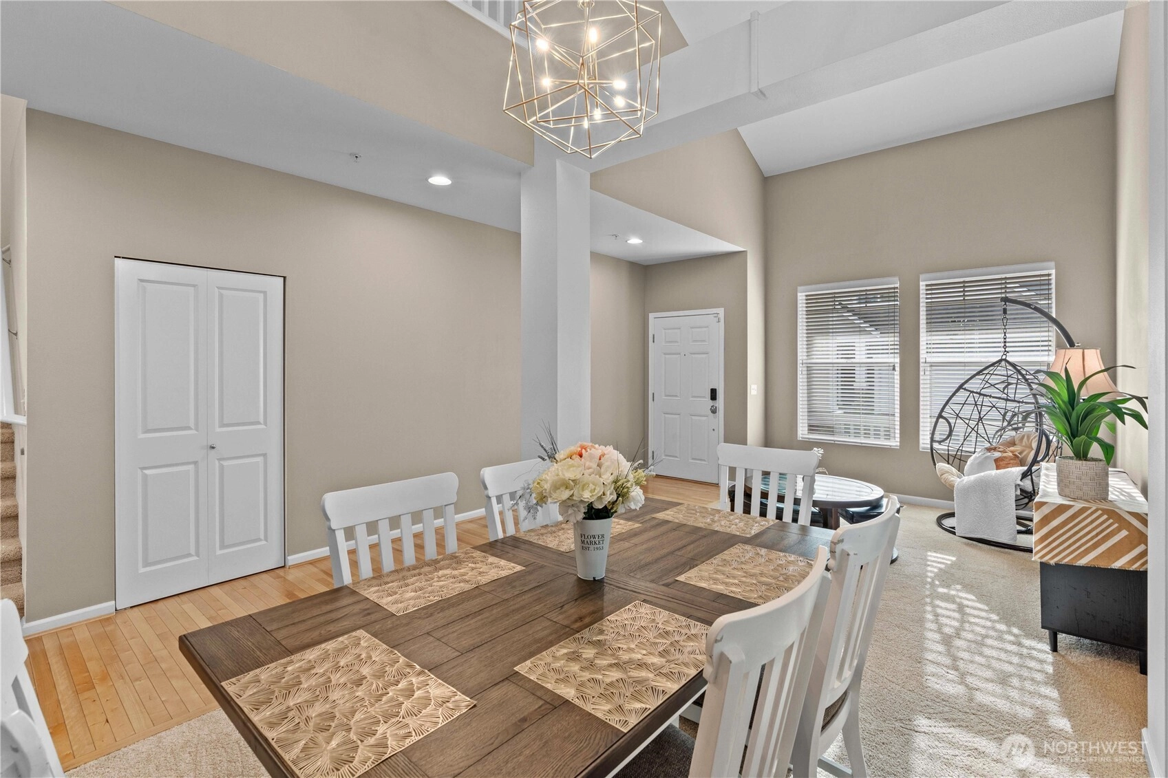 Welcome to this stunning home at The Crossings, located next to a greenbelt. Step inside to find beautiful new paint and fresh new carpet, complementing gorgeous hardwood floors and vaulted ceilings. The kitchen has a spacious island, pantry & granite countertops, enhanced by modern stainless steel appliances. The master bedroom features a large walk-in closet & a lavish 5-piece bath with a soothing soaking tub. Three additional well-sized bedrooms offer flexibility, and a recently remodeled downstairs bathroom adds modern elegance. Enjoy a 2-car garage with electrical outlet for EV charging, new water heater and a fully fenced, low-maintenance yard. The community offers playground, guest parking, and pet waste stations. Conveniently located near I-5, 405, Boeing, Park and Ride, athletic club, shopping, dining and amenities, this home perfectly blends comfort & convenience.