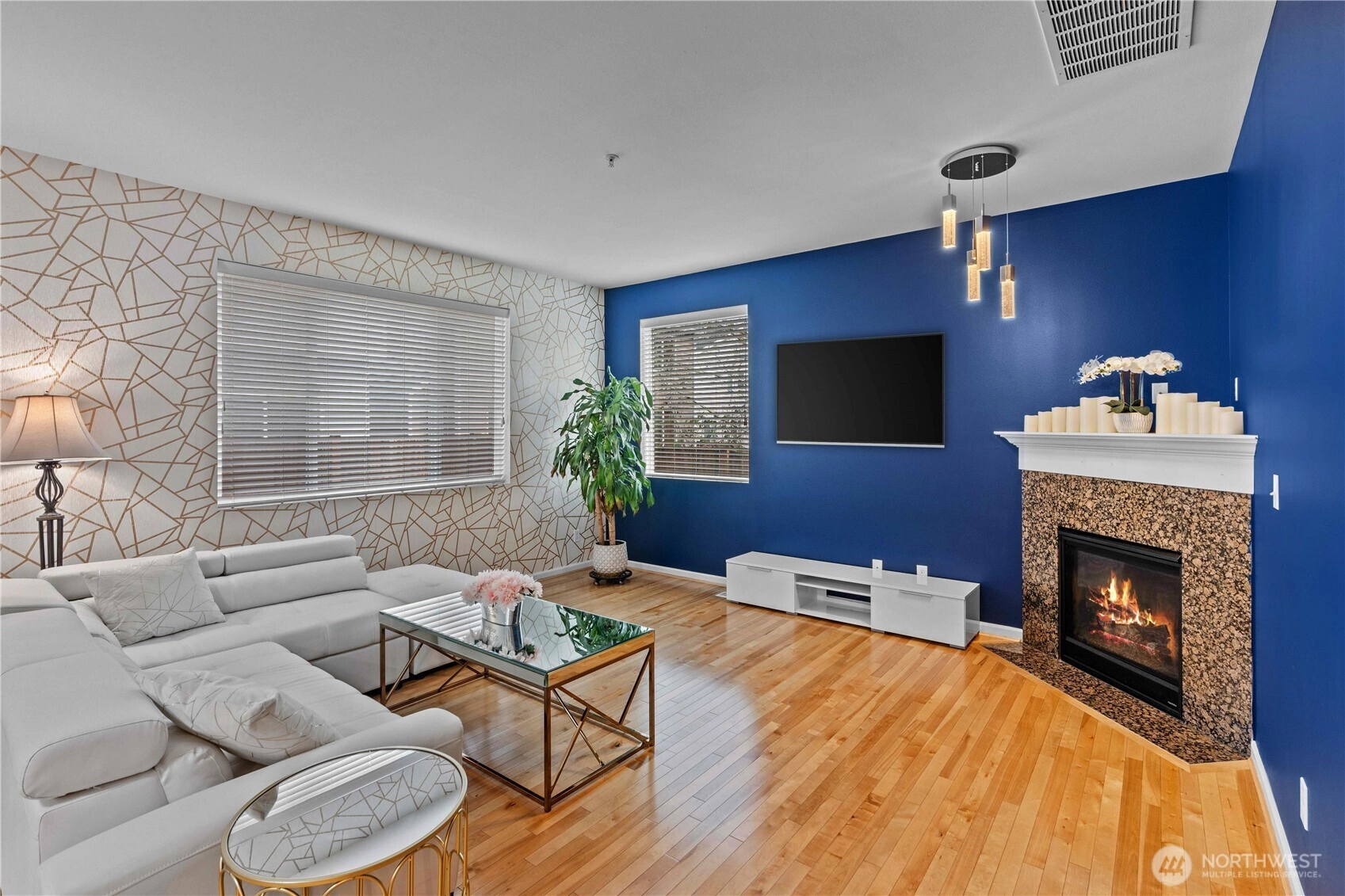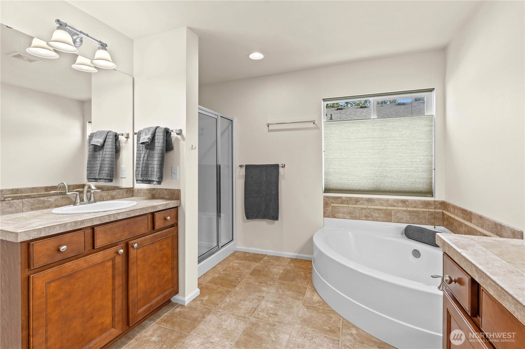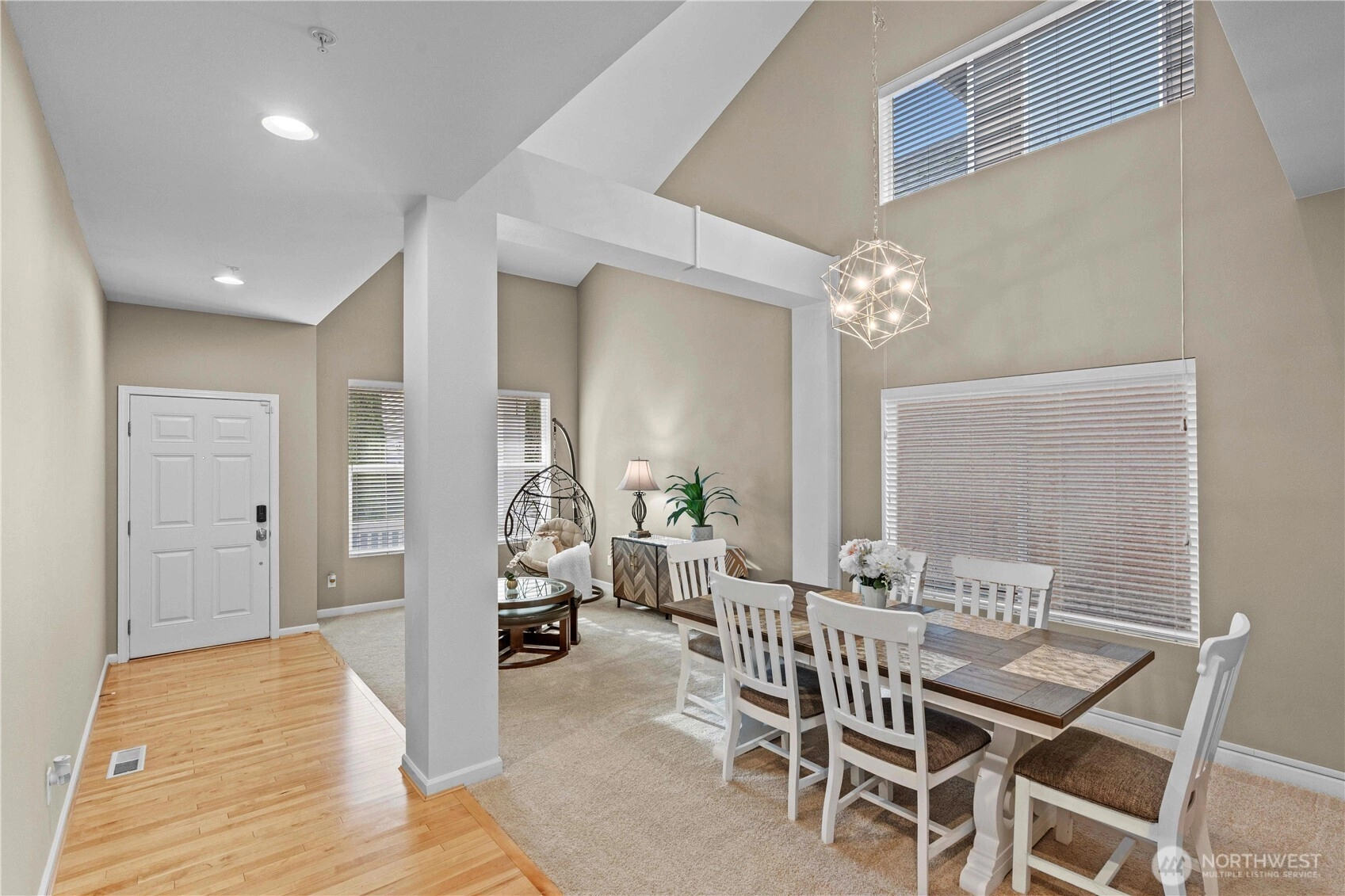 Welcome to this stunning home at The Crossings, located next to a greenbelt. Step inside to find beautiful new paint and fresh new carpet, complementing gorgeous hardwood floors and vaulted ceilings. The kitchen has a spacious island, pantry & granite countertops, enhanced by modern stainless steel appliances. The master bedroom features a large walk-in closet & a lavish 5-piece bath with a soothing soaking tub. Three additional well-sized bedrooms offer flexibility, and a recently remodeled downstairs bathroom adds modern elegance. Enjoy a 2-car garage with electrical outlet for EV charging, new water heater and a fully fenced, low-maintenance yard. The community offers playground, guest parking, and pet waste stations. Conveniently located near I-5, 405, Boeing, Park and Ride, athletic club, shopping, dining and amenities, this home perfectly blends comfort & convenience.