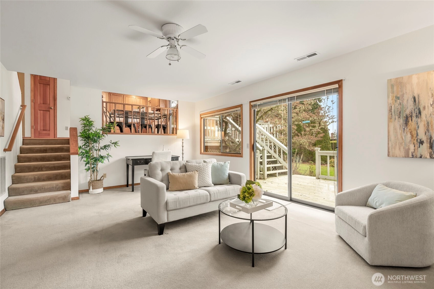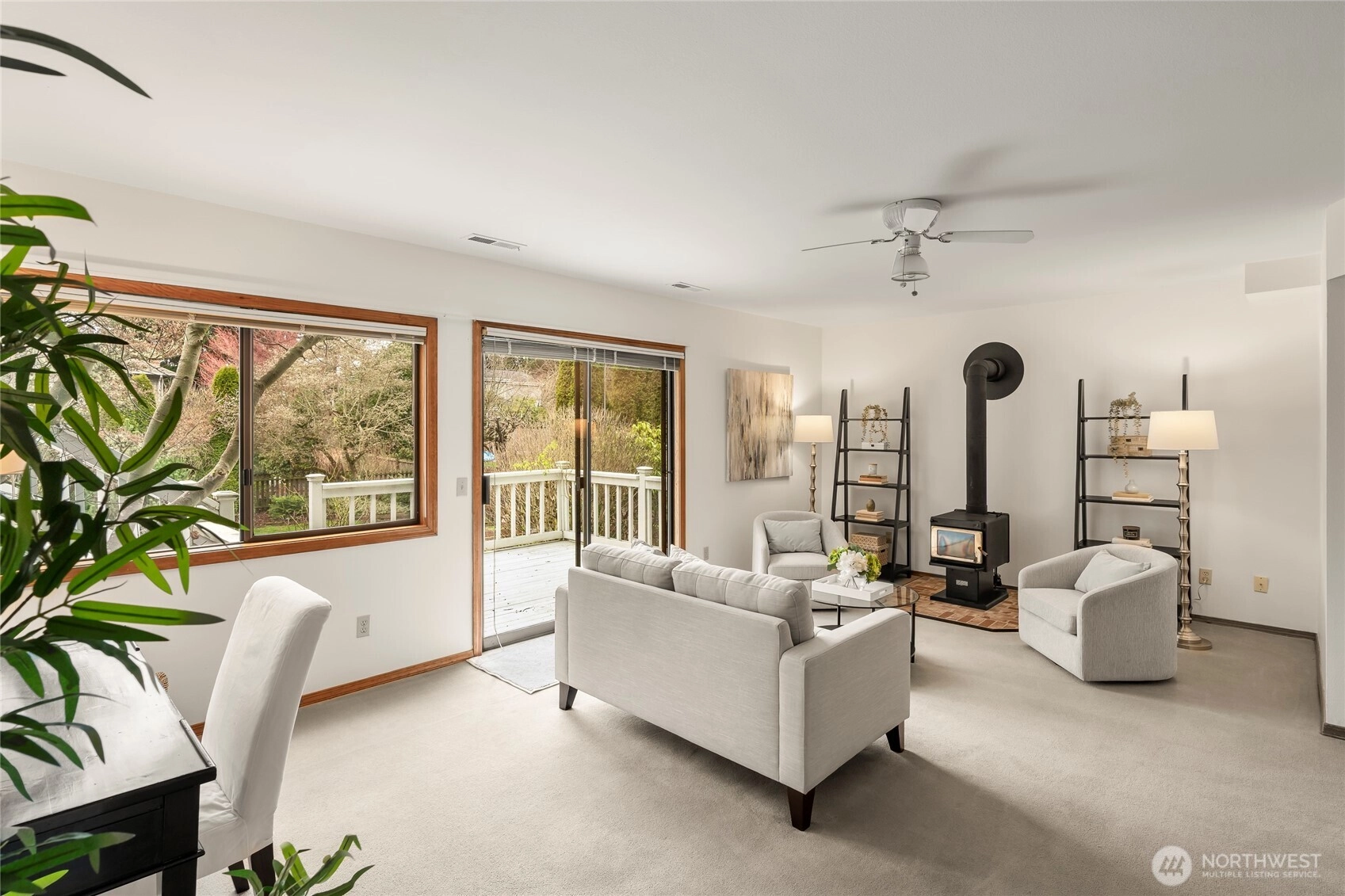 Welcome home to this charming Seaview tri-level featuring 3 bedrooms and 2.25 baths, ideally situated near Hutt Park, a Certified Wildlife Habitat. A warm and inviting entry opens to a spacious living room with a wood-burning fireplace and a large bay window that fills the space with natural light. The adjacent dining room also includes a bay window overlooking the beautifully landscaped backyard. The kitchen offers a Bosch dishwasher, Frigidaire refrigerator, a new range, a cozy eating area, and convenient access to the multi-level deck, perfect for entertaining. A half-flight of stairs leads to the lower level, which includes a comfortable family room with a wood stove, a sliding door to the lower deck, a half bath, laundry area, and access to the attached two-car garage. Just a half-flight up from the main level, the upper floor is highlighted by skylights that brighten the primary suite, complete with a walk-in closet and three-quarter bath. Two additional bedrooms and a full bath complete this level. The fully fenced backyard offers mature landscaping, raised garden beds, blueberry bushes, and ample privacy, along with space to park your recreational toys. Located just minutes from downtown Edmonds, this home provides easy access to beaches, parks, shops, dining, the waterfront, and everything Edmonds has to offer. A perfect blend of natural surroundings and everyday convenience in a highly desirable location.