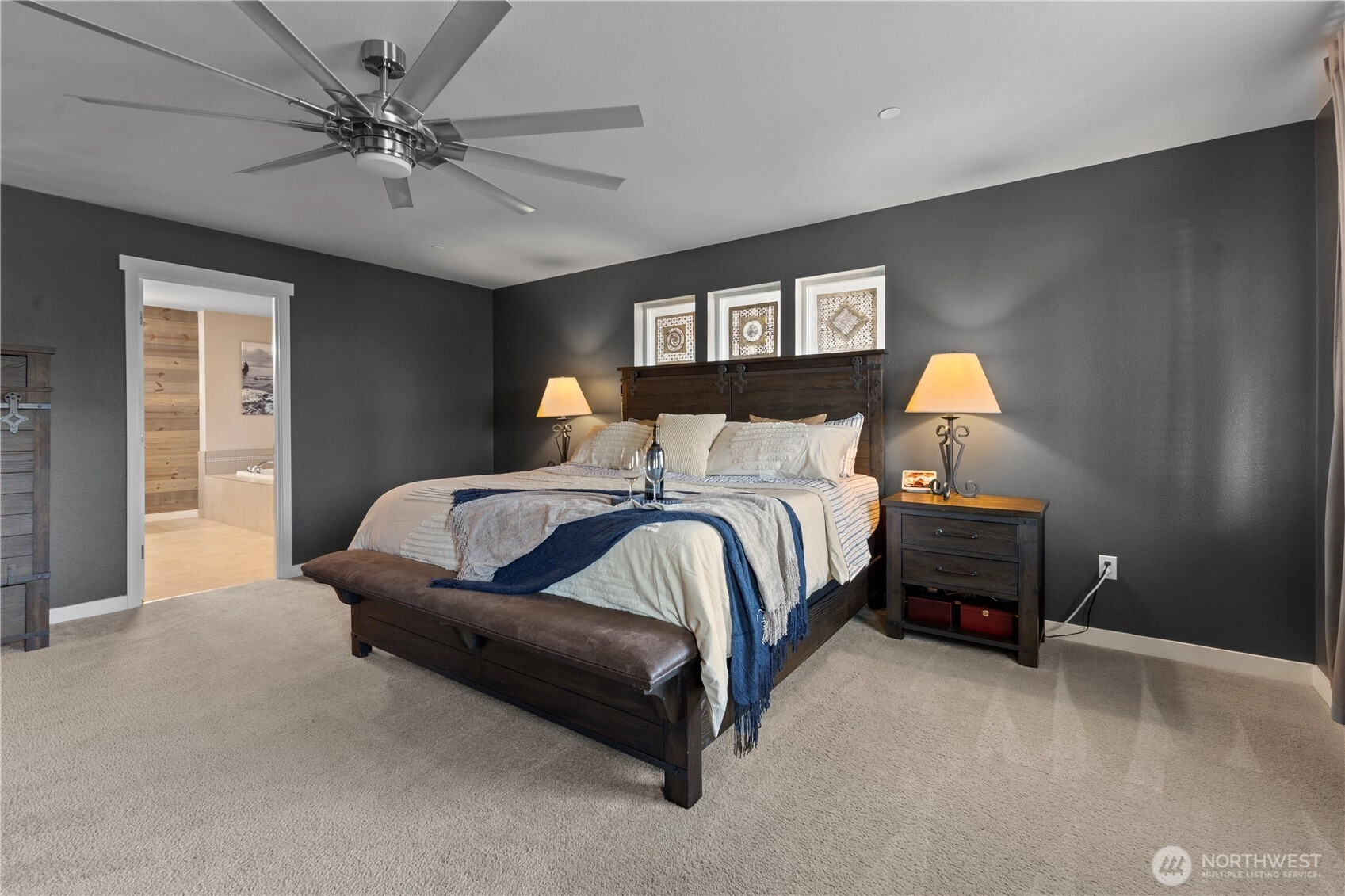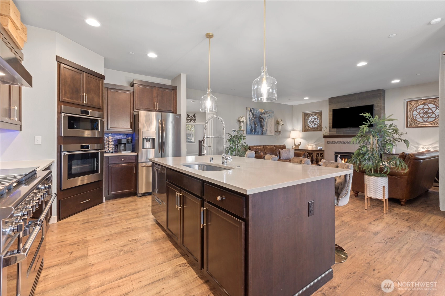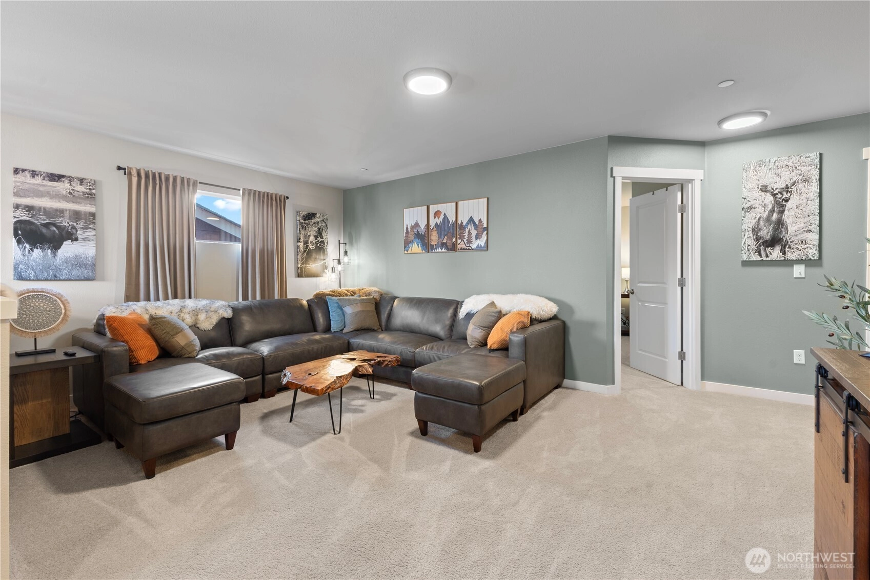 Exceptional Puyallup home backs to a lush greenbelt with flexible spaces designed for modern living. The chef’s Fischer & Paykel kitchen features a butler’s pantry, dedicated wine storage, and new lighting in the kitchen and dining area. A main-level office offers an ideal work-from-home setup, while the upper loft—freshly painted with accent walls—serves as a media room or relaxation space. The spacious primary suite also features fresh paint with accent walls, a custom walk-in closet, and a spa-inspired bath. Two oversized secondary bedrooms enjoy tranquil greenbelt views and share a well-appointed bathroom with dual vanities. Outdoor living is ideal year-round with a large deck, firepit, and covered living area with fireplace. Three-car tandem garage with overhead storage and a new silent garage door opener complete this home. Enjoy a truly zero-maintenance lifestyle with a fully turfed backyard, HOA-maintained front yard, and a full sprinkler system serving both upstairs and downstairs. Smart home features include a Nest thermostat. This is the rare combination of privacy, functionality, and low-maintenance living—move-in ready and built for today’s lifestyle. A MUST SEE!
