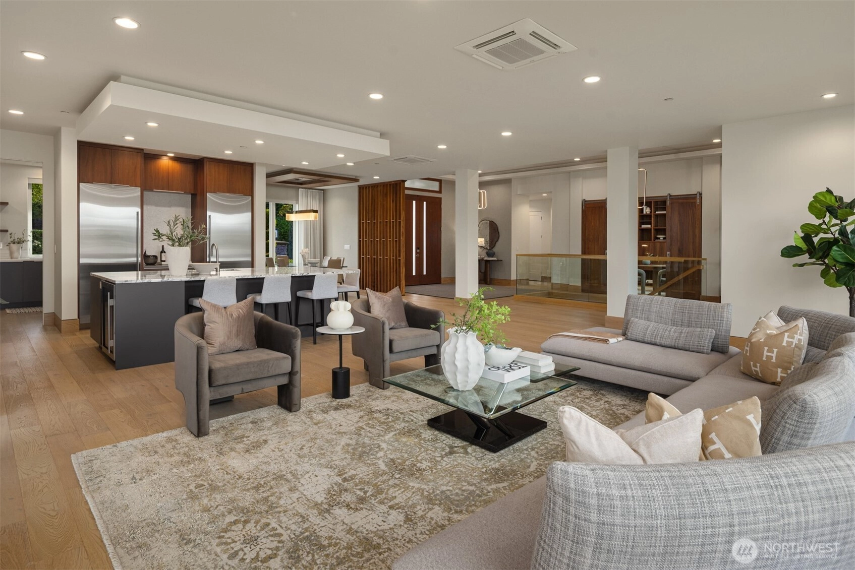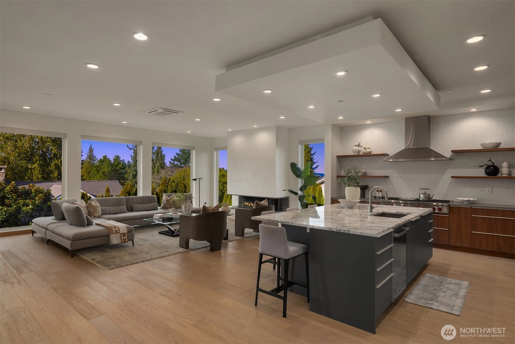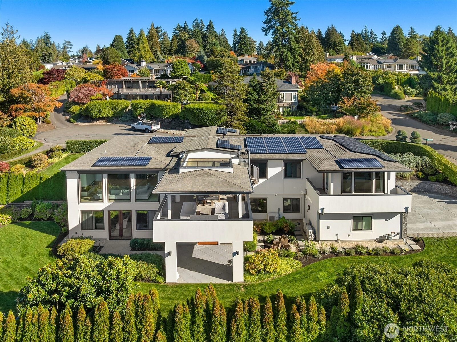 Exceptional custom luxury in the heart of Yarrow Point, this Wayne Dake–built residence offers sweeping views from the rooftop deck and main living areas, enhancing the sense of scale and serenity. This 6,019 sq ft home sits on a 0.347-acre landscaped lot and has undergone a meticulously executed two-million-dollar enhancement, elevating its craftsmanship, technology, and overall living experience. The property offers 5 bedrooms and 5.5 baths with extensive high-end upgrades throughout. Highlights include a spa-like primary suite with heated floors, curated Ann Sacks tilework, custom marble, fully remodeled baths with steam shower, an Ortal fireplace, hardwood floors, and bespoke built-ins. Modern systems include near net-zero solar with battery backup, micro-split climate control in every room, whole-house audio, a media room with 4K projector, enterprise-level networking, and comprehensive security. Smart lighting, an EV charger, a wine room, and lush grounds complete this exceptional offering. A rare opportunity to experience refined luxury living mere minutes from Bellevue, with effortless access to Seattle’s urban conveniences.