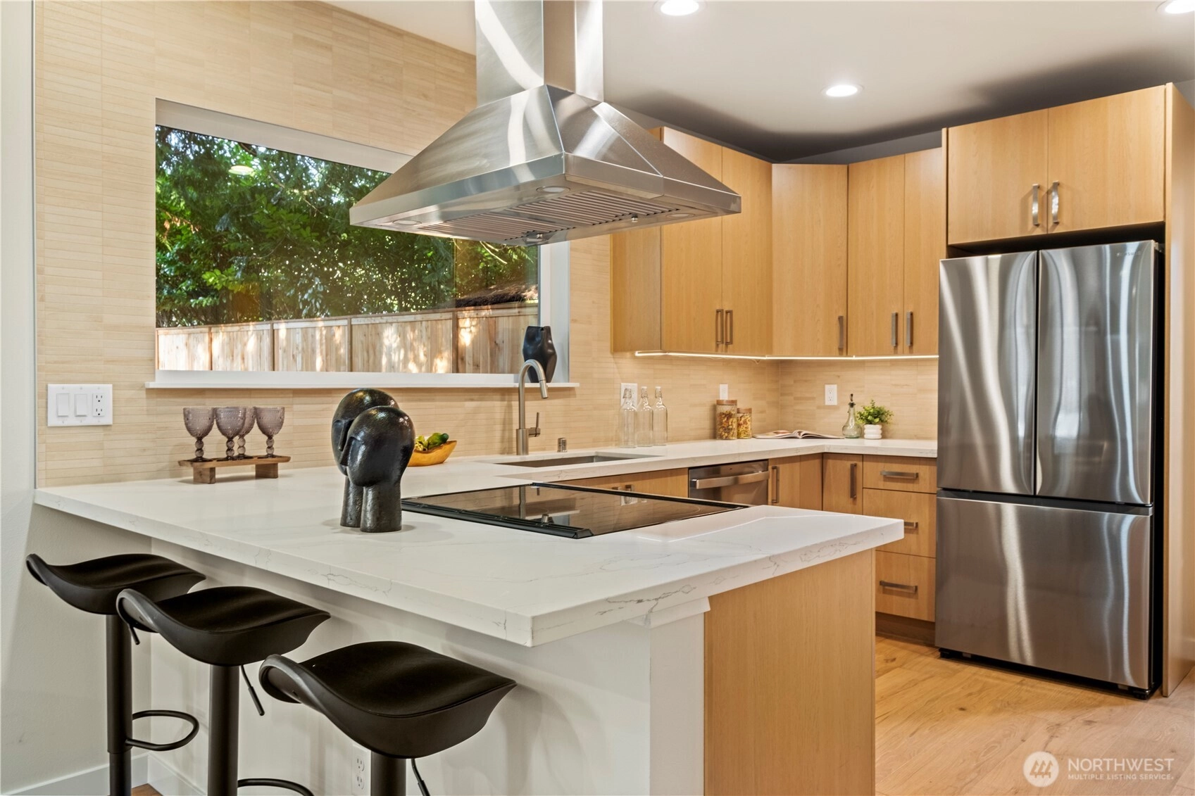 Detached new construction craftsman offering two bedrooms, two off-street parking spaces and a large yard wired for a hot tub or sauna! Designed for comfort and flexibility, this move-in-ready home delivers an efficient layout with inviting indoor and outdoor living spaces. The main level features an open, light-filled living area with room for both lounging and dining. The kitchen anchors the space with sleek new appliances, ample cabinetry, a pantry closet, and a casual breakfast bar for everyday meals. Step outside to a large, private wooded yard and patio - additional power set up to enable a sauna or hot tub. Upstairs, the primary suite provides a peaceful retreat with a walk-in closet and ensuite bath. A second bedroom and full bath offer ideal space for guests or a home office. Located near the Northgate Light Rail for an easy commute, and just 20 minutes to downtown via I-5, this home combines modern style, convenience, and low-maintenance living in a prime location.