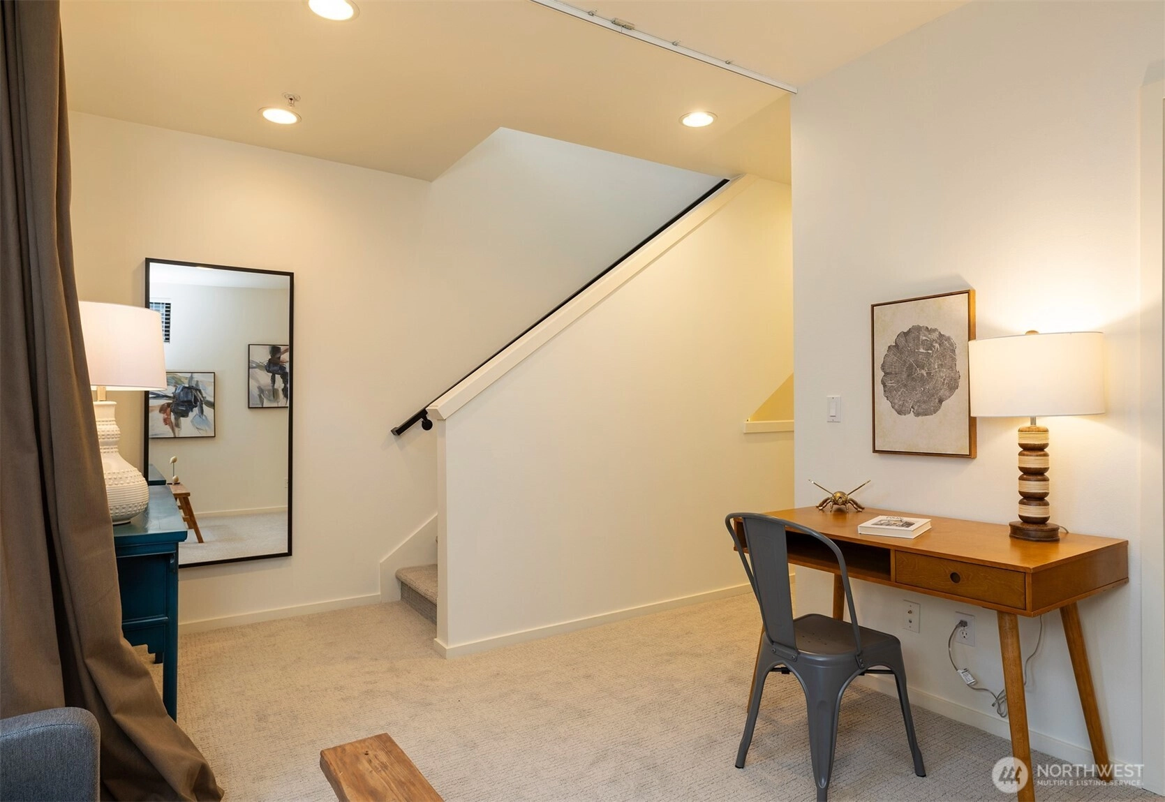 Welcome home to '25 on the Park', a gated community directly across from Cal Anderson Park. Freshly painted w/ new carpet, this 2 bedroom+ flex room, custom townhome features an open living space w/ bamboo floors, granite counters, SS appliances & cherry cabinets. Patio off the main living area is perfect for gardening & BBQ's. The middle floor has the 2nd bedroom, full bath, laundry & versatile den/flex room or spare bedroom w/ direct bath access. The top floor primary en-suite boasts soaring ceilings, a large walk-in closet & private terrace, plus a spiral staircase to the rooftop deck for entertaining & sweeping city views. This private corner end-unit includes 2 secure garage parking & is around the corner to the Light Rail & Pike/Pine dining.