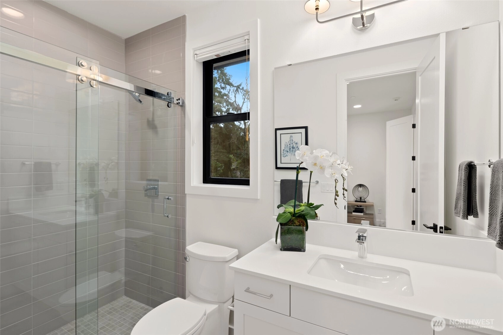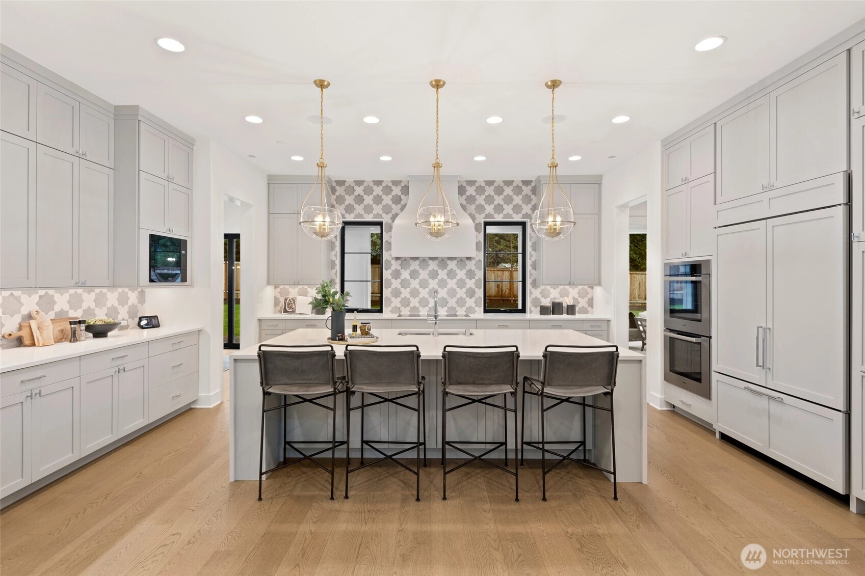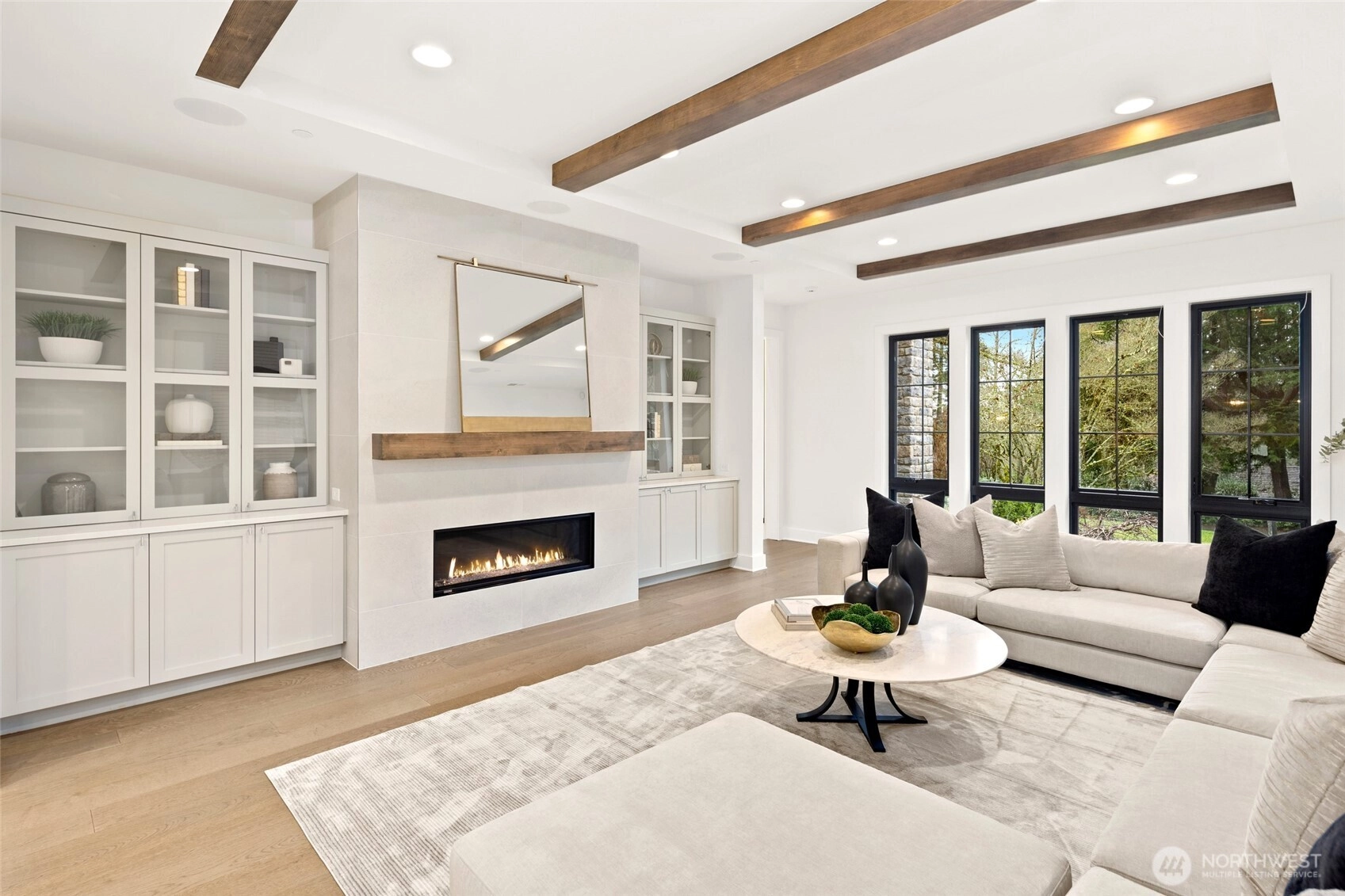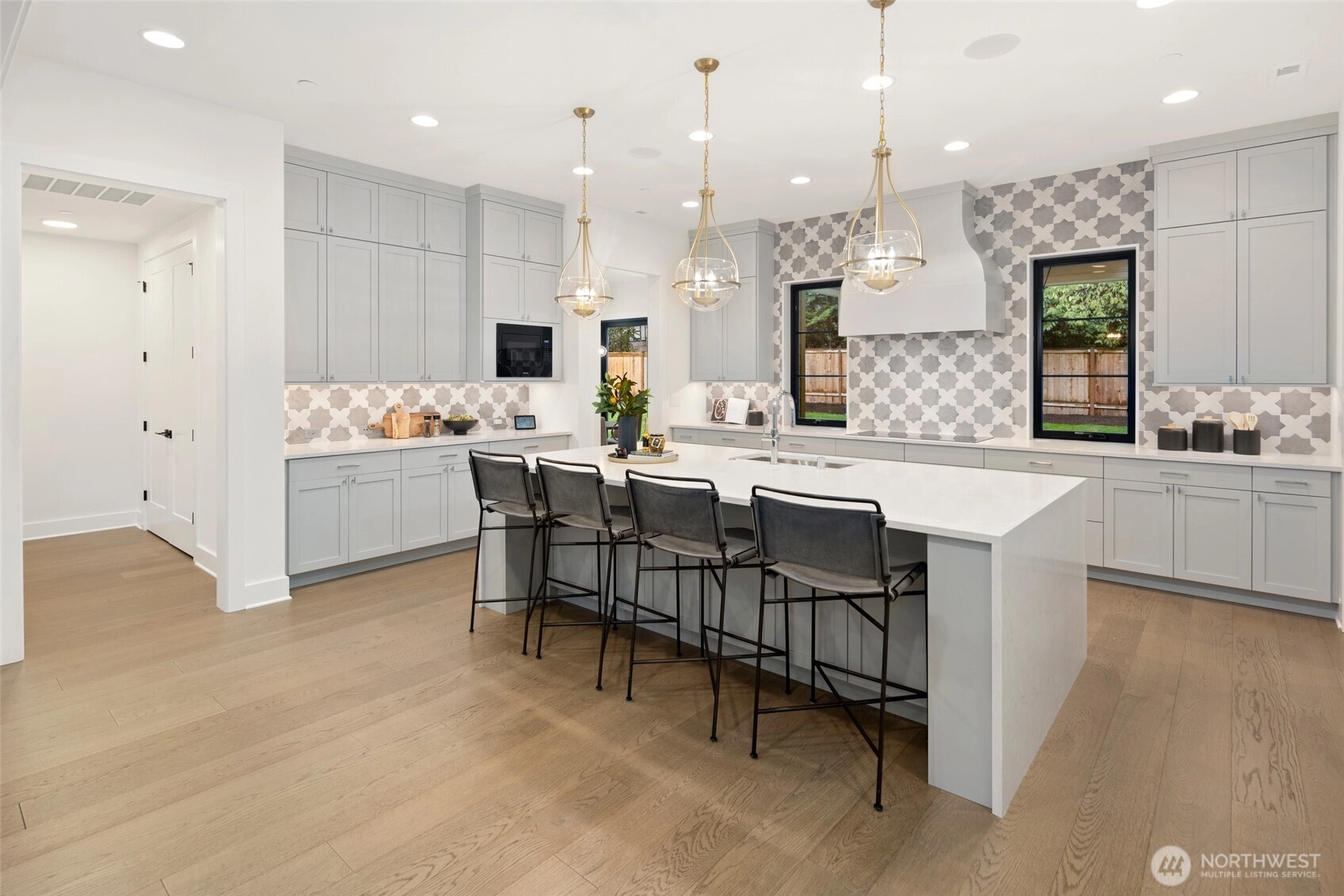 Experience luxury living on Mercer Island with The Astoria, a contemporary farmhouse built by JayMarc Homes. Architectural presence, privacy, and purposeful design define the residence Wide-plank hardwood flooring spans the main level, stairs, upper hall, and primary suite, creating a timeless, cohesive aesthetic. The chef’s kitchen is a centerpiece with quartz countertops, dramatic waterfall island, custom soft-close cabinetry, statement range hood, patterned porcelain backsplash, and refined walk-in pantry—perfect for entertaining. Open-concept living is anchored by a dual-sided stone fireplace and flows to covered outdoor living with skylights, integrated heaters, built-in speakers, and elegant lighting for year-round gatherings. Smart-home integration, whole-home audio, security, solar readiness, and generator capability provide modern comfort. A private ADU with separate entrance offers versatility, including a kitchenette with beverage center, bedroom, and direct access to the main living areas—ideal for guests or executive use. The primary suite is a serene retreat with spa-inspired bath, soaking tub, heated floors, rain shower, metal accents, and bespoke illuminated walk-in wardrobe. Additional highlights include a bonus room, thoughtfully designed service and laundry spaces, and private landscaped yard. JayMarc Homes has earned Best of Houzz Customer Service seven years and Best in Design five years, reflecting creativity, craftsmanship, and dedication.