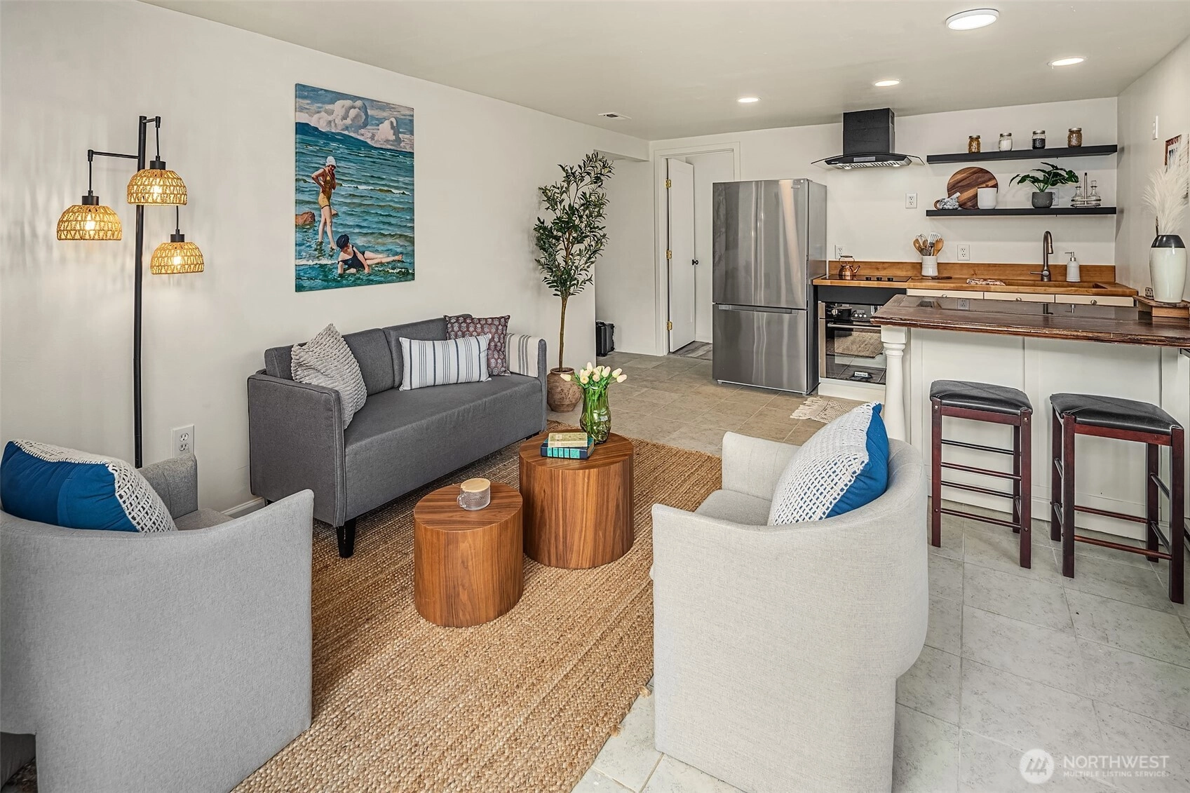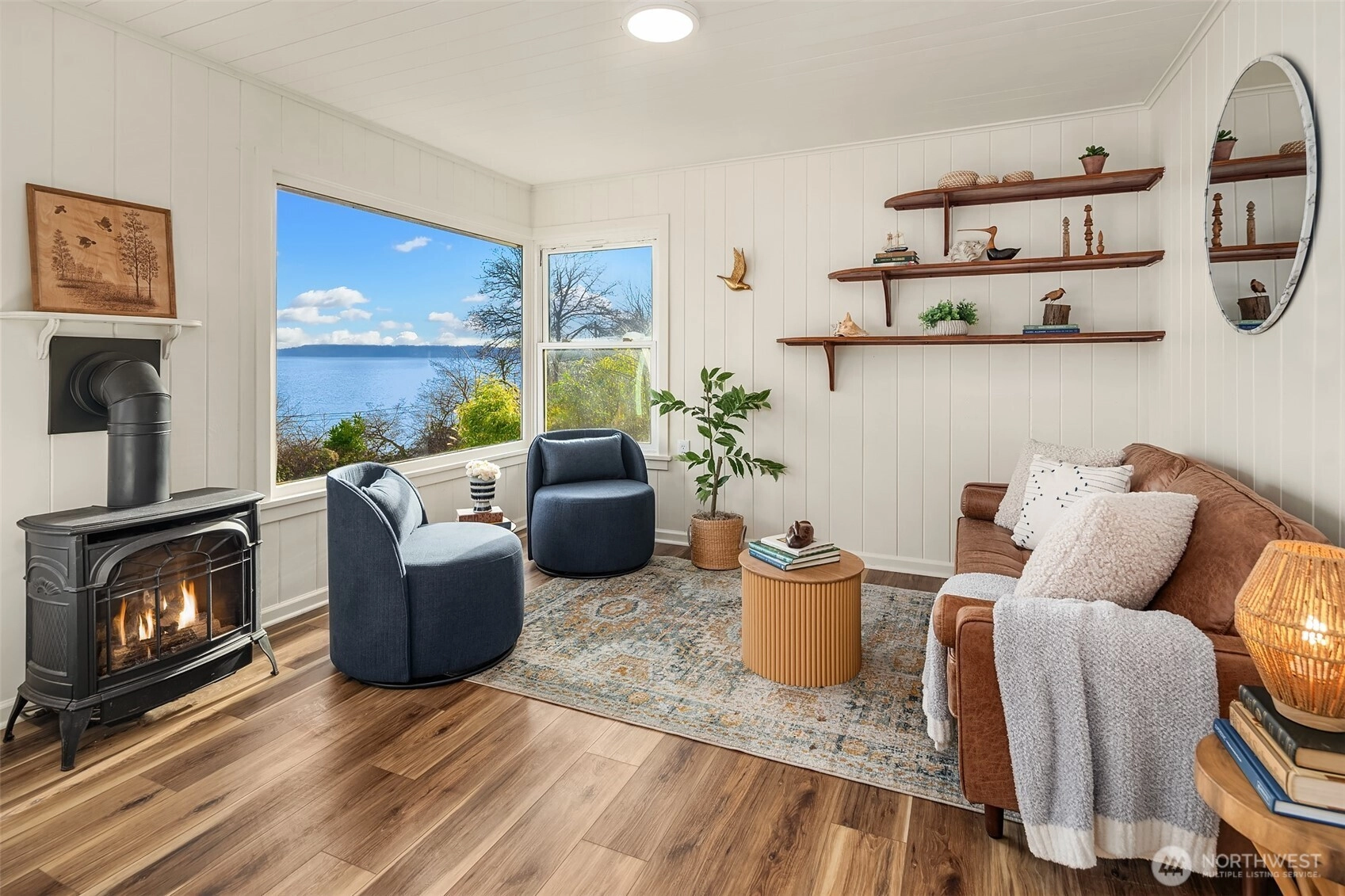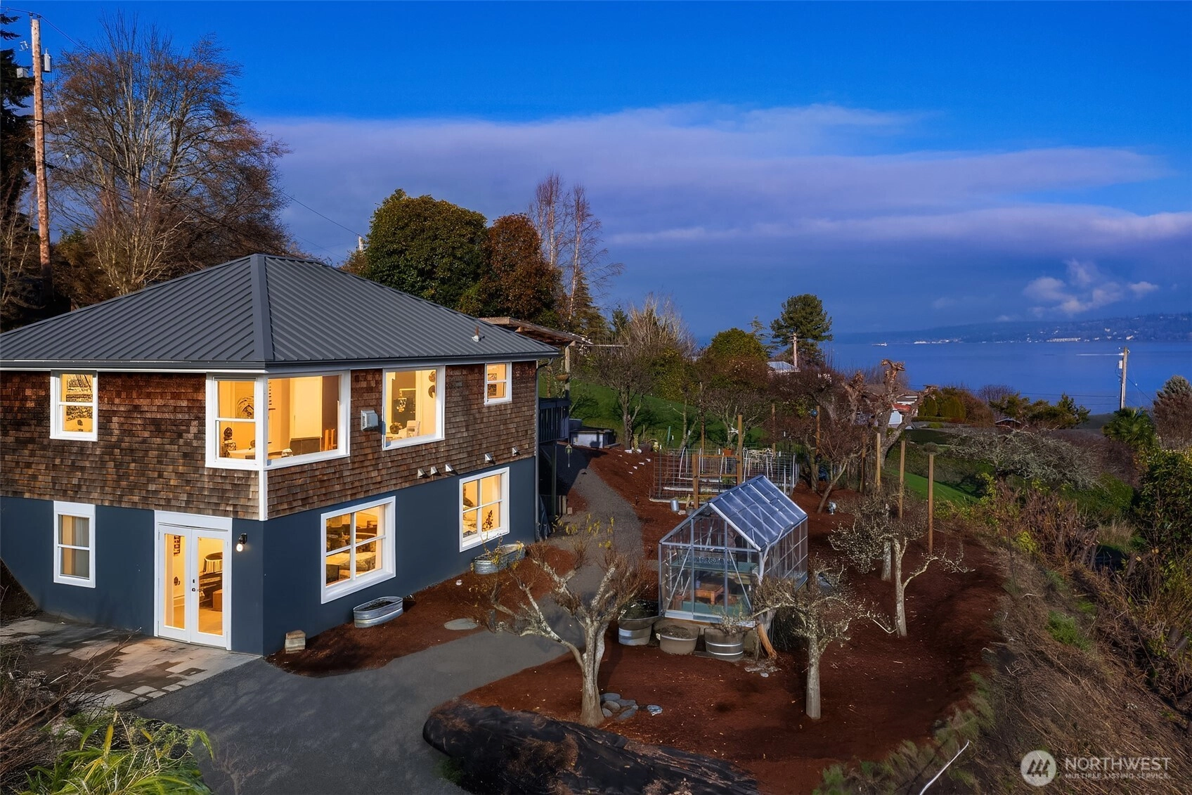 Turn-key cottage with a breezy, beachy feel and unforgettable sunrise and sunset views, including splendid Mt. Rainier and city vistas. Enjoy generous outdoor living with space for fireside chats, relaxing on the deck, and a fenced garden area with greenhouse—tend your garden while soaking in the view! The main level features a cozy kitchen with new range, inviting living room with beautiful views, two bedrooms overlooking the peaceful backyard, and a full bath. The separate daylight basement offers exceptional flexibility with a kitchenette, living space, 3/4 bath, washer/dryer, and two additional rooms ideal for guest quarters, office, or hobby space. Perfect for rental potential, multigenerational living, or hosting overflow. Nestled in the beloved Dilworth area, this home is full of classic Vashon charm and easy island living.