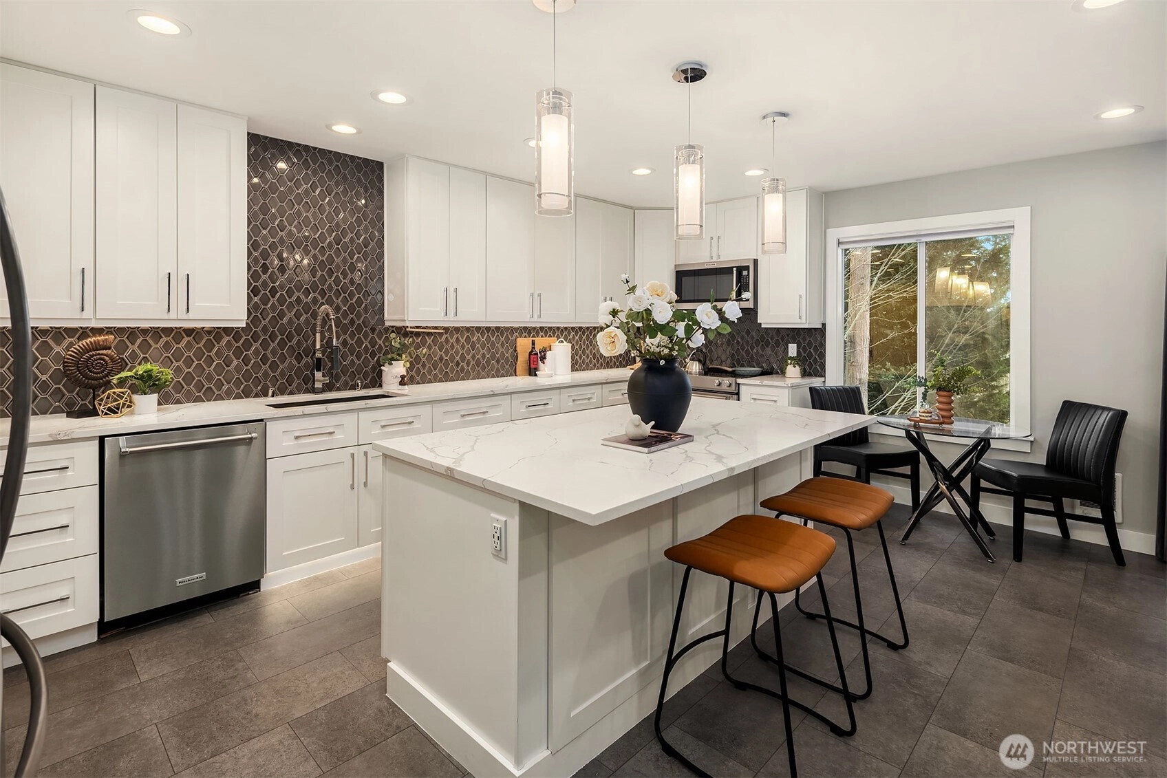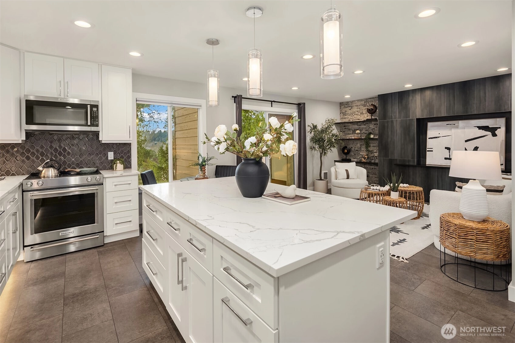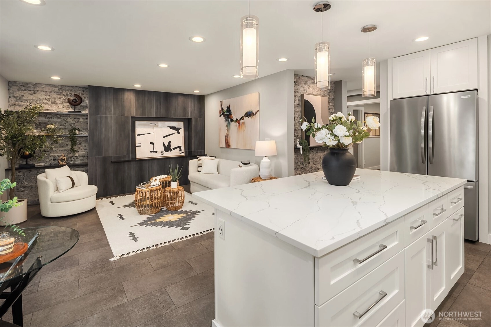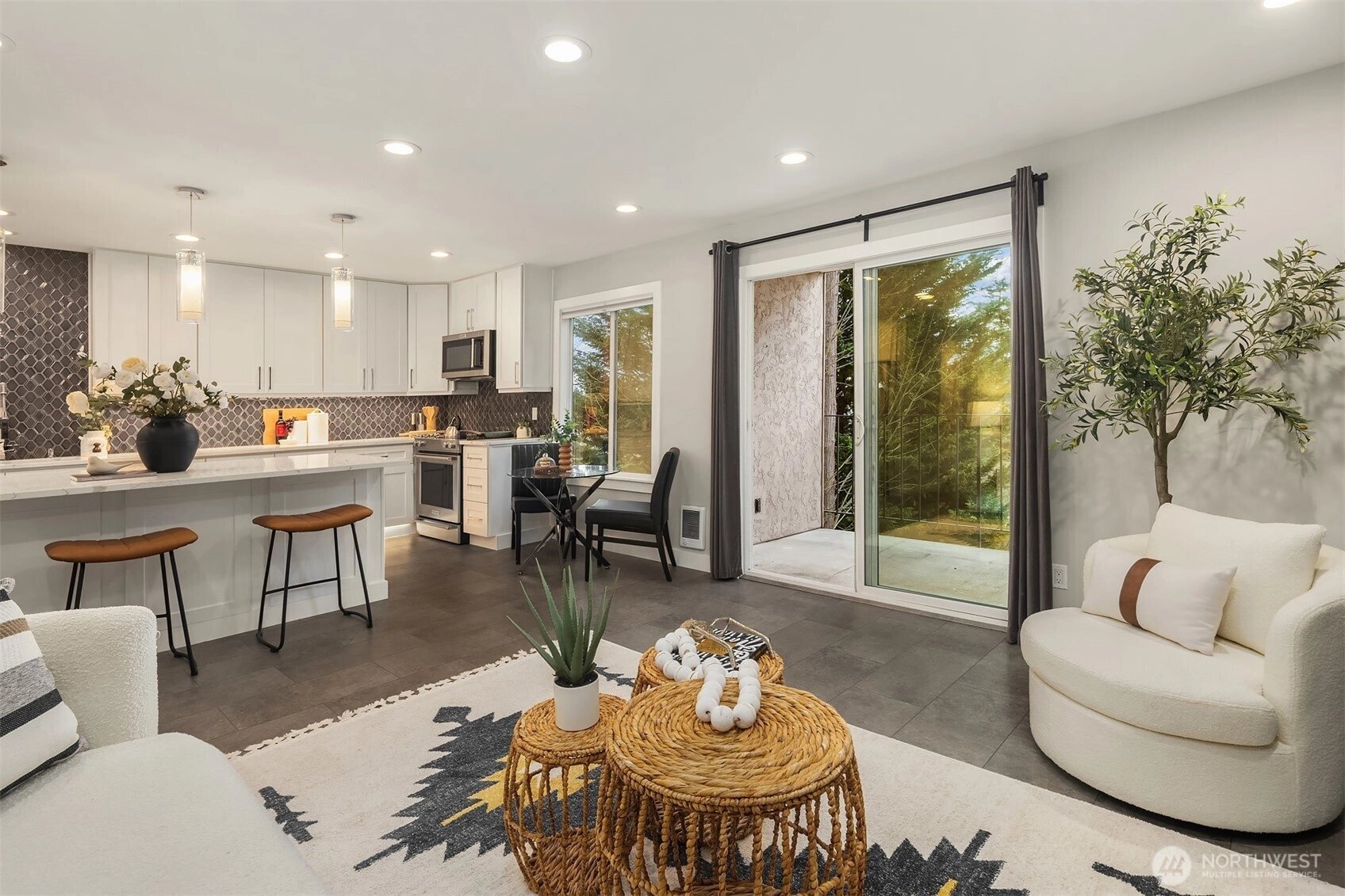 Full top-to-bottom remodeled condo to the highest level. Was originally a 2-bedroom floor plan, but recently converted to a large 963 SF one-bedroom with attached walk-in-closet and desk/office space in the primary suite. Could it be converted back to two bedrooms? Sure, but why would you. The kitchen/living area is a spectacular place to entertain with a magazine-quality remodel. Featuring slab quartz counters, massive island to prep and enjoy great food, all new top-quality stainless appliances. Plus, endless cabinets for your collection of dishes, glassware, cooking accoutrements, espresso makers, blenders, etc. Quality engineered-tile flooring from the entrance foyer to the patio slider, with room for a bistro table, or something larger. Bathroom is hotel-quality, from the marble floors, quartz counters and amazing shower surround. Across the hall is the extremely spacious primary suite with double-door entry, desk/office alcove, and oversized attached walk-in-closet. In addition, there is extra closet space in the hallway, kitchen and two external storage spaces, one on the patio and a 16 SF storage locker in the basement. Don't miss the secure shared bike room in the building. One reserved parking space plus ample guest spaces available. Amazing Kirkland Juanita location walking distance to the beach, restaurants, shopping. Easy commute just minutes to Microsoft, Google, and downtown Kirkland, the fun relaxed neighbor to business-minded Bellevue.