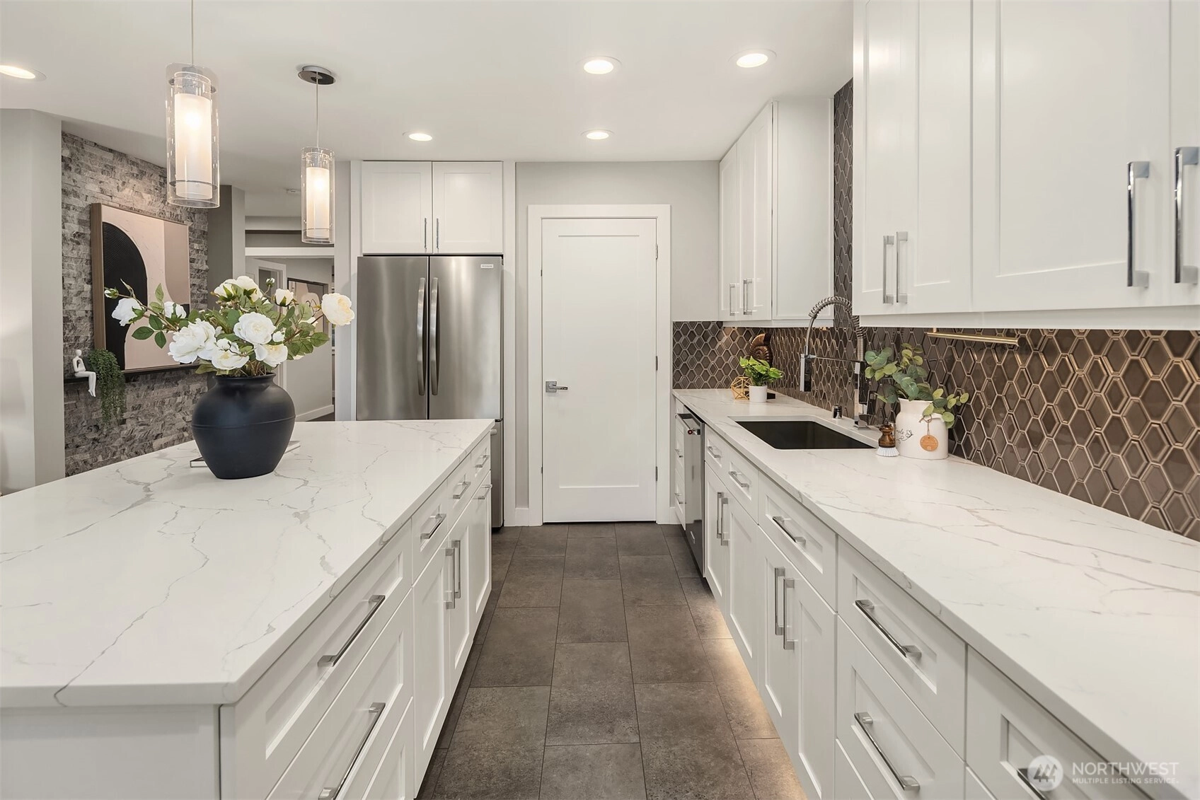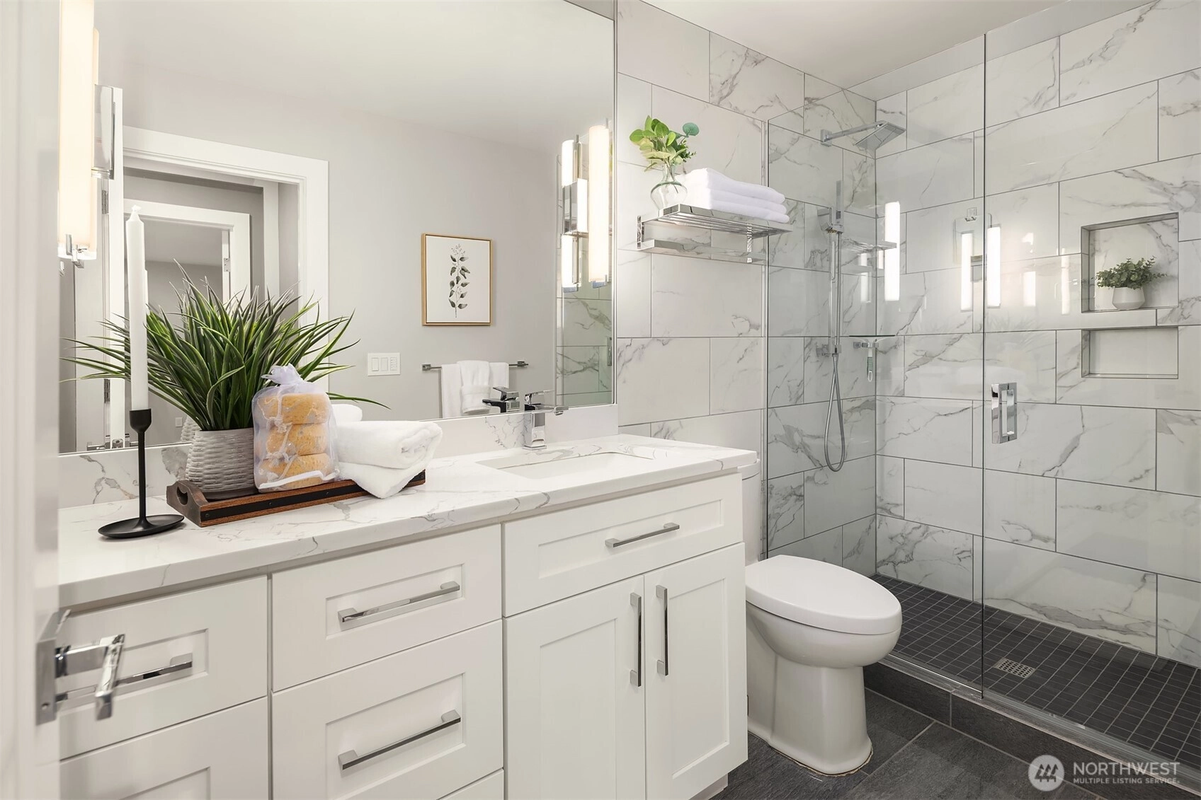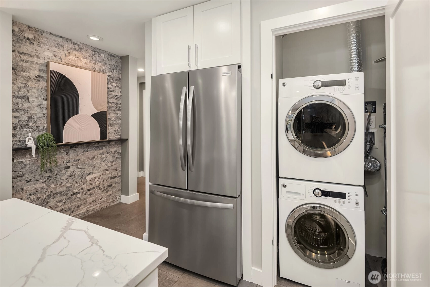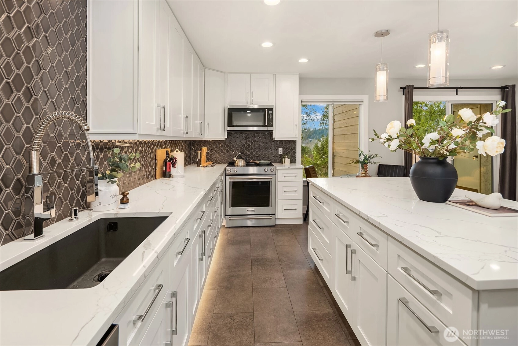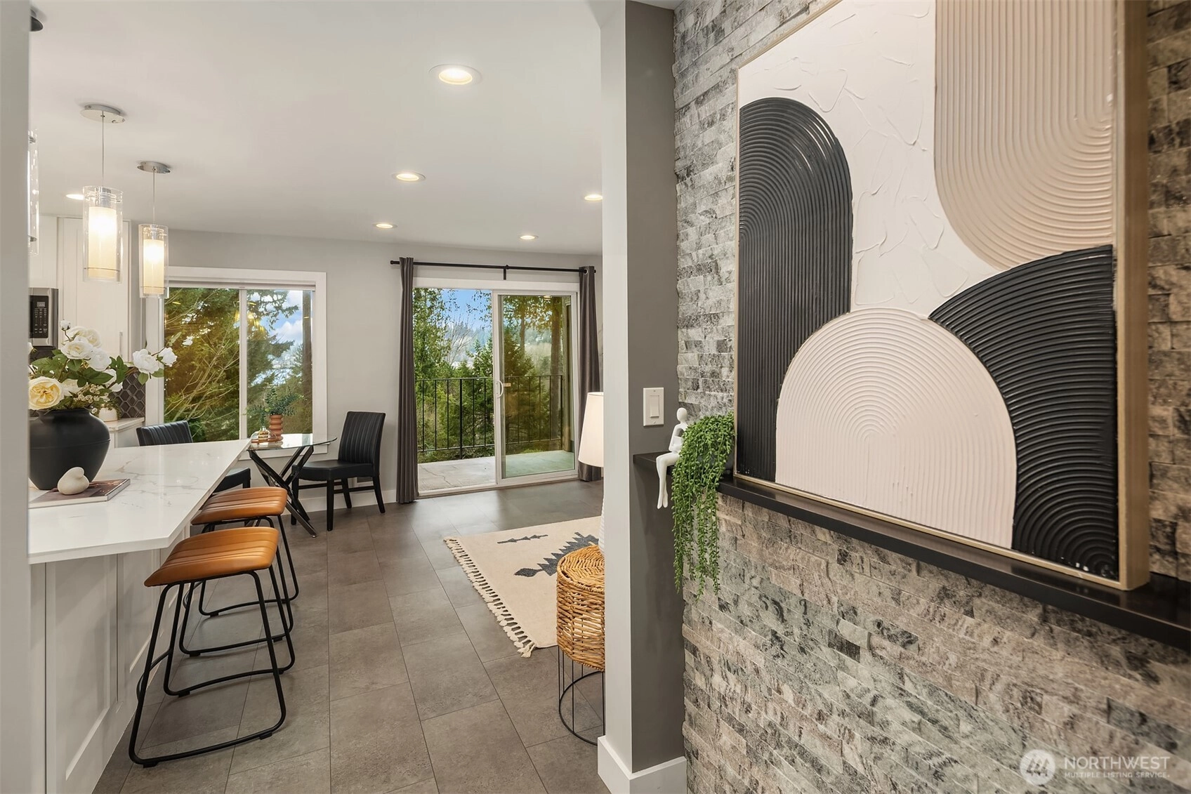 Full top-to-bottom remodeled condo to the highest level. Was originally a 2-bedroom floor plan, but recently converted to a large 963 SF one-bedroom with attached walk-in-closet and desk/office space in the primary suite. Could it be converted back to two bedrooms? Sure, but why would you. The kitchen/living area is a spectacular place to entertain with a magazine-quality remodel. Featuring slab quartz counters, massive island to prep and enjoy great food, all new top-quality stainless appliances. Plus, endless cabinets for your collection of dishes, glassware, cooking accoutrements, espresso makers, blenders, etc. Quality engineered-tile flooring from the entrance foyer to the patio slider, with room for a bistro table, or something larger. Bathroom is hotel-quality, from the marble floors, quartz counters and amazing shower surround. Across the hall is the extremely spacious primary suite with double-door entry, desk/office alcove, and oversized attached walk-in-closet. In addition, there is extra closet space in the hallway, kitchen and two external storage spaces, one on the patio and a 16 SF storage locker in the basement. Don't miss the secure shared bike room in the building. One reserved parking space plus ample guest spaces available. Amazing Kirkland Juanita location walking distance to the beach, restaurants, shopping. Easy commute just minutes to Microsoft, Google, and downtown Kirkland, the fun relaxed neighbor to business-minded Bellevue.