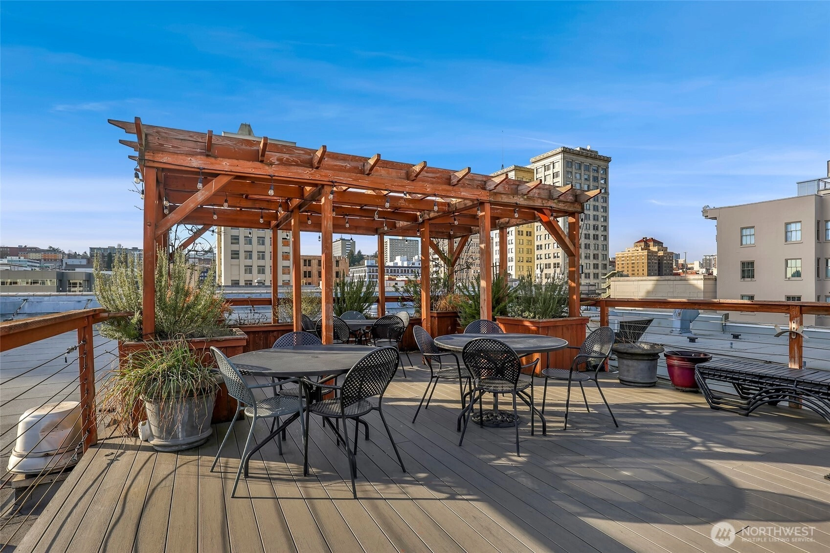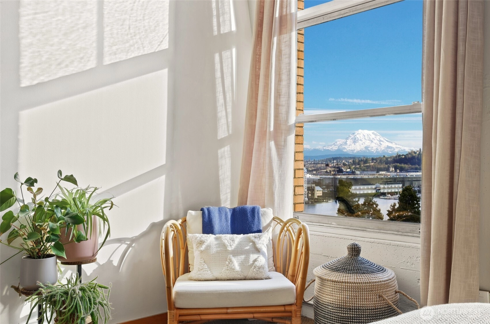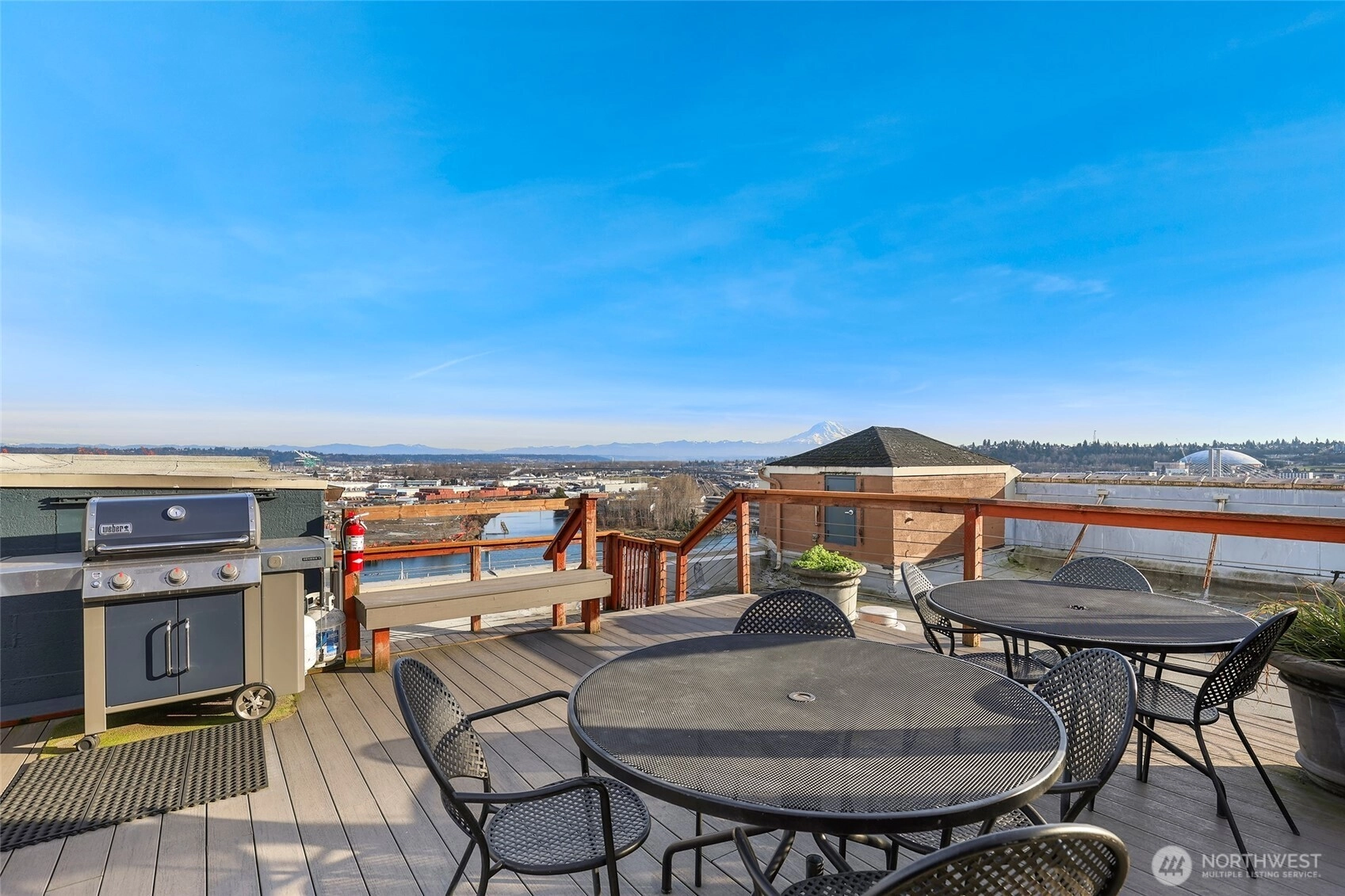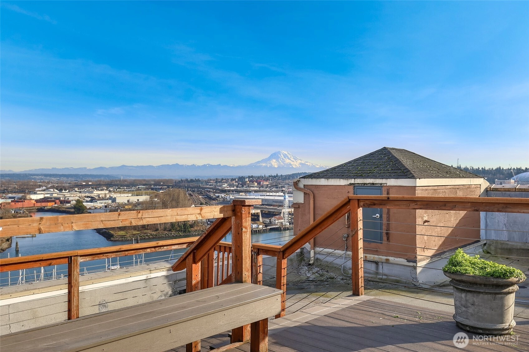 Move-in ready condo with stunning views of Mt. Rainier, the Waterway, and the Tacoma Dome! Located in Cliff Street Lofts, this home blends classic charm with modern living in downtown Tacoma.The bright unit features 14-foot ceilings, exposed industrial beams, and expansive windows. Enjoy an updated kitchen, new light fixtures, built-in curtains, ample storage, and a walk-in closet with a washer/dryer combo.Relax on the rooftop deck with 360-degree views of the city and Commencement Bay. Just steps from entertainment, dining, shopping, UW Tacoma, and the Link Light Rail, with easy access to I-5 and the Sounder. Urban living at its best!