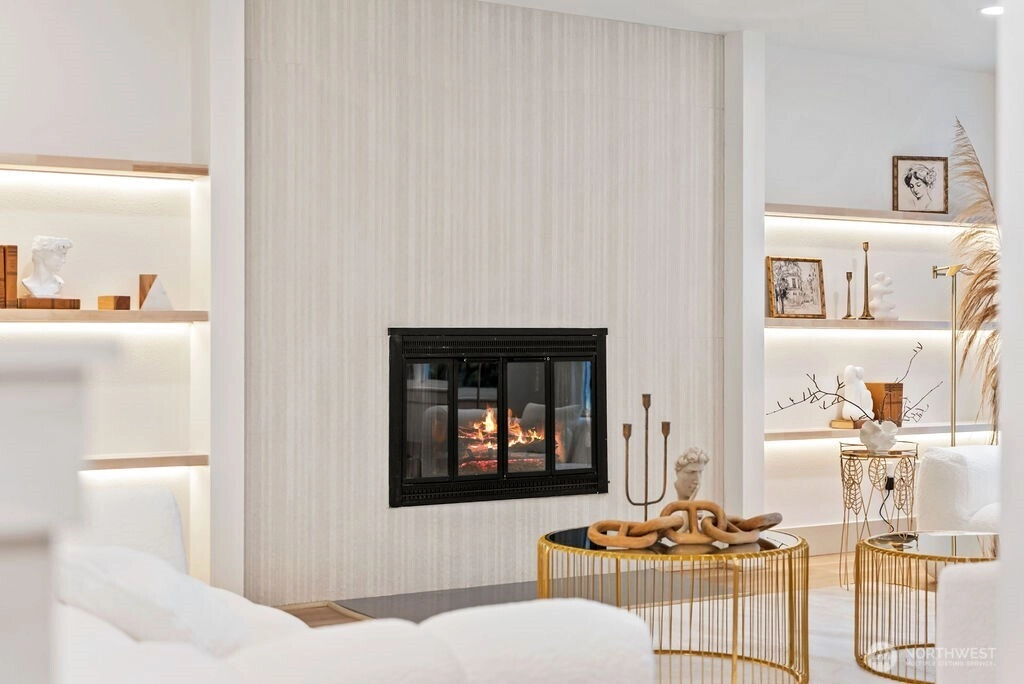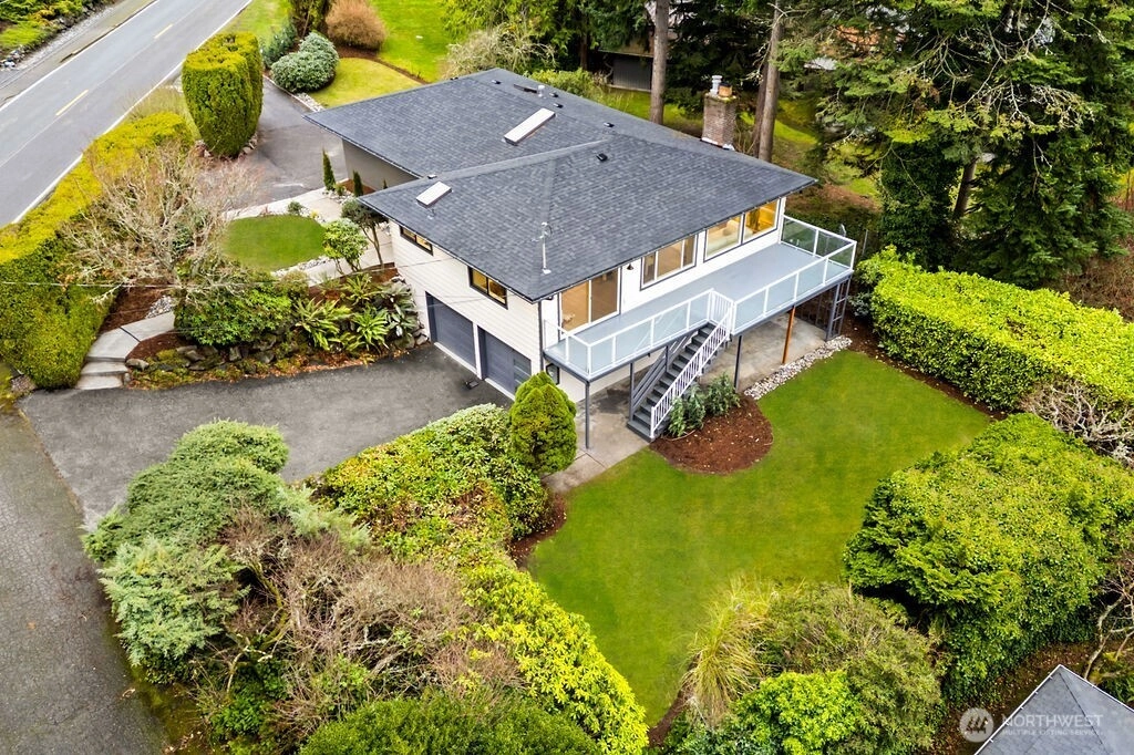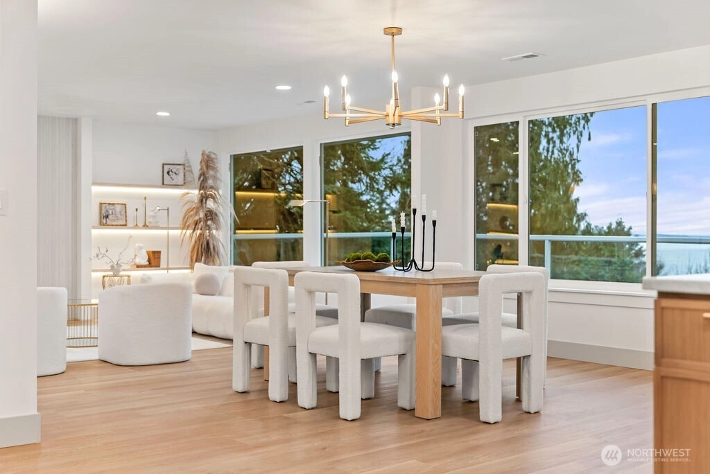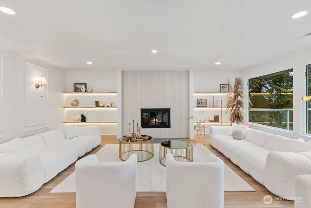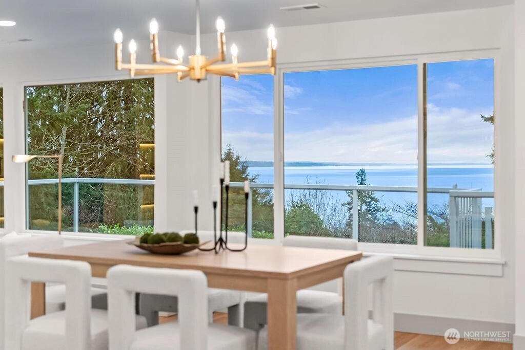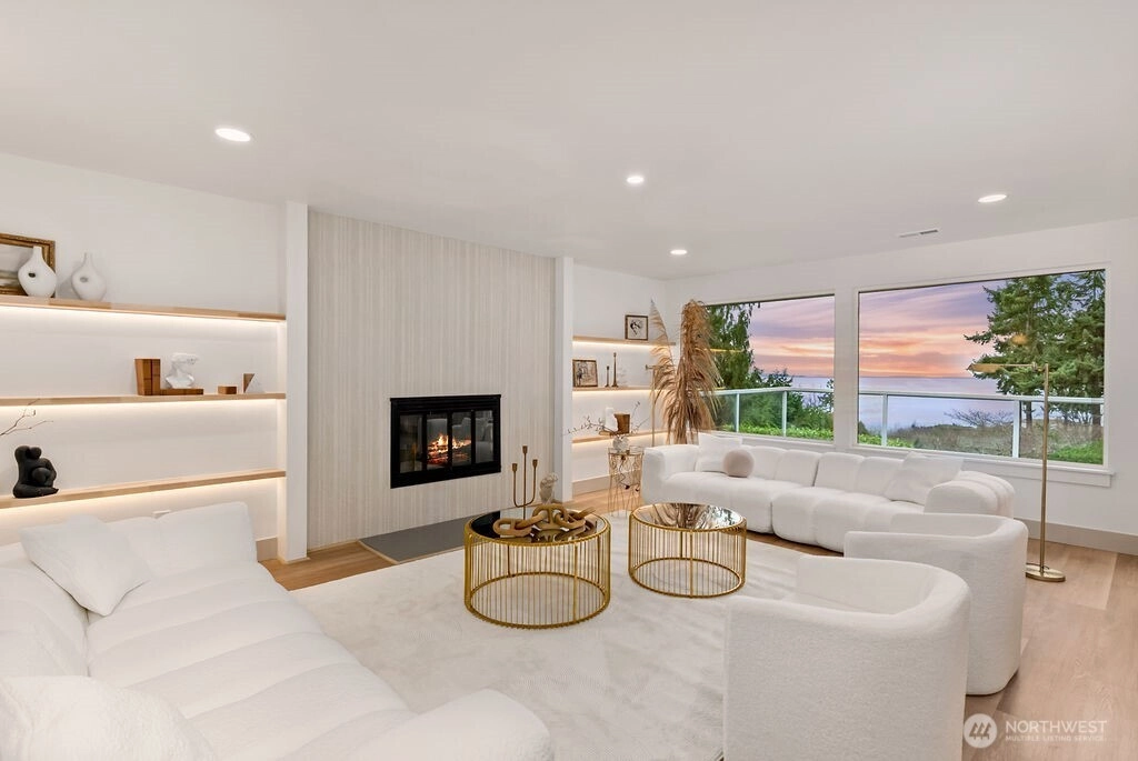 Breathtaking Panoramas. This extraordinary 5-bedroom, 3-bathroom fully remodeled oasis captures sweeping Puget Sound and Olympic Mountain vistas, offering unobstructed beauty and unforgettable sunsets. Designed for both entertaining and everyday living, the home features expansive gathering spaces, seamless flow, and exquisite designer finishes throughout. The chef-inspired kitchen is a showpiece, with custom cabinetry, rare luxury countertops, premium appliances, and refined detailing. The living room is anchored by a striking custom accent wall with floating shelves and integrated lighting, blending warmth and style. The primary suite is a serene retreat with a walk-in closet and spa-inspired bathroom showcasing a dramatic custom “arch shower” with sophisticated tile and fixtures. The main level also includes two additional bedrooms and a beautifully appointed guest bath. The lower level offers two more bedrooms, an expansive family room with a wood-burning fireplace, and flexible space for guests or multi-generational living. Upgrades include a brand-new roof, new electrical panel, high-efficiency furnace, heat pump, water heater, custom stair lighting, and extra parking with a rare roundabout driveway. Every detail exudes luxury and comfort—this is an elevated lifestyle in a home that truly takes your breath away. Welcome home.