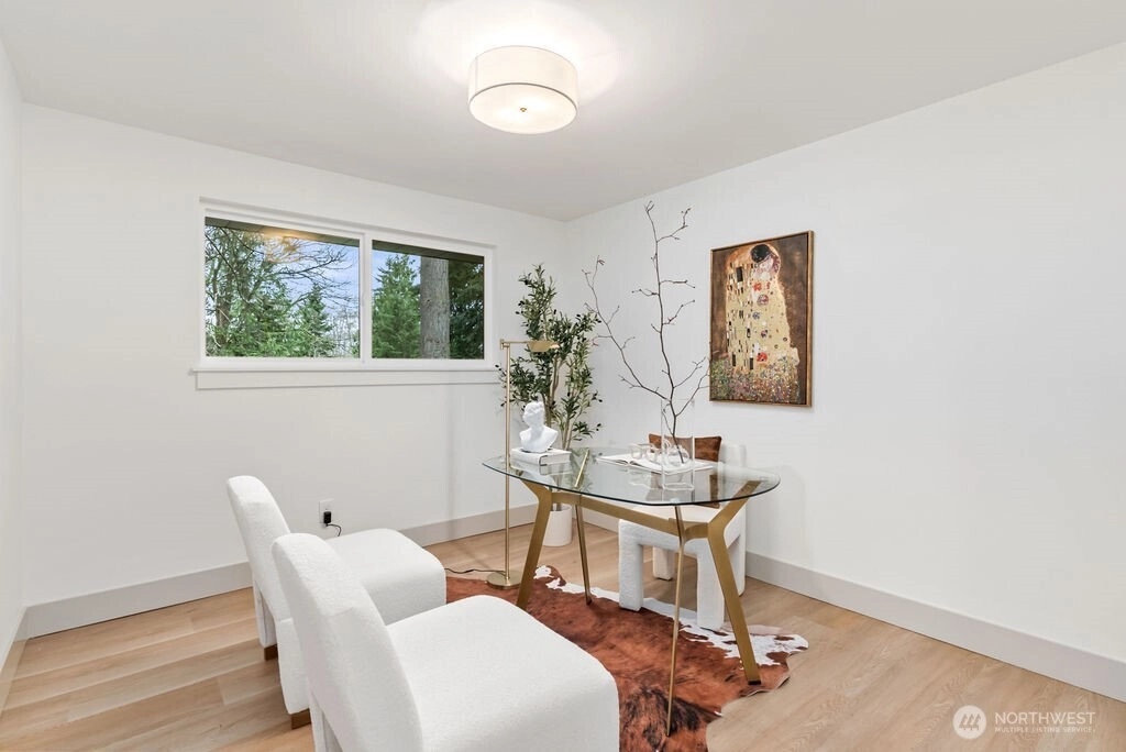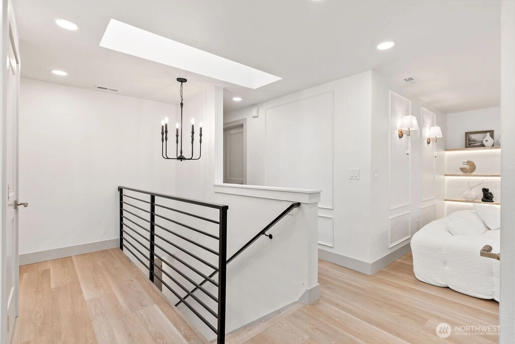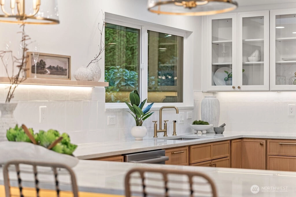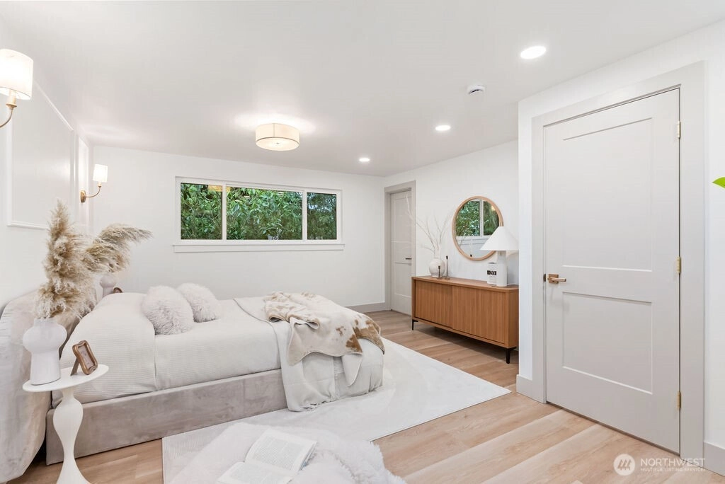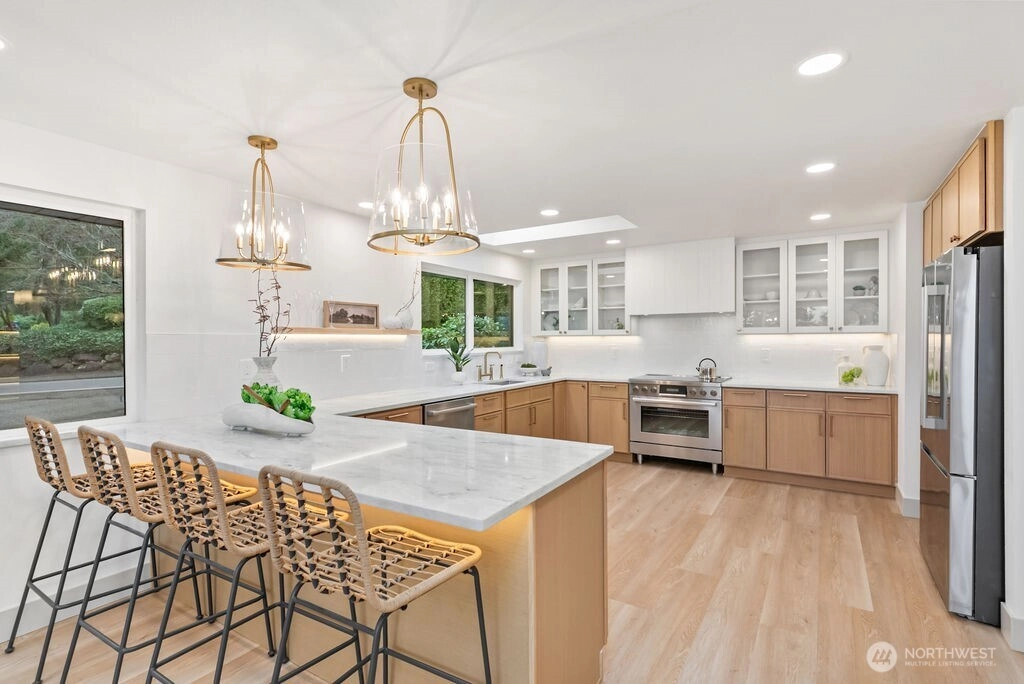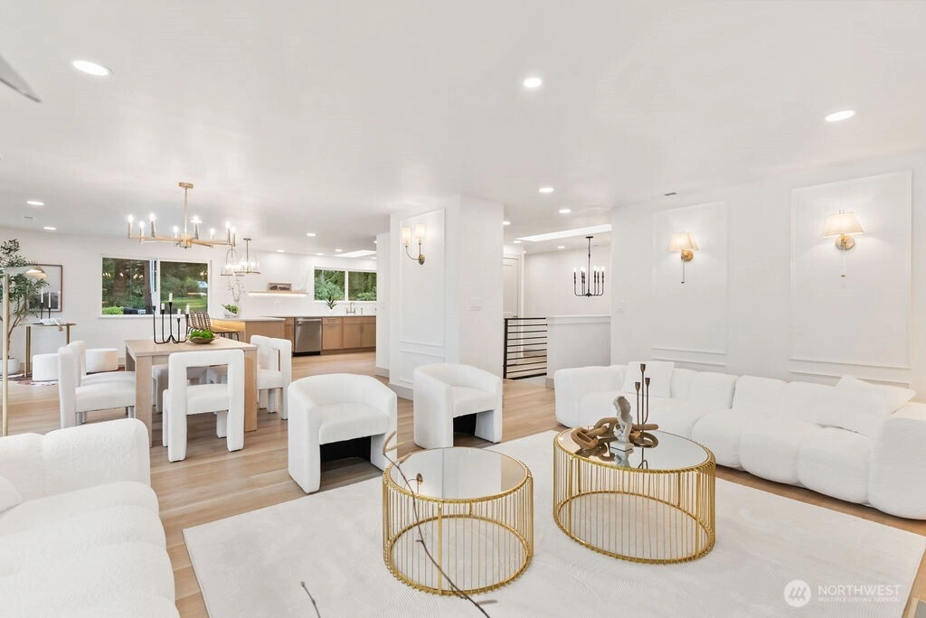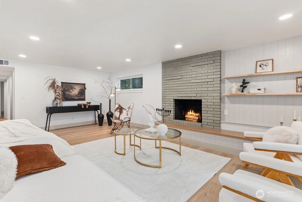 Breathtaking Panoramas. This extraordinary 5-bedroom, 3-bathroom fully remodeled oasis captures sweeping Puget Sound and Olympic Mountain vistas, offering unobstructed beauty and unforgettable sunsets. Designed for both entertaining and everyday living, the home features expansive gathering spaces, seamless flow, and exquisite designer finishes throughout. The chef-inspired kitchen is a showpiece, with custom cabinetry, rare luxury countertops, premium appliances, and refined detailing. The living room is anchored by a striking custom accent wall with floating shelves and integrated lighting, blending warmth and style. The primary suite is a serene retreat with a walk-in closet and spa-inspired bathroom showcasing a dramatic custom “arch shower” with sophisticated tile and fixtures. The main level also includes two additional bedrooms and a beautifully appointed guest bath. The lower level offers two more bedrooms, an expansive family room with a wood-burning fireplace, and flexible space for guests or multi-generational living. Upgrades include a brand-new roof, new electrical panel, high-efficiency furnace, heat pump, water heater, custom stair lighting, and extra parking with a rare roundabout driveway. Every detail exudes luxury and comfort—this is an elevated lifestyle in a home that truly takes your breath away. Welcome home.