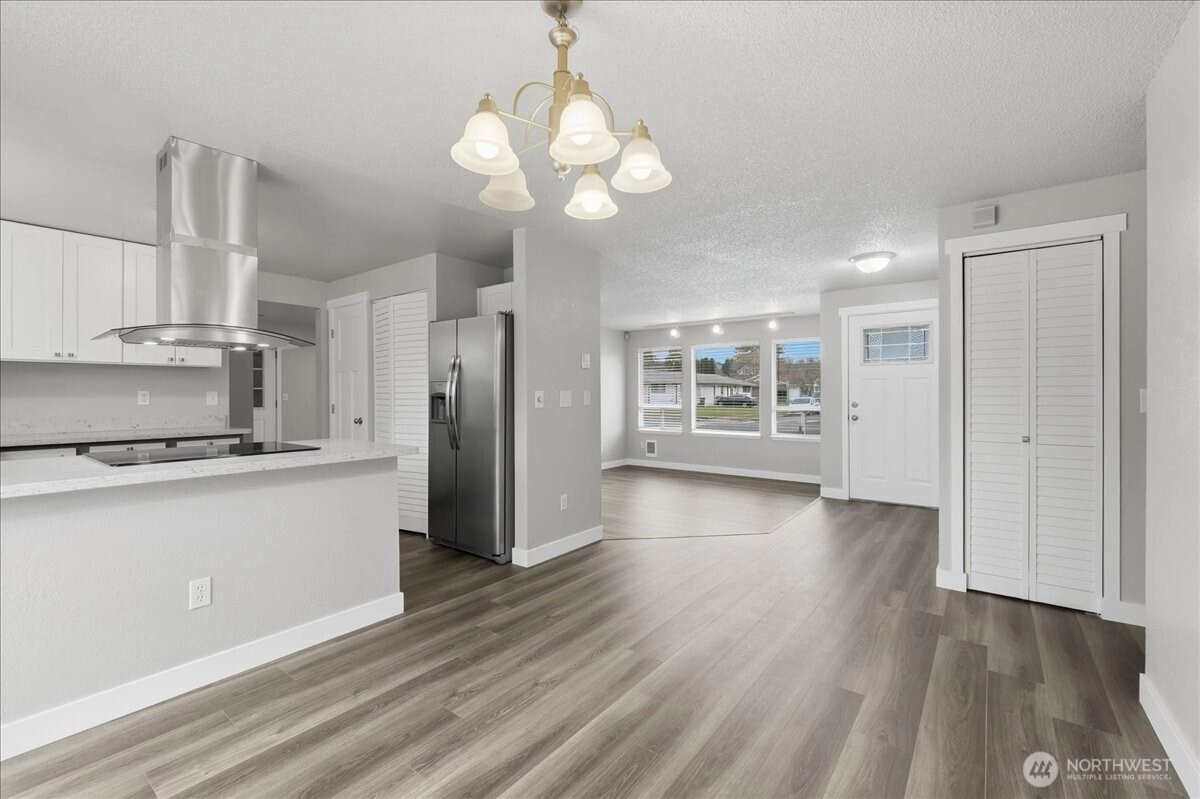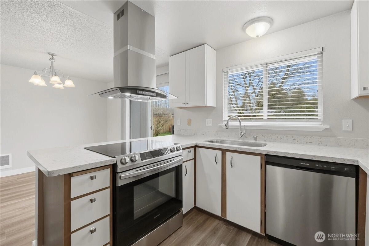 Slow down to settle into your new location where convenience meets comfort. This turnkey, 1-story home offers 3 bdrms & professionally upgraded THRU-OUT. Rich new LVP flooring & fresh interior paint creates a bright, inviting atmosphere from the moment you enter. The open kitchen shines with new white cabinetry, stainless steel appliances, and a modern stainless steel range hood with a sleek glass cooktop—perfectly placed to enhance both function and style. The kitchen connects effortlessly to the family room making it easy to cook, relax & spend time together. Kitchen bar seats 2 comfortably next to glass sliders that open to a fenced backyard. Updated bathrooms feature fixture replacements, stylish vanity & sink, adding a crisp, modern touch that today’s buyers are looking for. Each bedroom is finished with white doors, trim, & windows are dressed with magnetic pull-down blinds for privacy & ease. EZ walking distance to downtown, shopping centers, schools in Sumner, minutes to the freeway interchanges 512,167,410 & Sounder. Move-in ready on a large fenced lot, waiting to "Welcome You Home."