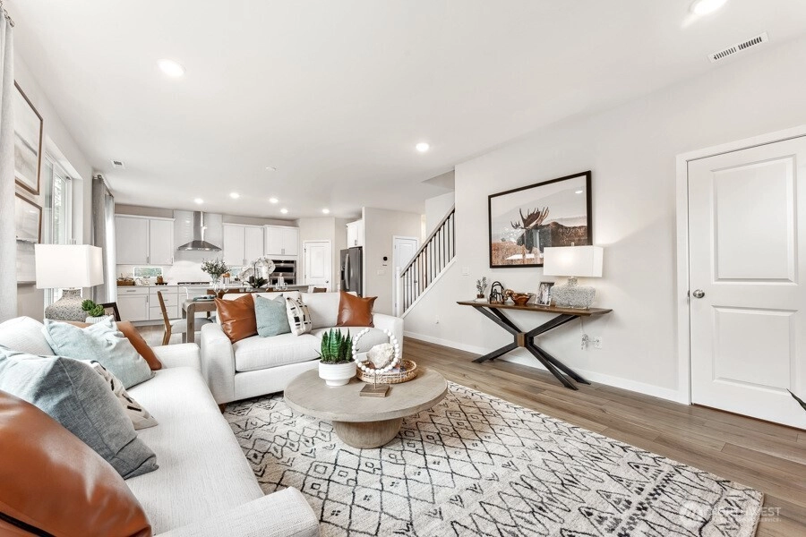 This new construction Corner Lot Bennett at Liberty Bay Vista will be ready for a June/July Move-In, featuring nearly 2400 sq ft, 4 bedrooms, 3 baths and a 2-car garage. The main level features an open great room anchored by a cozy gas fireplace + a convenient main-floor bedroom and bath with a tiled walk-in shower, ideal for guests or multi-generational living. The gourmet chef’s island kitchen includes 42" soft-close white solid-wood cabinetry, quartz countertops, tile backsplash, under-cabinet lighting, a gas cooktop, built-in wall oven/microwave, and walk-in pantry. Enjoy summer sunsets and peek-a-boo views from the welcoming front porch. Fully landscaped front and backyards offer a covered patio and rear fence at the backyard for private outdoor living. Upstairs, the owner’s suite impresses with wide windows, a walk-in closet, and 5 piece en-suite bath featuring raised-height dual undermount sink vanity with quartz countertops, a soaking tub, and tiled walk-in shower with heavy frameless glass. The expansive loft separates the primary from two generously sized secondary bedrooms that share a full hall bath, also with raised-height dual undermount sink vanity, quartz counters, and tub/shower with tile surround. The Laundry room includes a sink and cabinetry. Only Minutes to Bainbridge and Kingston ferries. All 3 North Kitsap schools & downtown Poulsbo waterfront shopping/dining are just steps away! Buyer’s Broker must accompany and/or register Buyer at/before first visit.