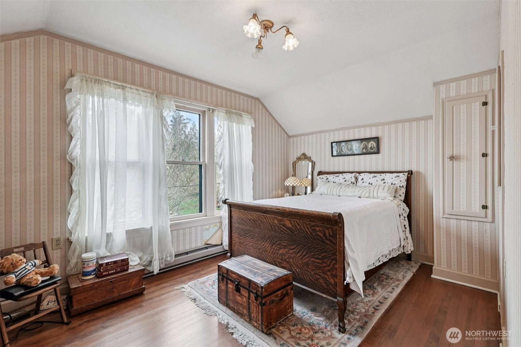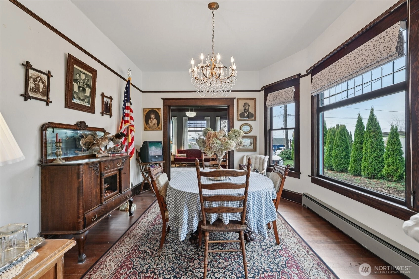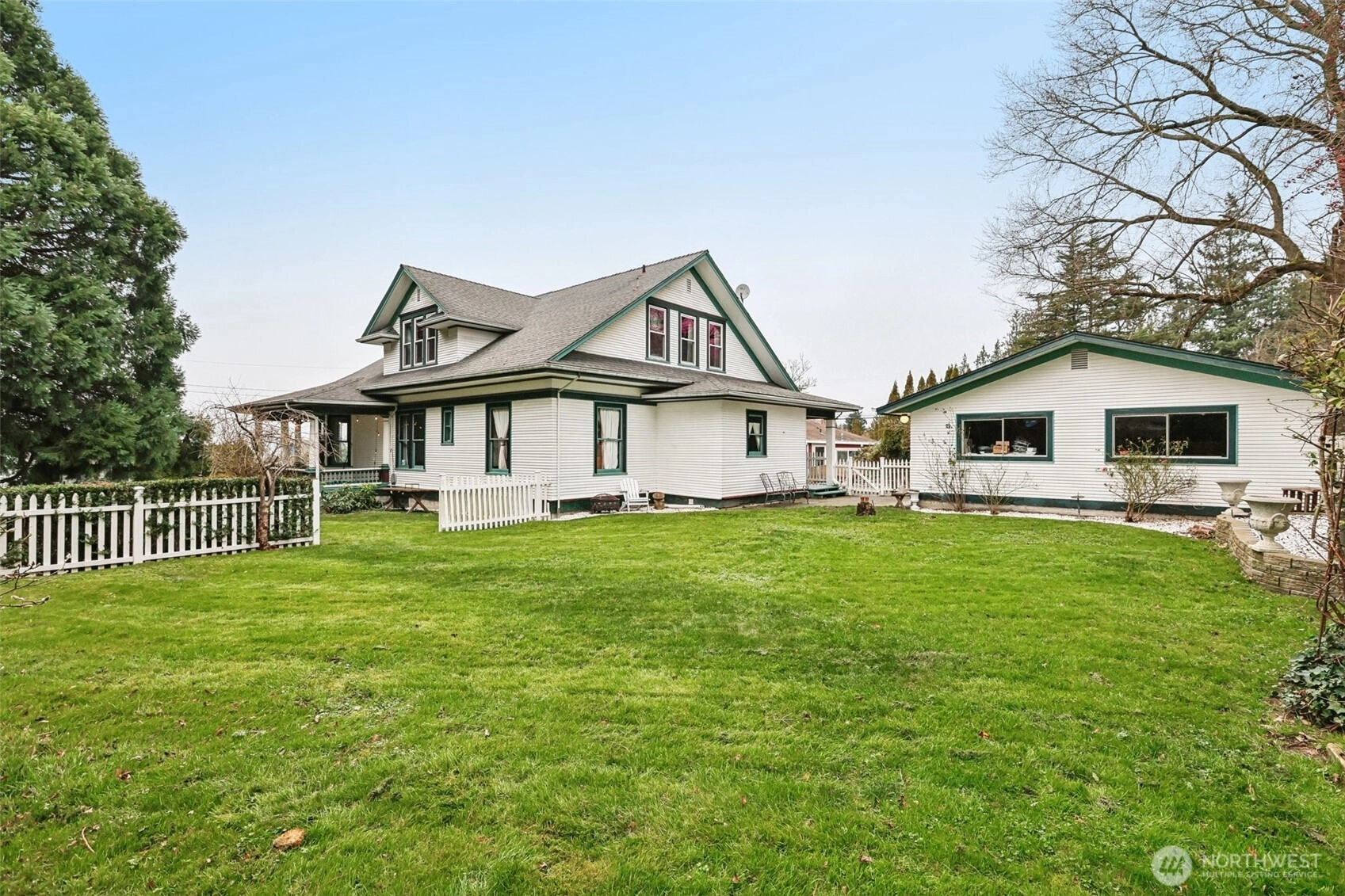 Perched gracefully on the hill, this 1918 historic manor tells a story of craftsmanship, care, and timeless elegance. From the moment you arrive, the wraparound porch invites slow mornings with coffee and sweeping territorial views. Inside, original fir floors, rich wood trim, and built-in cabinetry reflect over a century of thoughtful design. Sunlight filters through 100-year-old beveled windows, illuminating rare Steuben Glass light fixtures and preserved period details throughout. With four bedrooms and two baths, the home blends livability with legacy. Immaculately maintained and celebrated as a 2019 Stanwood newspaper cover feature, this is a rare opportunity to own a piece of history—beautifully lived in and lovingly preserved.