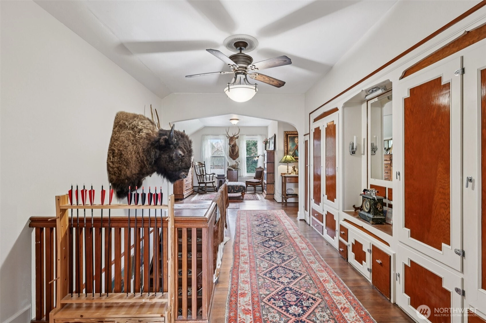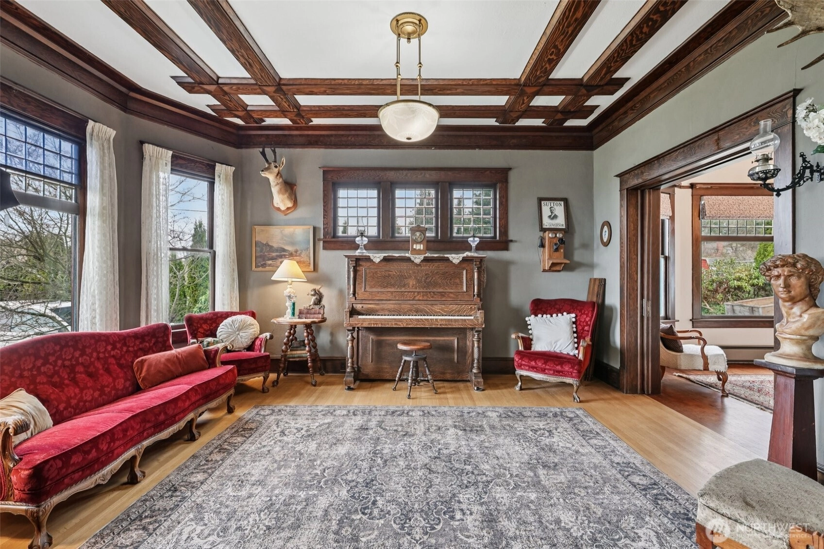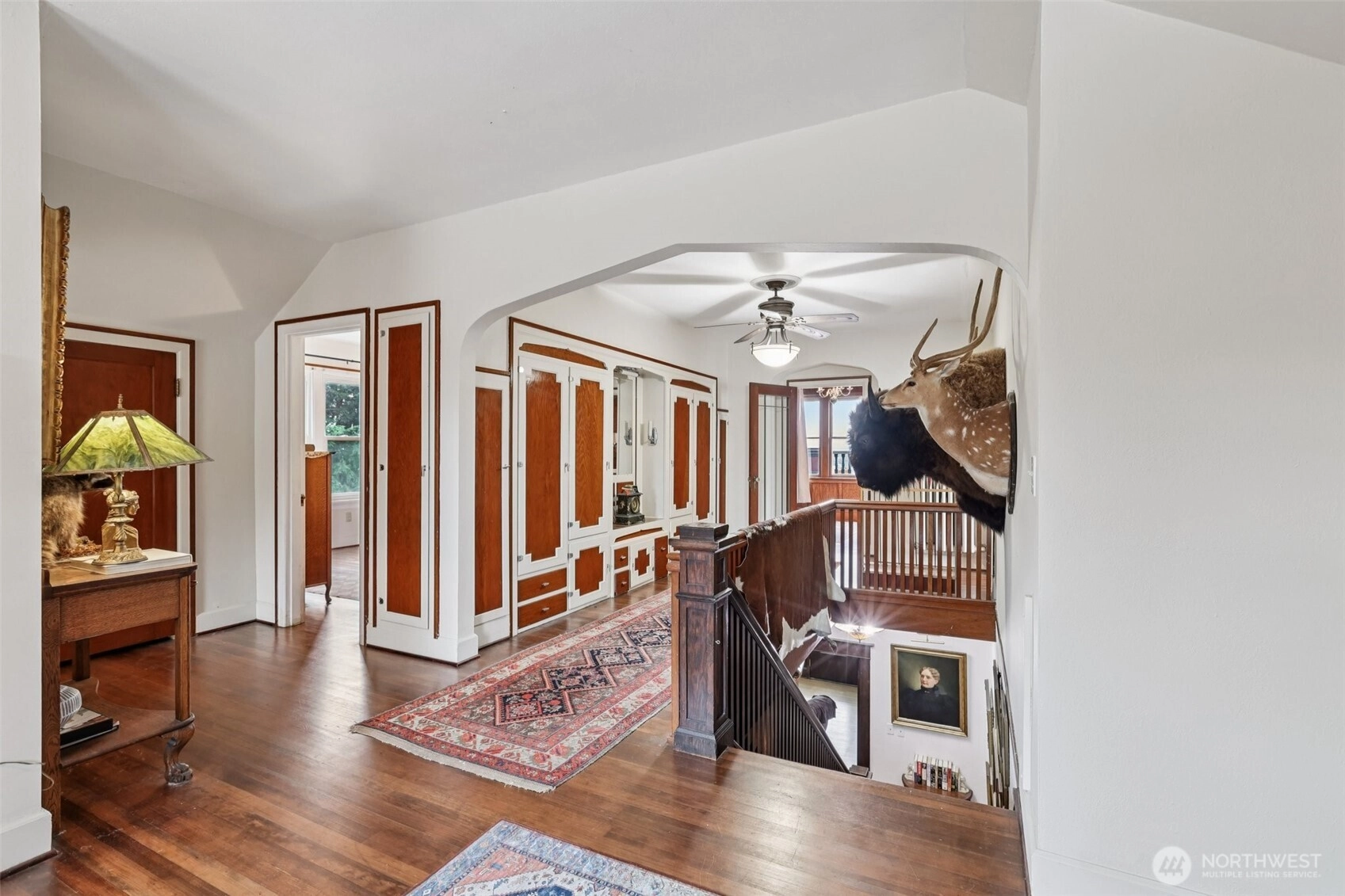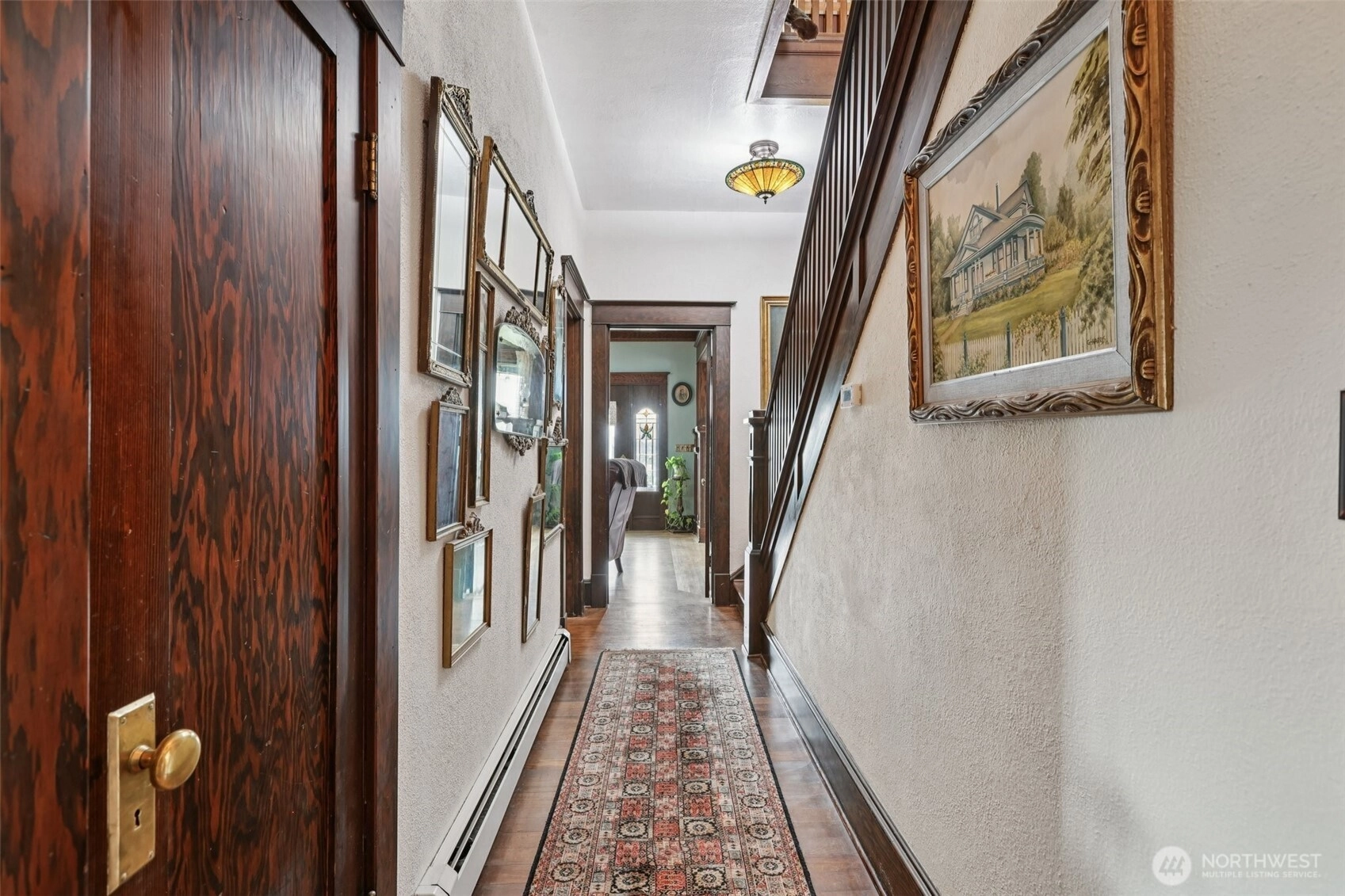 Perched gracefully on the hill, this 1918 historic manor tells a story of craftsmanship, care, and timeless elegance. From the moment you arrive, the wraparound porch invites slow mornings with coffee and sweeping territorial views. Inside, original fir floors, rich wood trim, and built-in cabinetry reflect over a century of thoughtful design. Sunlight filters through 100-year-old beveled windows, illuminating rare Steuben Glass light fixtures and preserved period details throughout. With four bedrooms and two baths, the home blends livability with legacy. Immaculately maintained and celebrated as a 2019 Stanwood newspaper cover feature, this is a rare opportunity to own a piece of history—beautifully lived in and lovingly preserved.