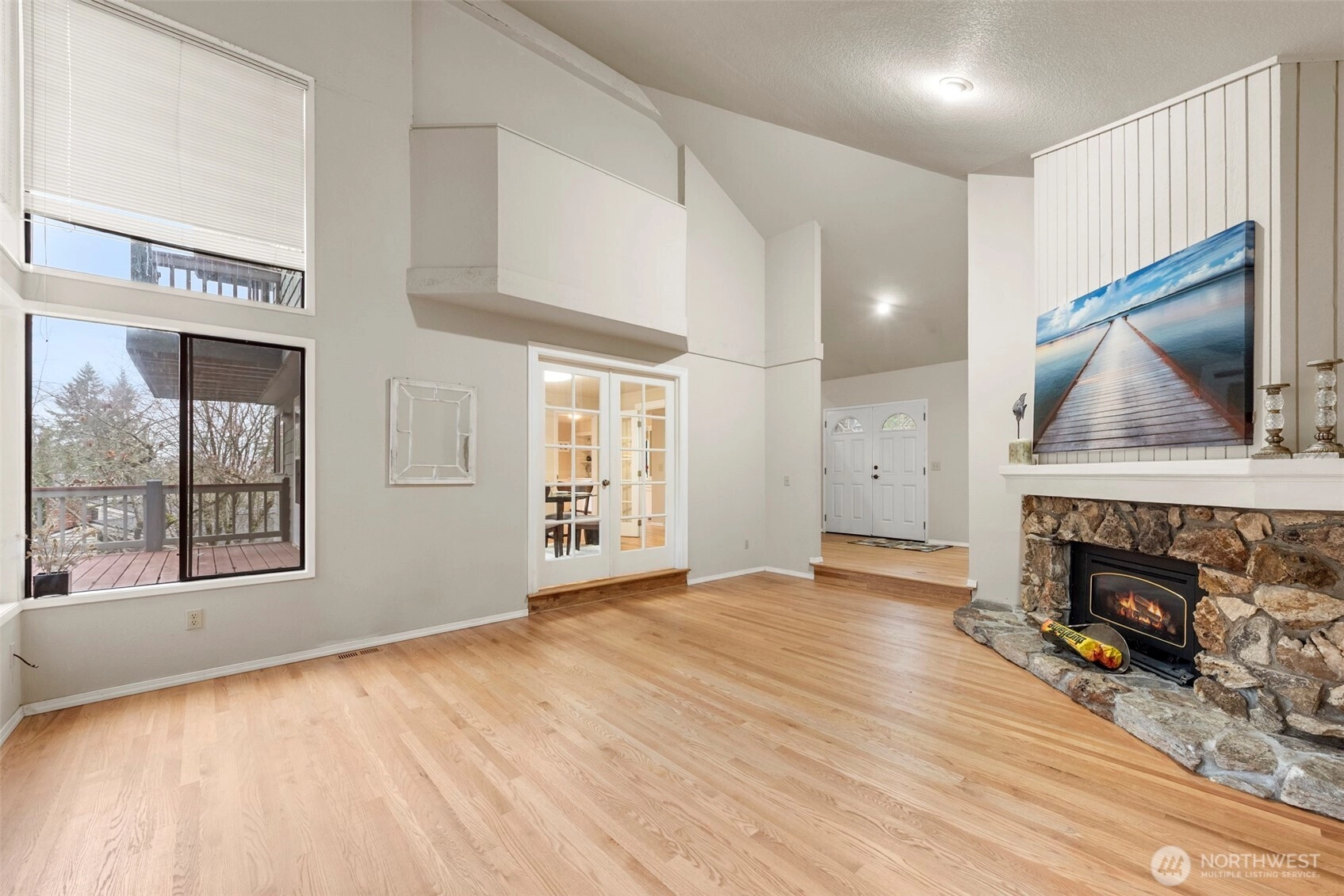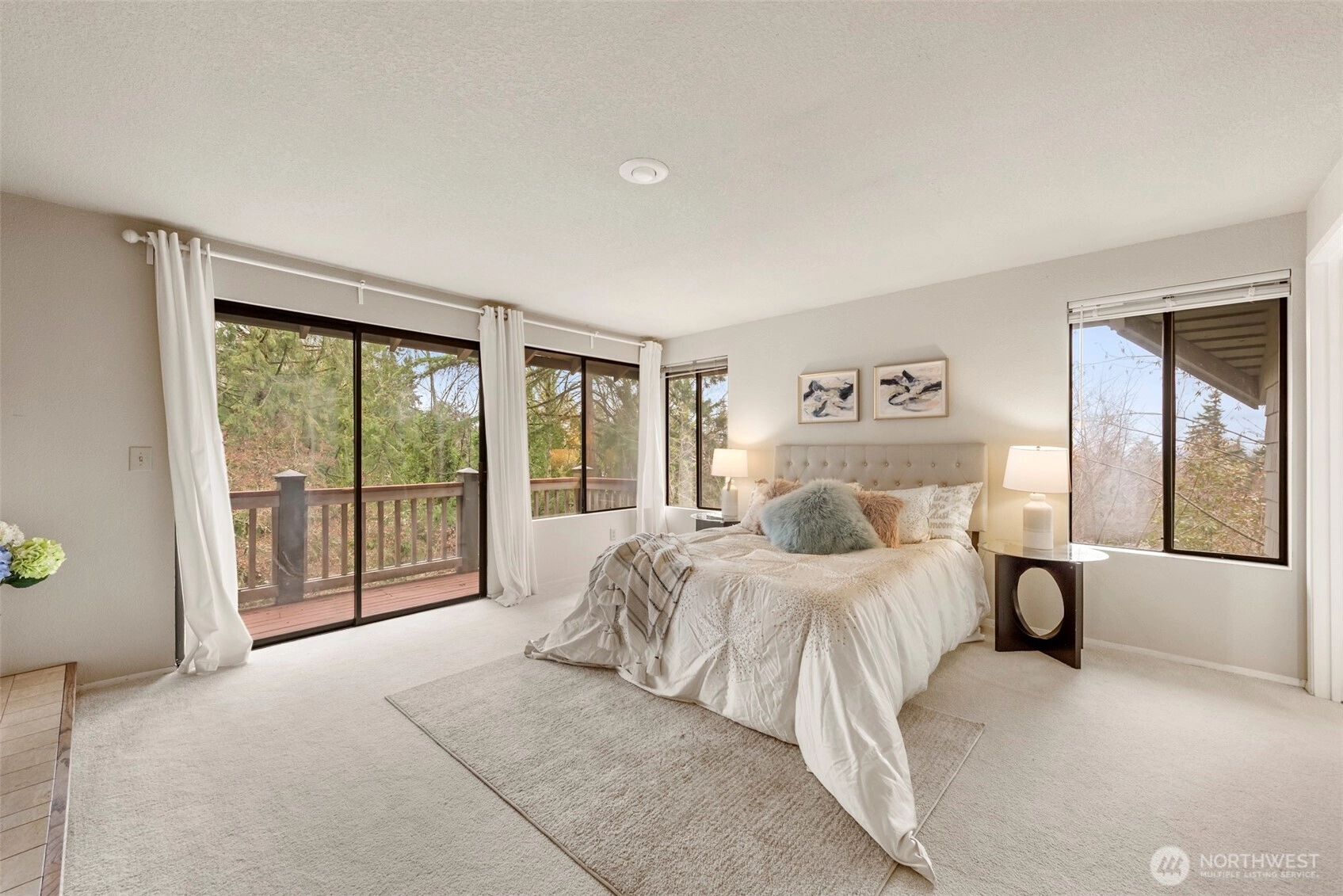 3 BDs 1 bonus RM, 2.5 BA contemporary home with large windows, supper private, adjacent to Whispering Heights. Updated open kitchen w/ large core counter & dinning space, wet bar. Recent updated SS appliances, new fridge in 2022, Blank new range, new furnace in 2024. Remodeled bathrooms, refinished and well maintained oak hardwood & lvp floor. Some territorial views, low maintenance level backyard w/ new fence, deck. Separate dining & high ceiling living RM. One fireplace at every floors. Upper floor has master suite and adjoining office or nursery RM , private deck. Lower level has two BDs 1 full bath, plus rec RM or third BD, laundry RM. Attached spacious 2 car garage with flat driveway, don't miss the additional approximately 400 sq ft secured storage room located above the garage, not included in the 2,740 sq ft reflected in public records. Mature landscaping. Convenient to I-90, 405, shops, park-n-ride. Bellevue School District (Spiritridge Elem, Tillicom Mid, Newport high)