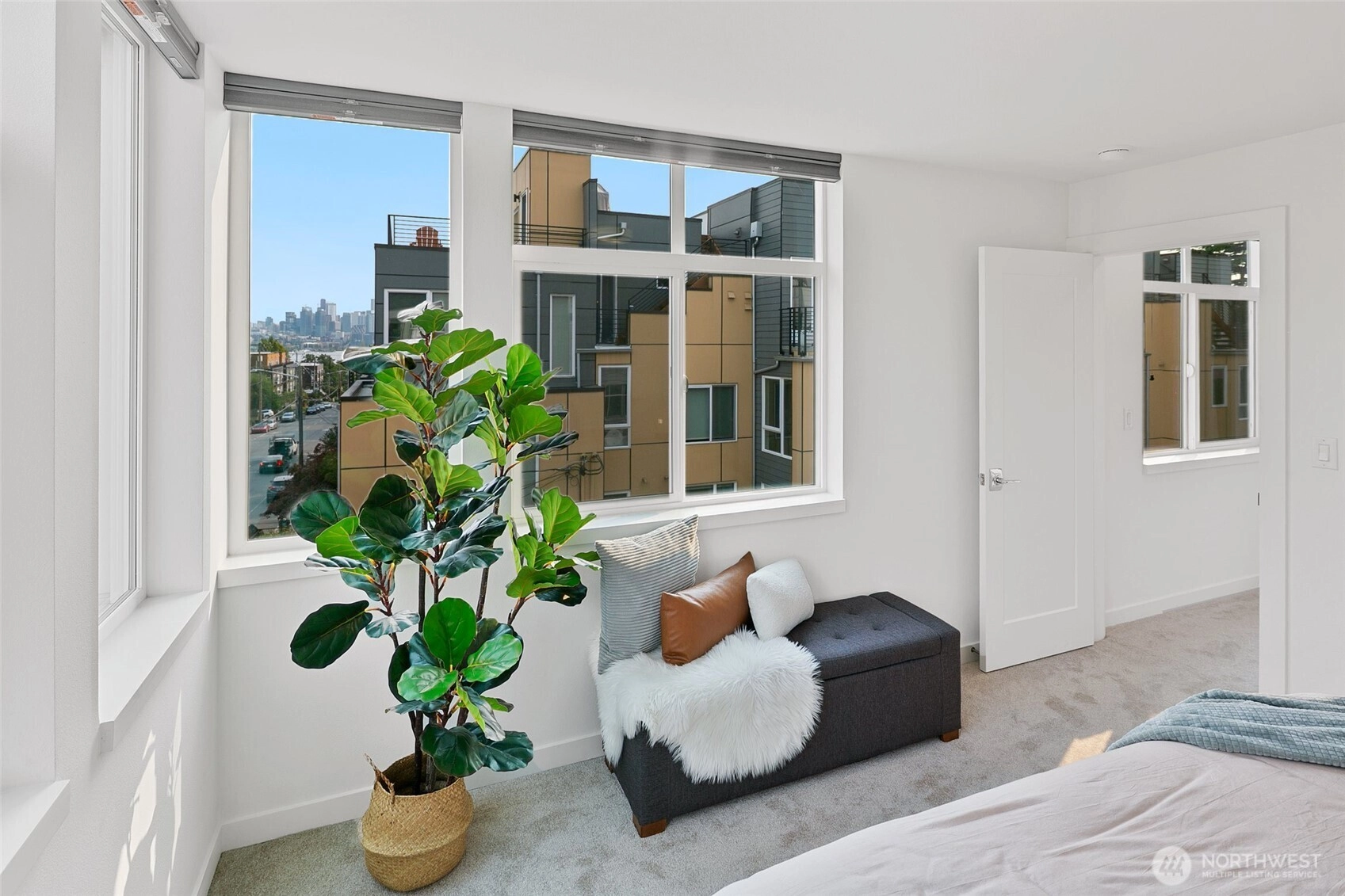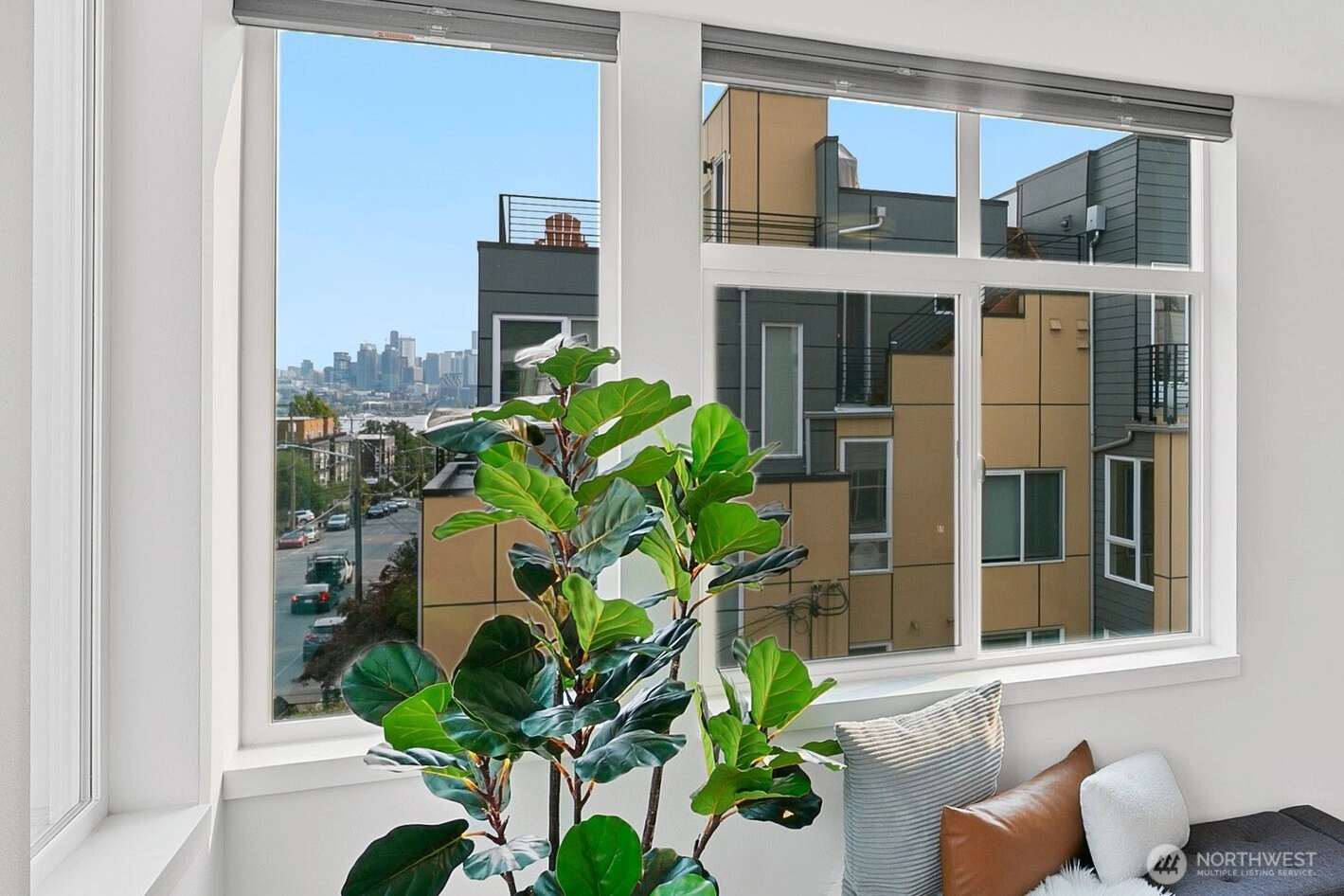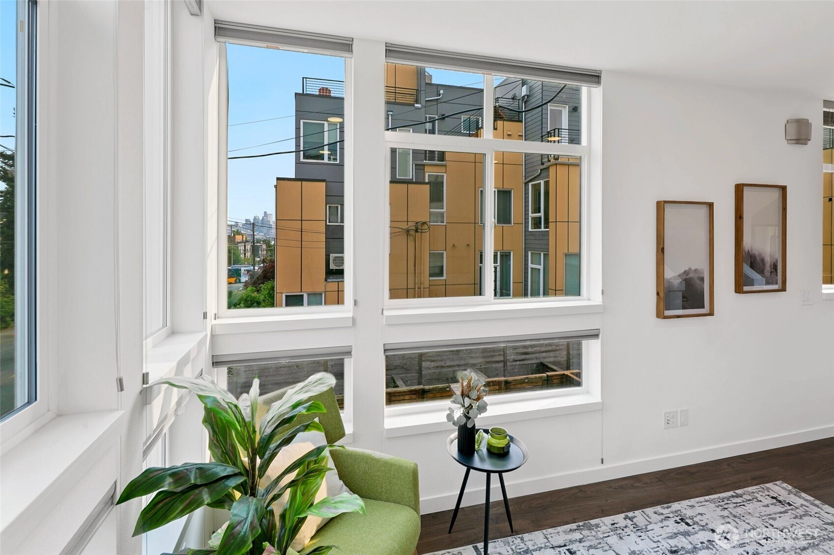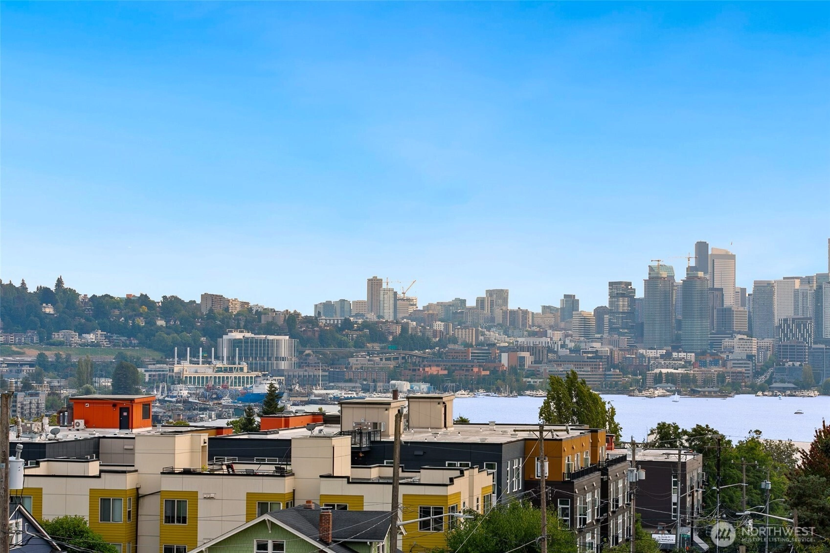 Perfectly positioned in the heart of Wallingford, this pristine end-unit home offers sweeping views of Downtown Seattle & Lake Union. South-facing & drenched in natural light, the home shines w/ all-new flooring, fresh interior paint, & custom blinds. The entry level features a spacious bedroom, full bath, & versatile den/office. The main level impresses w/ a generous living area, captivating city views + sleek kitchen w/ pantry & dining. The top floor hosts a luxe primary VIEW suite w/ large WI closet & en-suite bath. Retreat to the expansive rooftop deck, upgraded w/ new decking & take in iconic panoramas of Mt Rainier, Lake Union, & the sparkling skyline. With no HOA, gated parking & unmatched walkability, this home is truly exceptional.