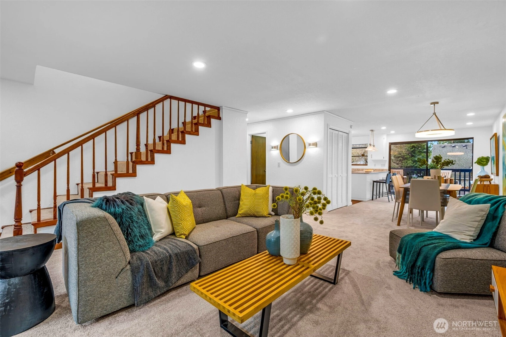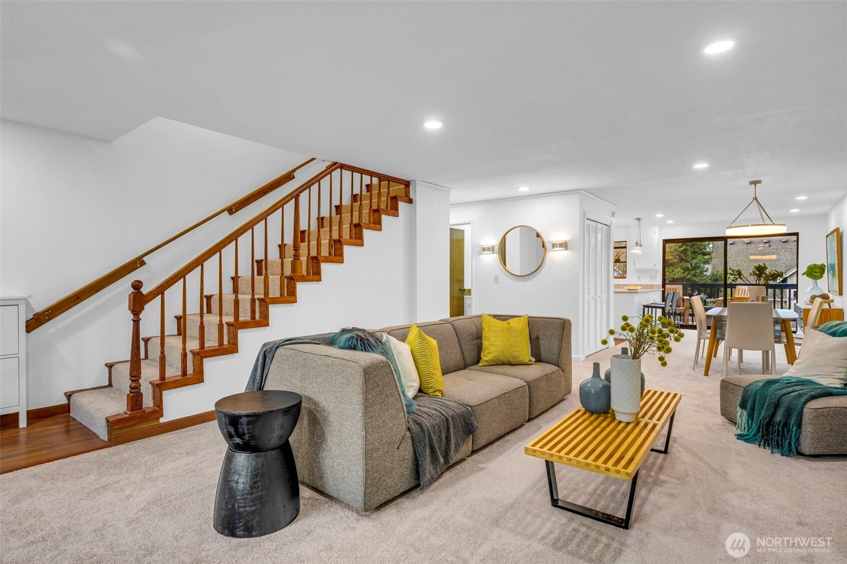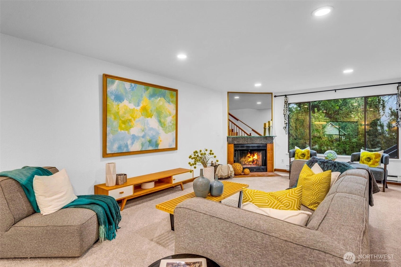 Tucked off N 175th—away from the traffic—this serene 3-level townhome-style condo offers the privacy of a single-family home in a peaceful, park-like setting surrounded by mature trees. With 1,728 sq ft of impeccably maintained, move-in-ready space, this is condo living without compromise. The open-concept main level welcomes you with a spacious living room and cozy wood-burning fireplace, dedicated dining area, powder room, and a beautifully remodeled kitchen featuring quartz countertops, custom tile work, and newer appliances. Fresh carpet on the main and lower levels adds warmth and comfort. Upstairs, the generous primary suite includes dual closets and an updated ensuite bath, plus a second bedroom and full guest bath. The versatile lower level offers a third bedroom or bonus family room with direct access to your private 2-car garage—an uncommon luxury in condo living. Step outside to a large deck overlooking tranquil green space—perfect for summer entertaining. Energy-efficient zone heating, newer hot water tank, and major exterior updates completed in 2023 (roof, paint, decks, parking lot) offer peace of mind. No current or upcoming assessments. Located on a quiet, landscaped lane in the award-winning Shoreline School District, just minutes to light rail, I-5, and everyday conveniences like Trader Joe's. HOA covers water, sewer, garbage, and yard maintenance. Rare. Spacious. Effortless. Don’t miss it.
