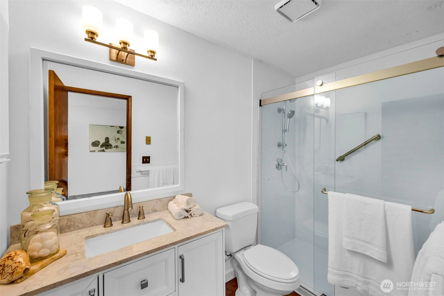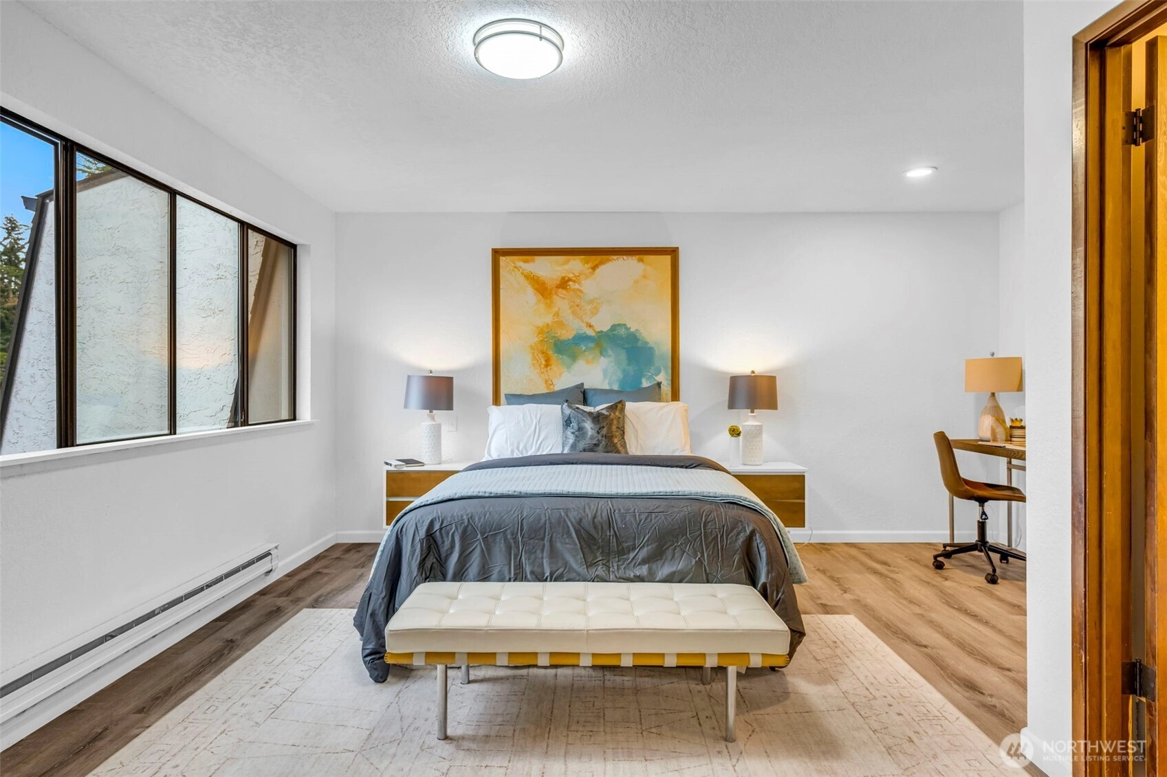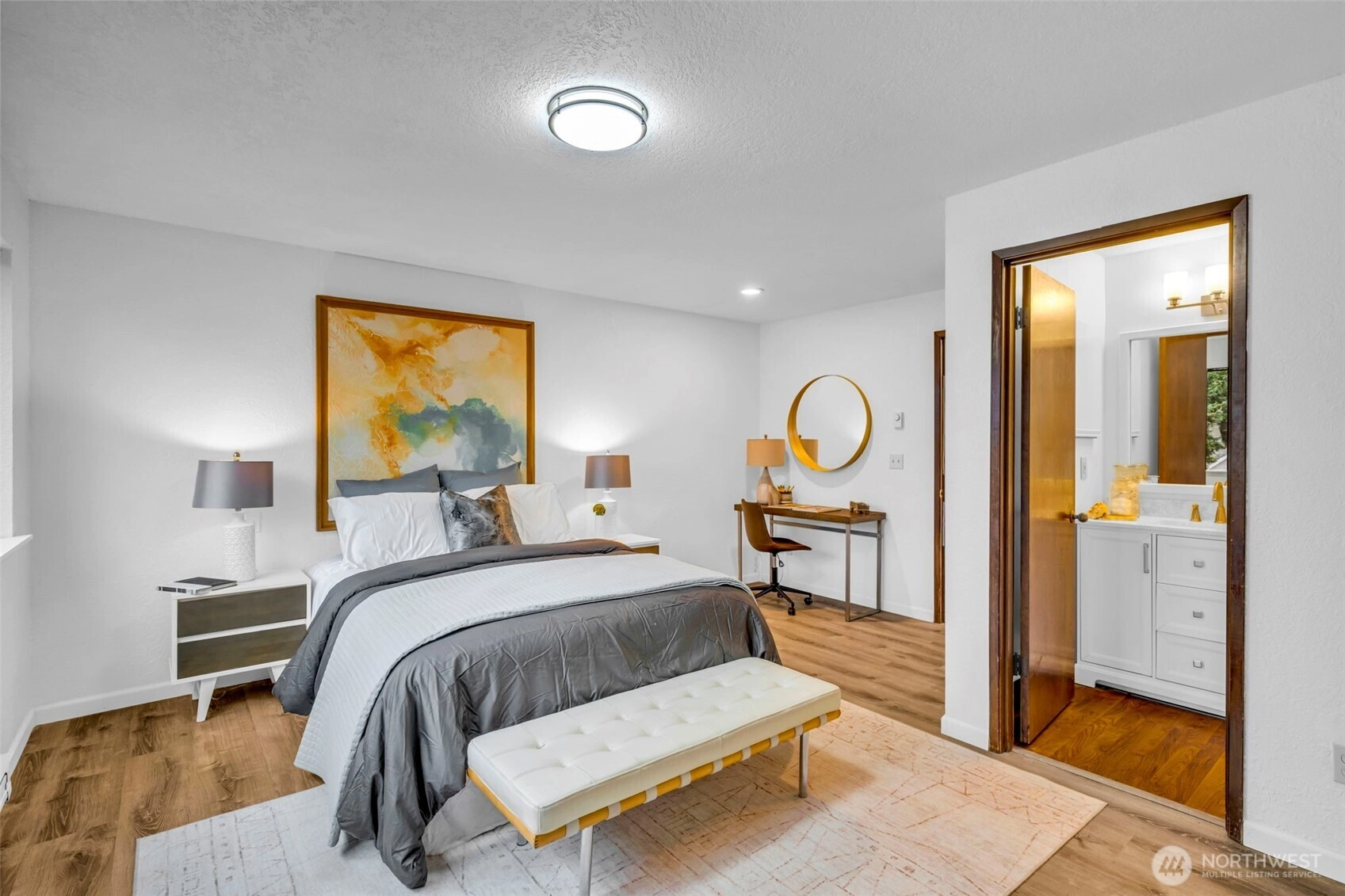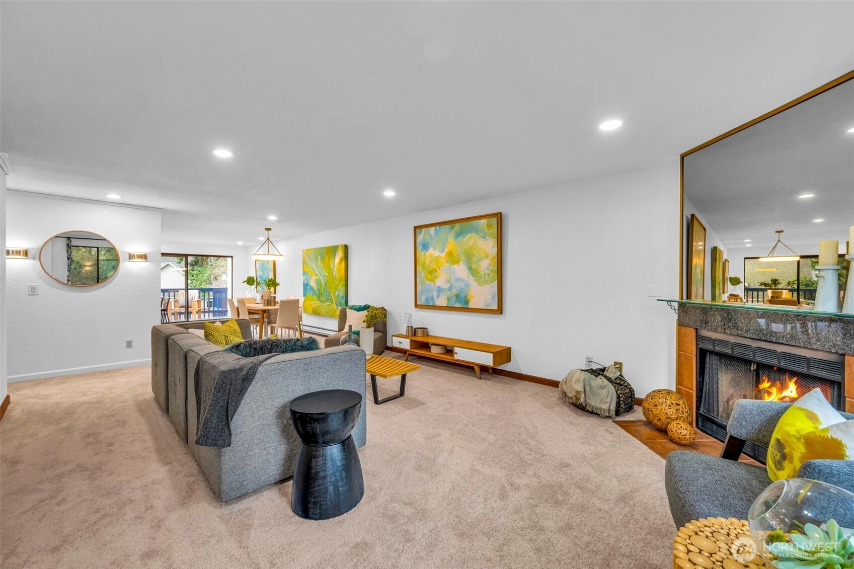 Tucked off N 175th—away from the traffic—this serene 3-level townhome-style condo offers the privacy of a single-family home in a peaceful, park-like setting surrounded by mature trees. With 1,728 sq ft of impeccably maintained, move-in-ready space, this is condo living without compromise. The open-concept main level welcomes you with a spacious living room and cozy wood-burning fireplace, dedicated dining area, powder room, and a beautifully remodeled kitchen featuring quartz countertops, custom tile work, and newer appliances. Fresh carpet on the main and lower levels adds warmth and comfort. Upstairs, the generous primary suite includes dual closets and an updated ensuite bath, plus a second bedroom and full guest bath. The versatile lower level offers a third bedroom or bonus family room with direct access to your private 2-car garage—an uncommon luxury in condo living. Step outside to a large deck overlooking tranquil green space—perfect for summer entertaining. Energy-efficient zone heating, newer hot water tank, and major exterior updates completed in 2023 (roof, paint, decks, parking lot) offer peace of mind. No current or upcoming assessments. Located on a quiet, landscaped lane in the award-winning Shoreline School District, just minutes to light rail, I-5, and everyday conveniences like Trader Joe's. HOA covers water, sewer, garbage, and yard maintenance. Rare. Spacious. Effortless. Don’t miss it.