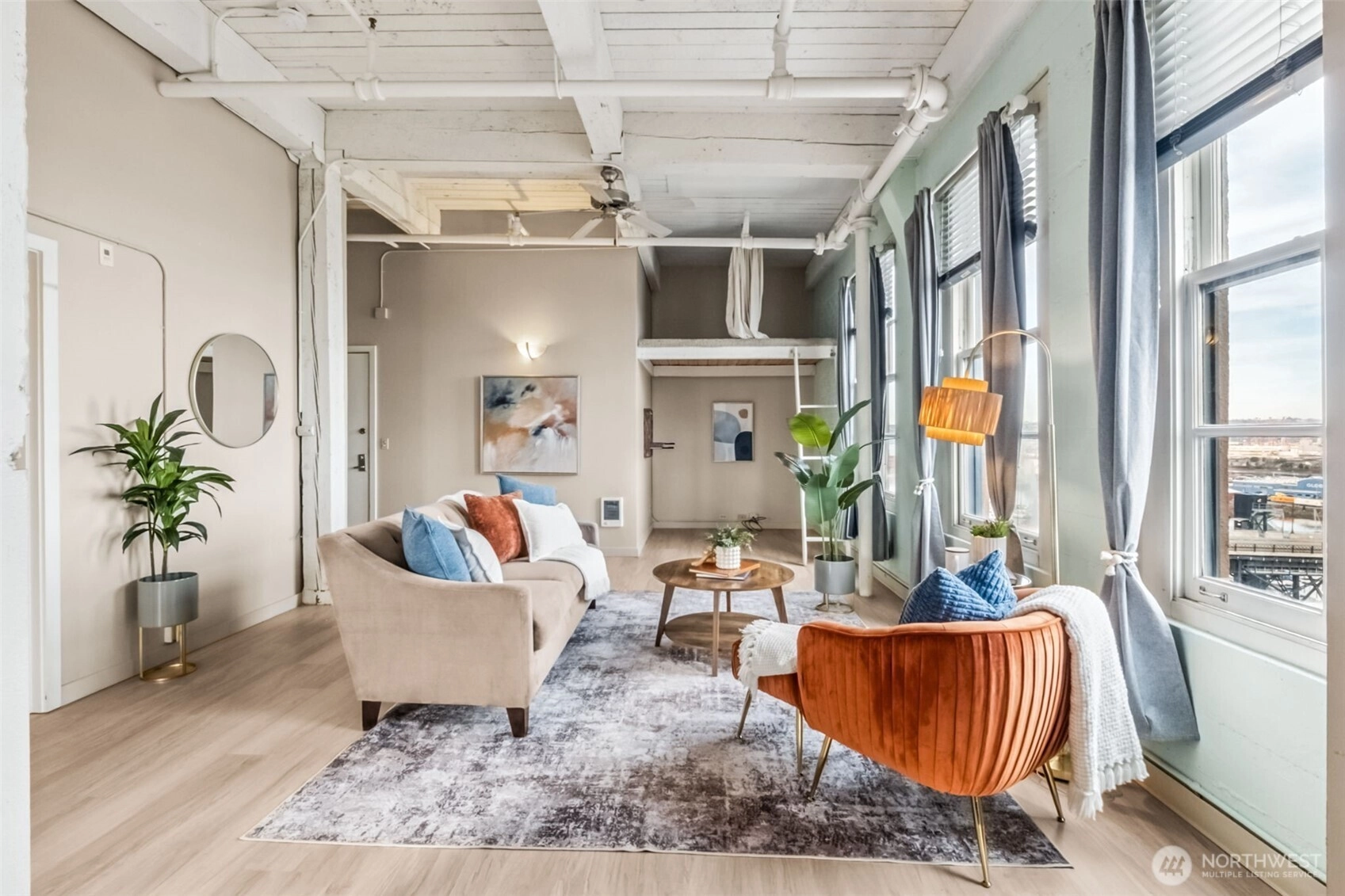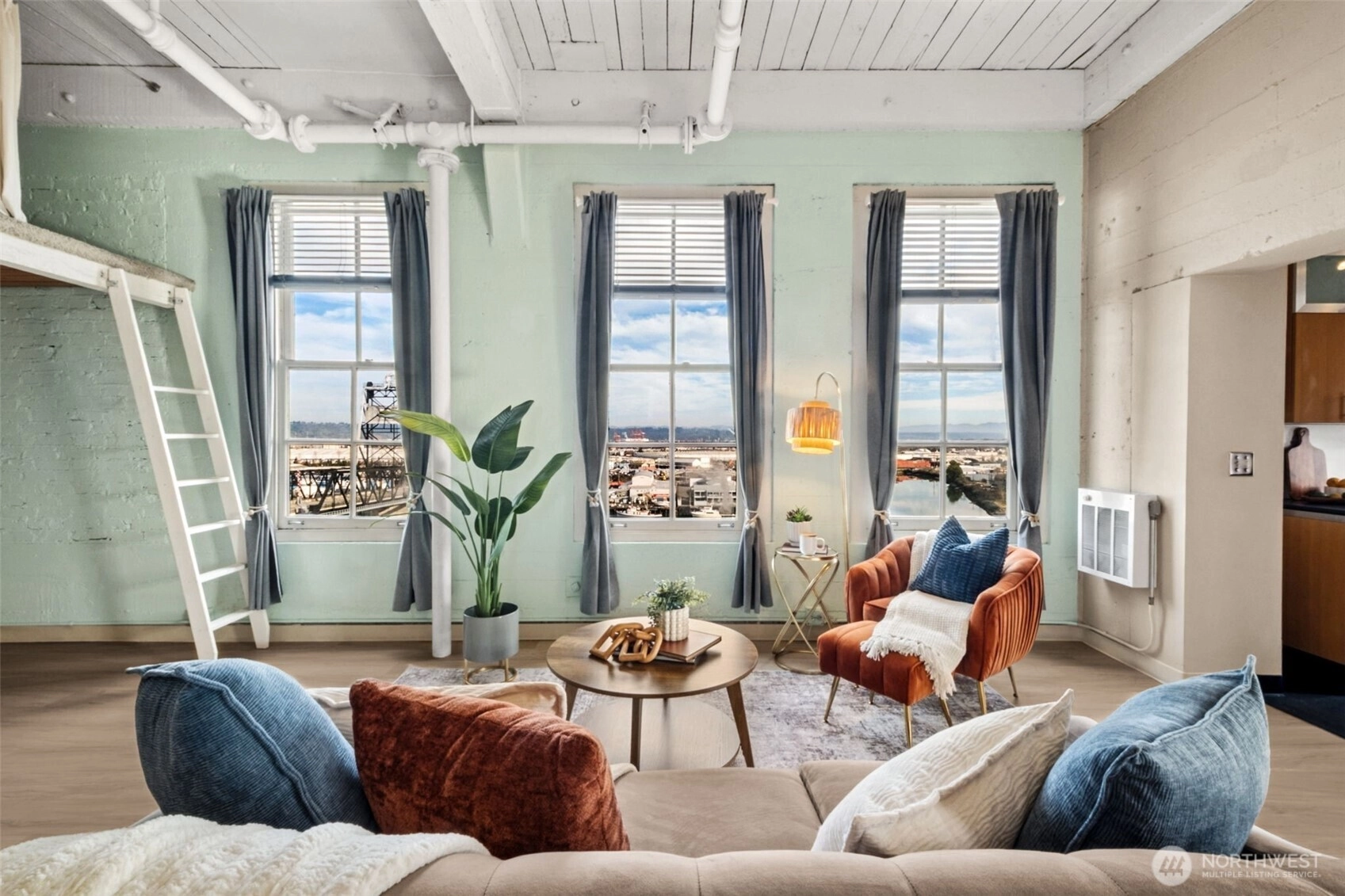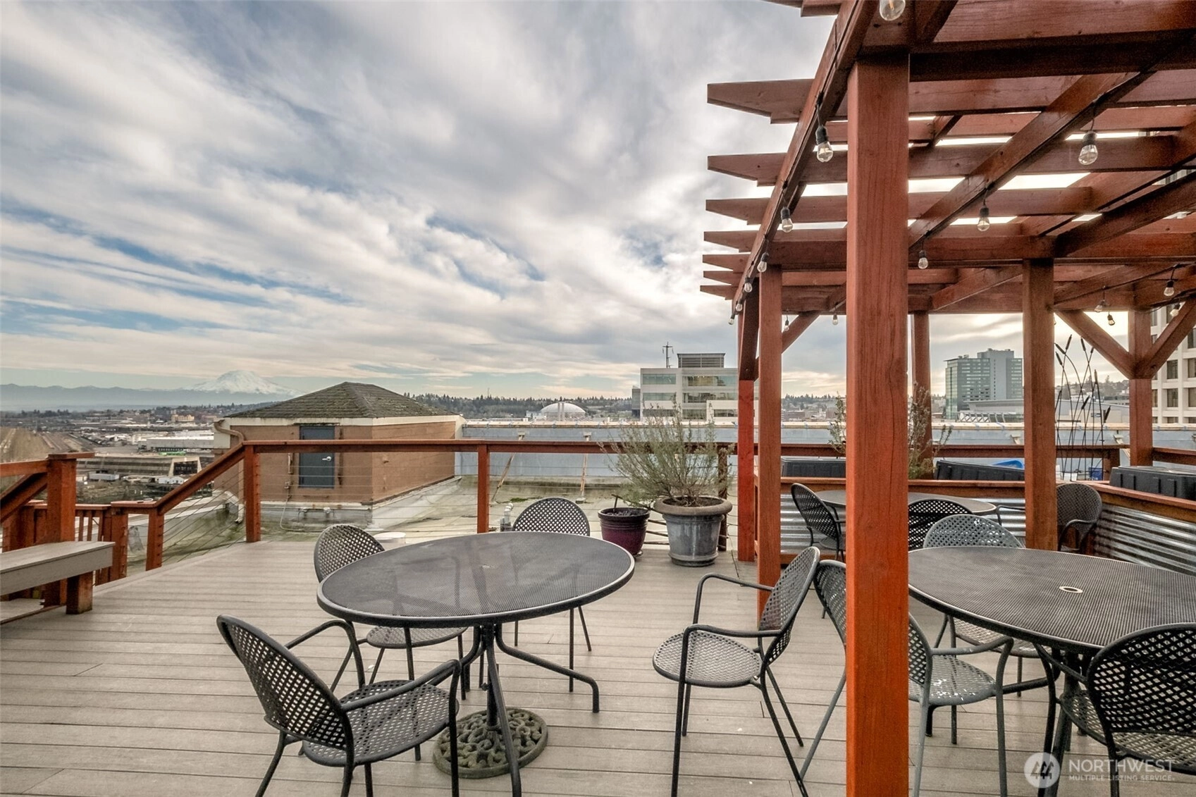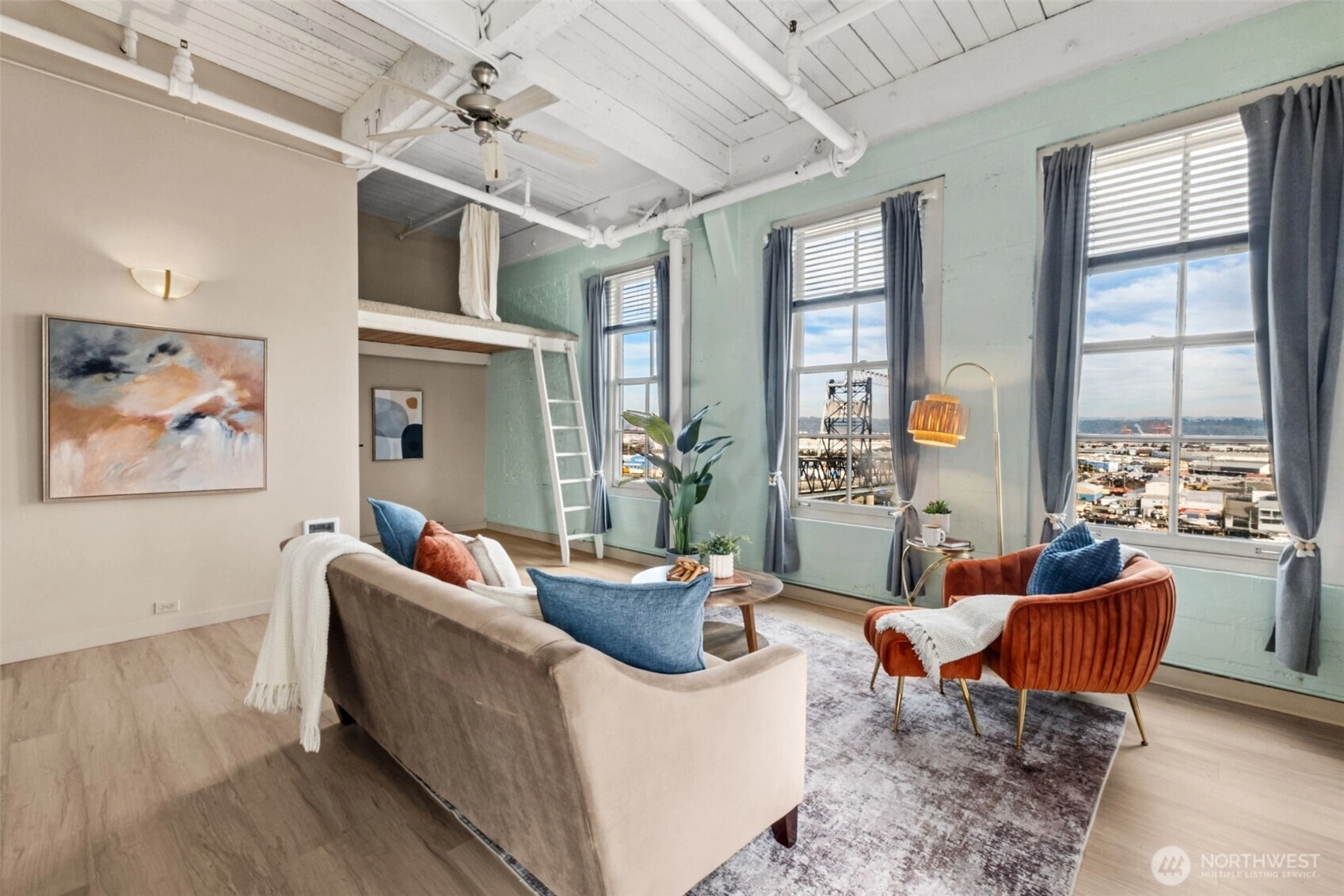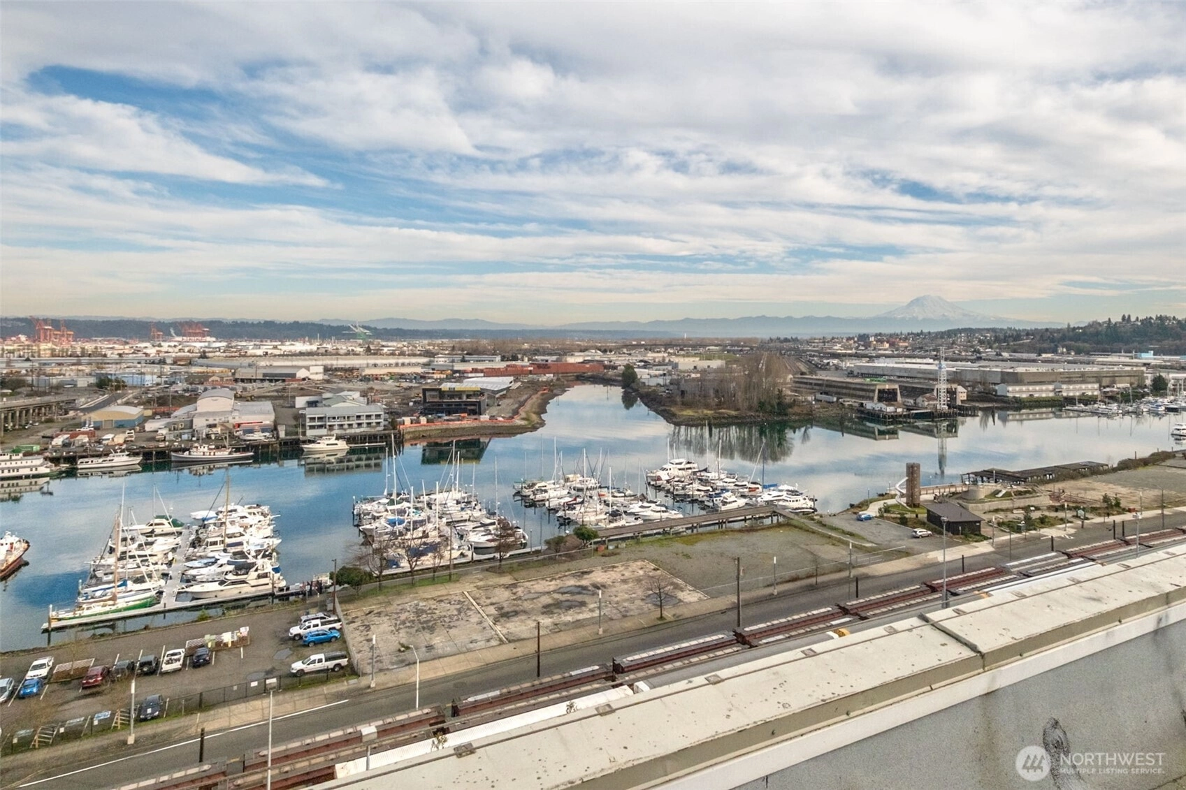This top-floor penthouse at historic Cliff Street Lofts offers spectacular, unobstructed views of Mount Rainier, the Thea Foss Waterway, and the city skyline. The open-concept layout is among the premier units in the building, featuring a bank of six floor-to-ceiling windows, 14ft ceilings and premium plank flooring that create a bright, refined living environment. The contemporary kitchen includes a distinctive industrial touch with original freight elevator up/down buttons integrated into the design. A spacious bedroom captures mountain views. Building amenities include secure premium owned garage parking near the entrance, a private storage locker, laundry facilities, and a Roof-top deck with panoramic views & barbecue area, and garden space. Nearby highlights include the University of Washington Tacoma campus, Museum of Glass, Tacoma Art Museum, the Thea Foss Waterway, Point Ruston, and Point Defiance Park. Transit access includes the Tacoma Link Light Rail. Move-in ready.