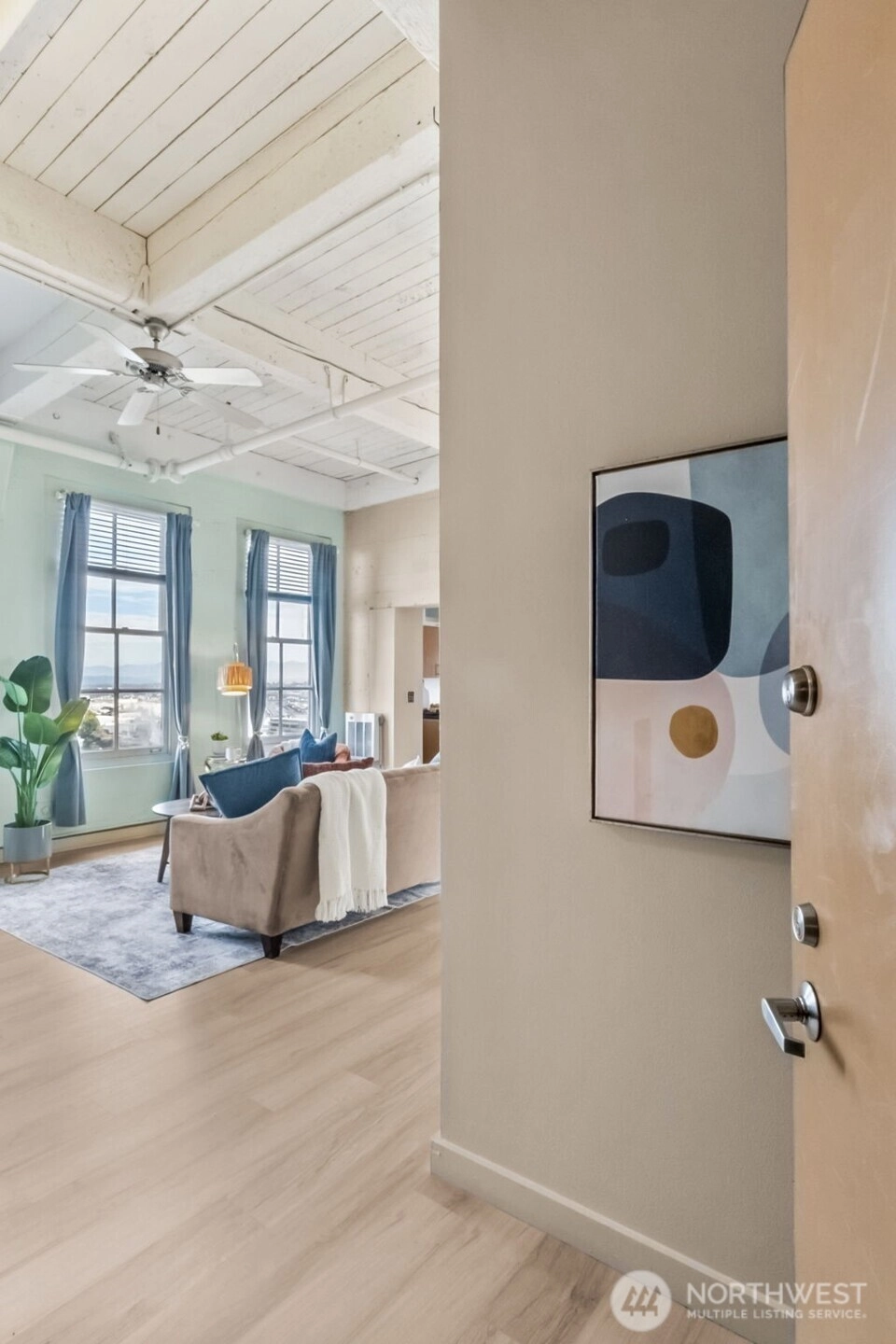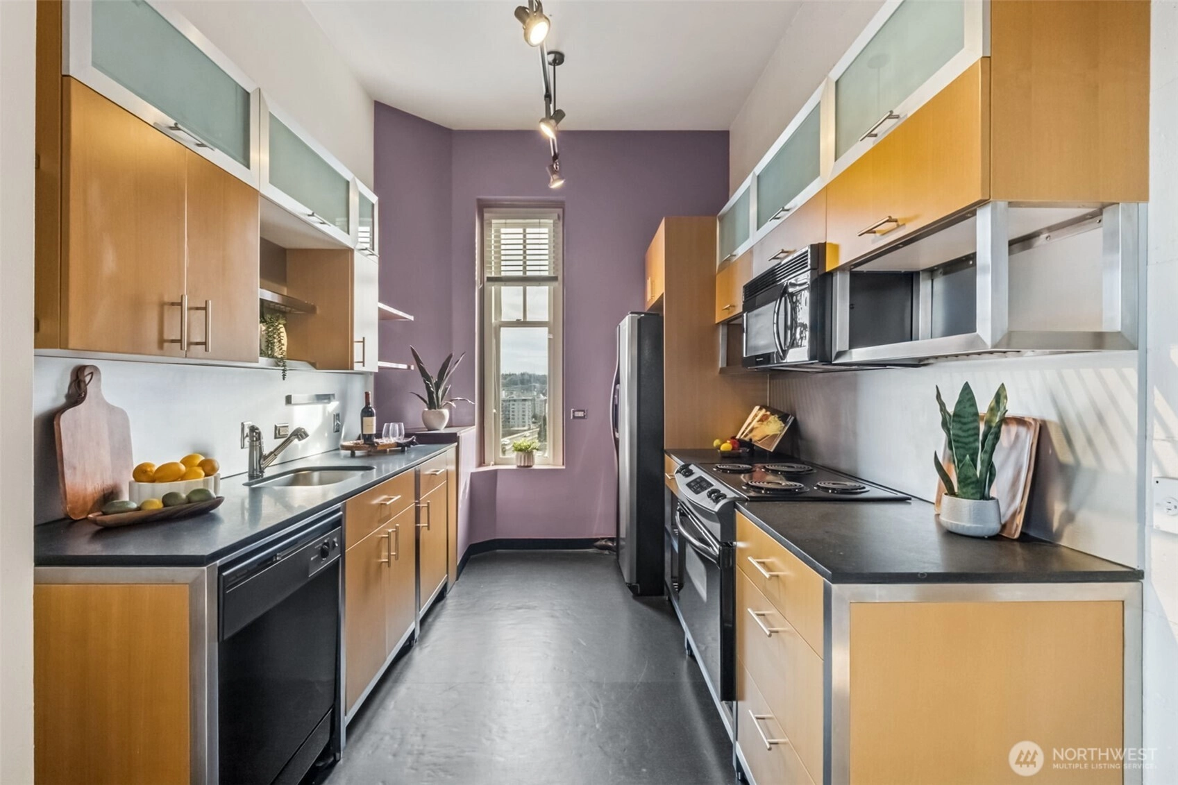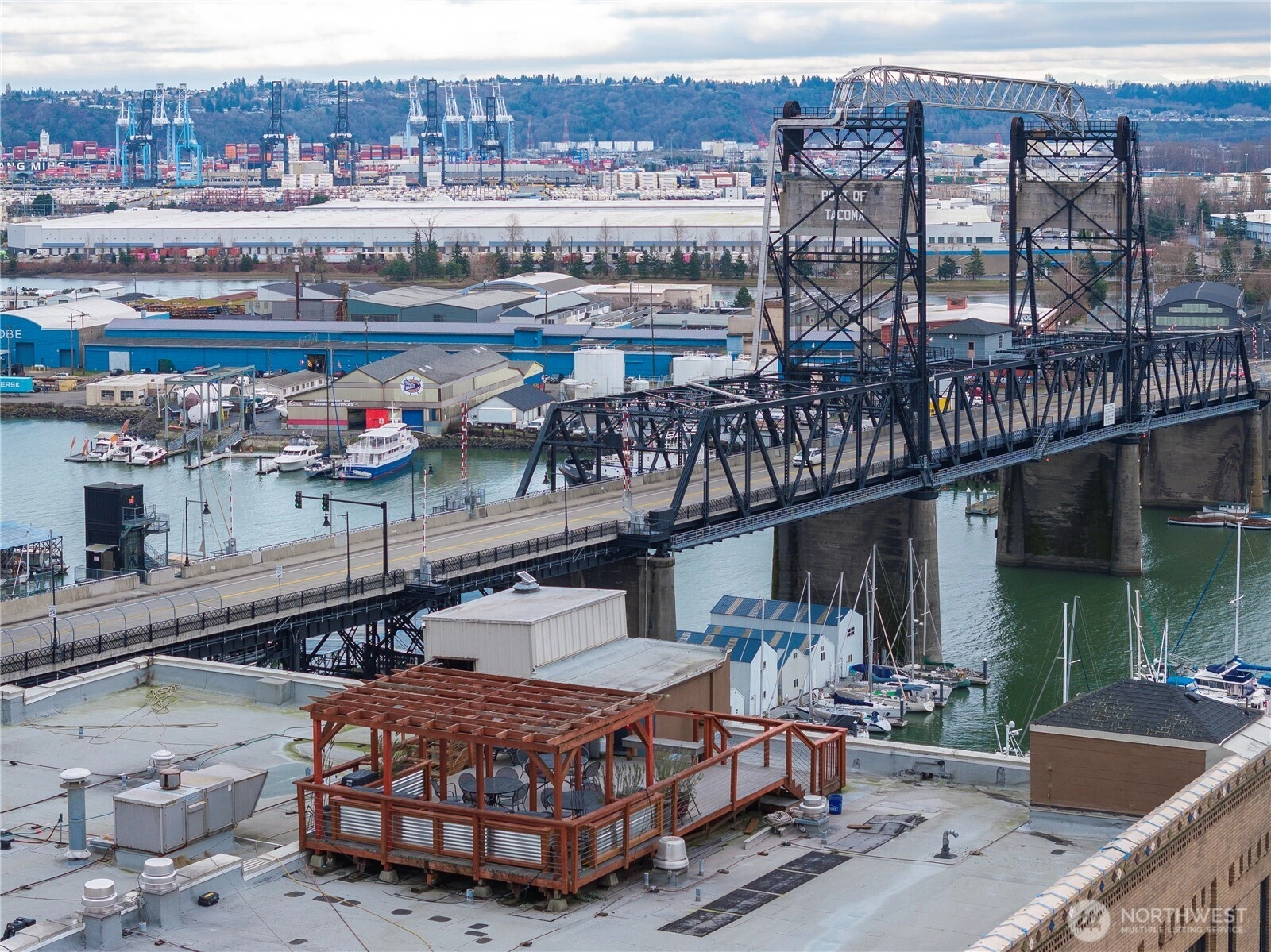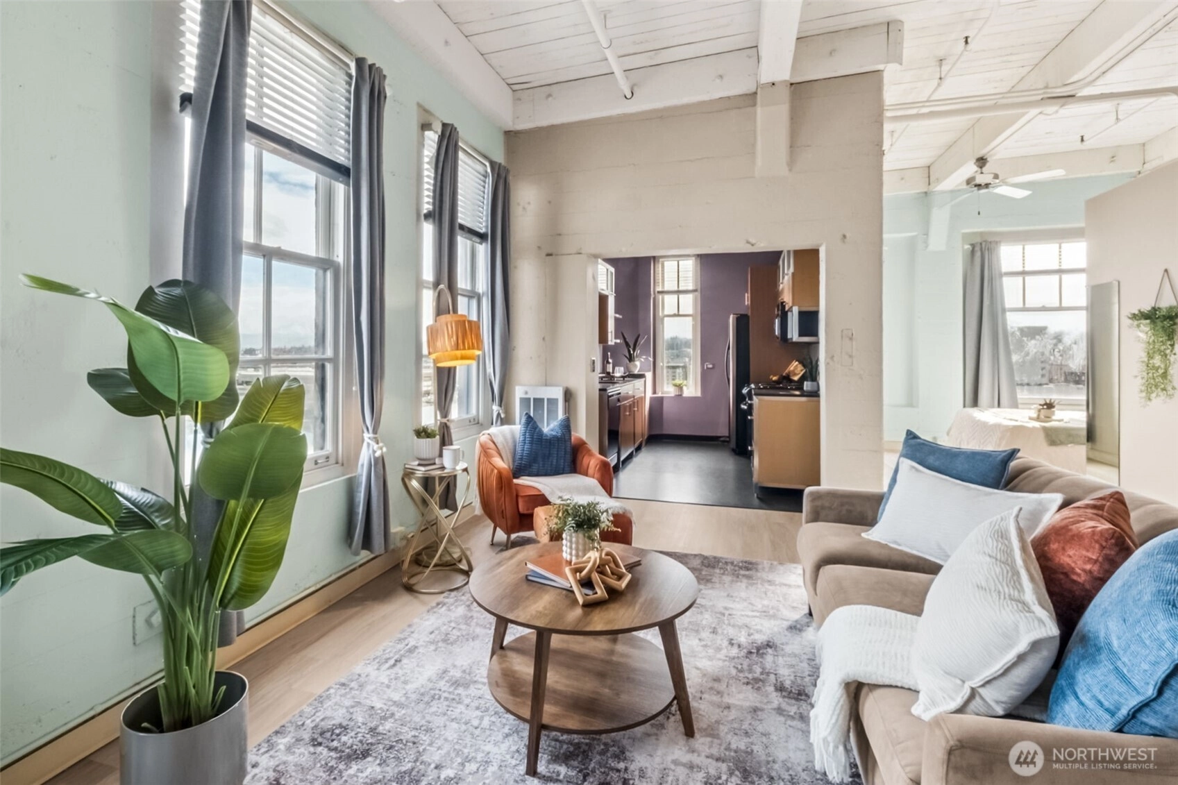 This top-floor penthouse at historic Cliff Street Lofts offers spectacular, unobstructed views of Mount Rainier, the Thea Foss Waterway, and the city skyline. The open-concept layout is among the premier units in the building, featuring a bank of six floor-to-ceiling windows, 14ft ceilings and premium plank flooring that create a bright, refined living environment. The contemporary kitchen includes a distinctive industrial touch with original freight elevator up/down buttons integrated into the design. A spacious bedroom captures mountain views. Building amenities include secure premium owned garage parking near the entrance, a private storage locker, laundry facilities, and a Roof-top deck with panoramic views & barbecue area, and garden space. Nearby highlights include the University of Washington Tacoma campus, Museum of Glass, Tacoma Art Museum, the Thea Foss Waterway, Point Ruston, and Point Defiance Park. Transit access includes the Tacoma Link Light Rail. Move-in ready.