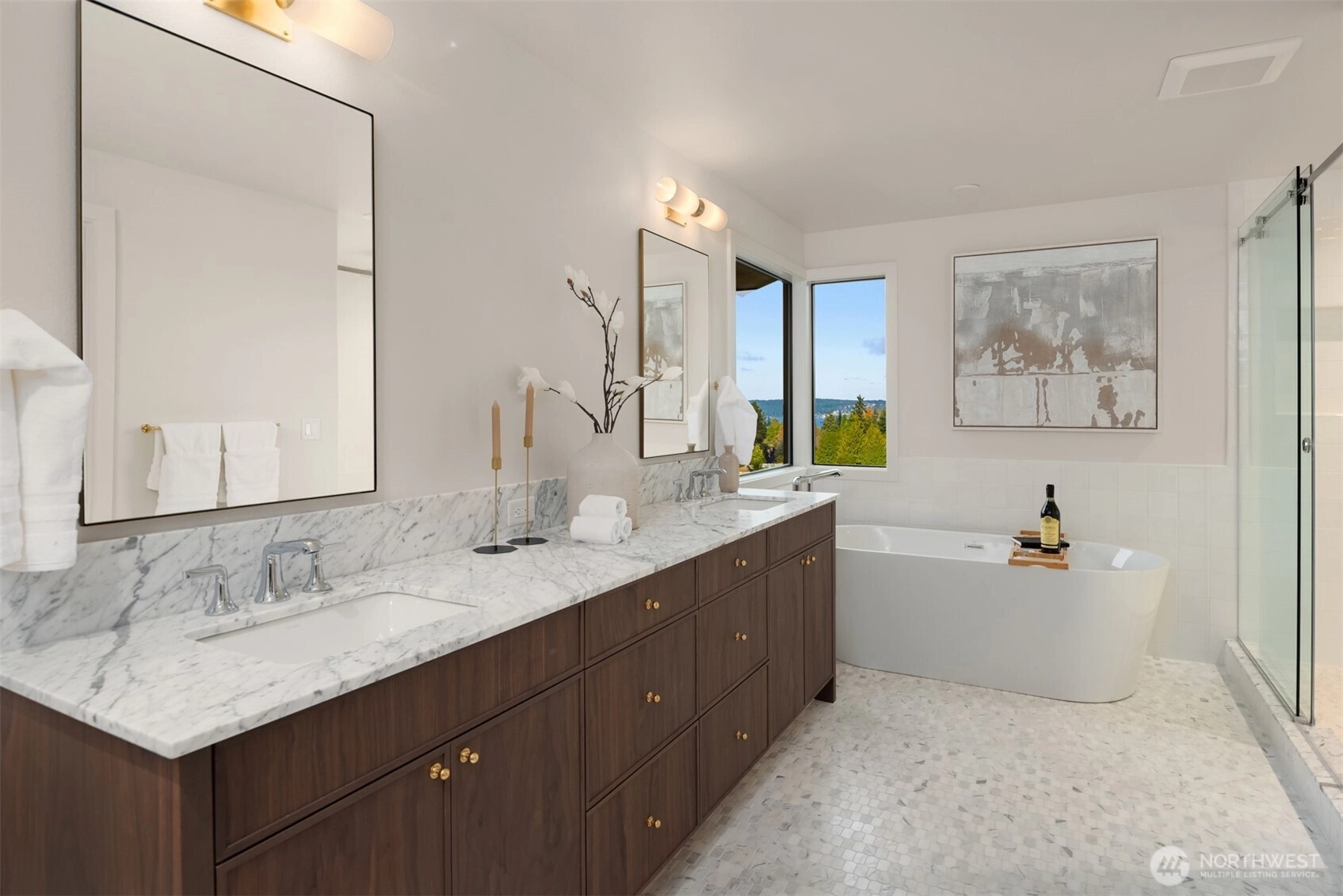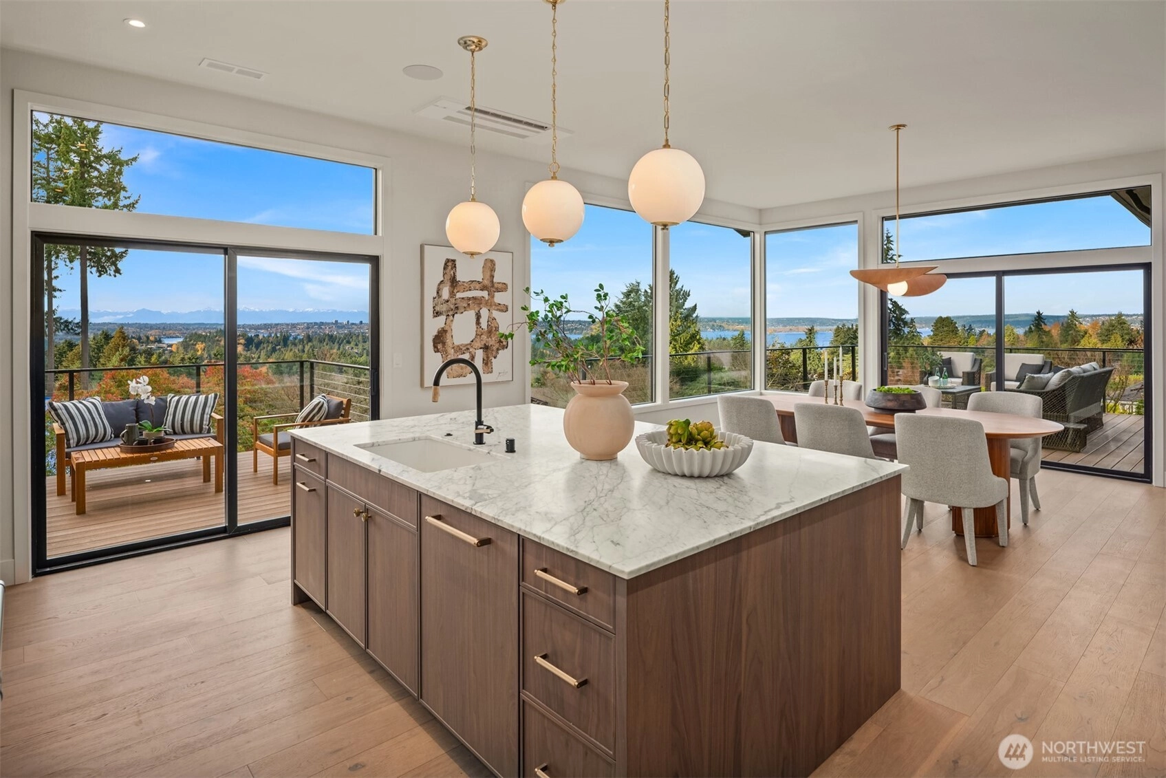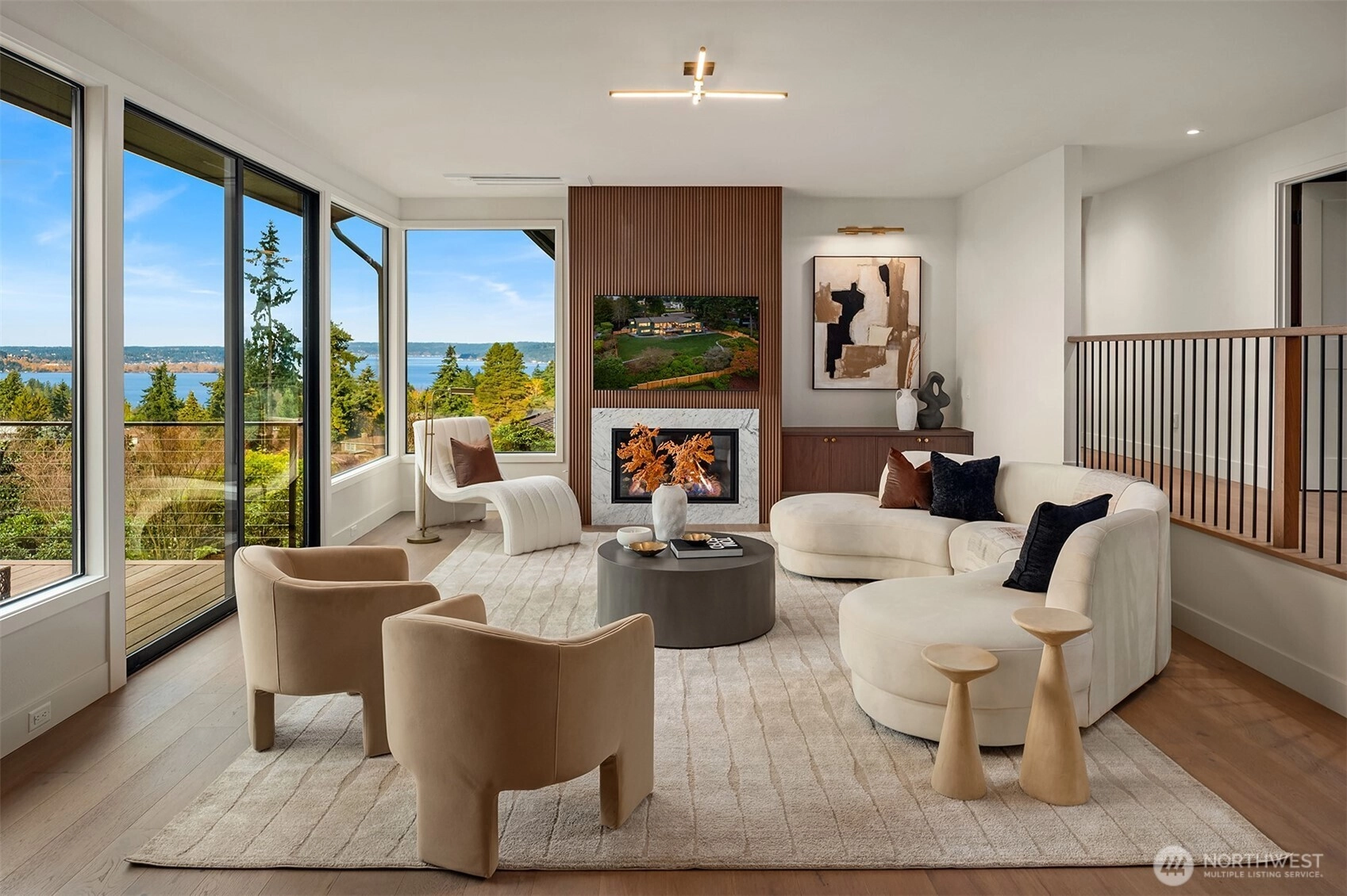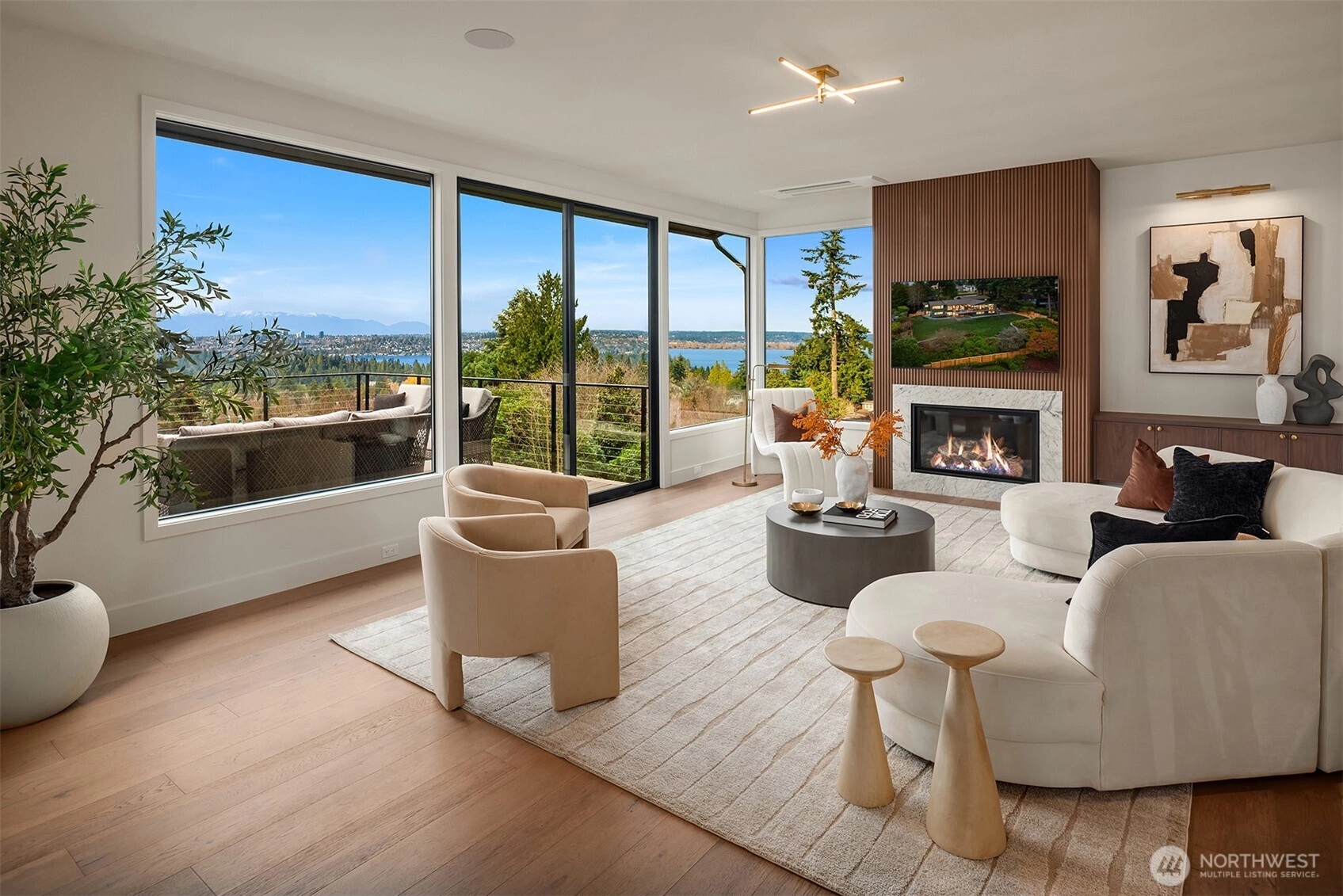 Signature Clyde Hill residence boasts breathtaking panoramic views at the pinnacle of the coveted Aqua Vista community. This exquisite property has been completely reimagined with a whole-house luxury remodel by acclaimed local builder Gerry Homes. Walls of glass frame unrivaled views, illuminating a home loaded with sophisticated fixtures & bespoke finishes that embody a sense of timeless elegance. The sundrenched interior offers open concept living spaces designed for effortless entertaining including a chef’s epicurean kitchen with massive slabs of Carrera marble, custom cabinetry & a luxury Subzero/Wolf appliance package. The sumptuous primary suite is conveniently located on the main level, providing a seamless transition from public entertainment spaces to private living quarters. The expansive lower level provides 4 additional bedrooms including a luxurious guest suite, home gym/flex room & large bonus room perfect for informal gatherings. Expertly sited at the peak of a large 20,000+ SF lot, this one-of-a-kind residence features the rare combination of exceptional privacy and unrivaled westerly views including sweeping vistas of Lake WA, the Seattle skyline, Husky Stadium, the Olympic Mountains & breathtaking sunsets. Incredible location just blocks from the award-winning Clyde Hill Elementary School, mins from vibrant downtown Bellevue, with easy access to SR-520 & Seattle… A truly rare offering for the discerning luxury buyer searching for that “Forever” view home!